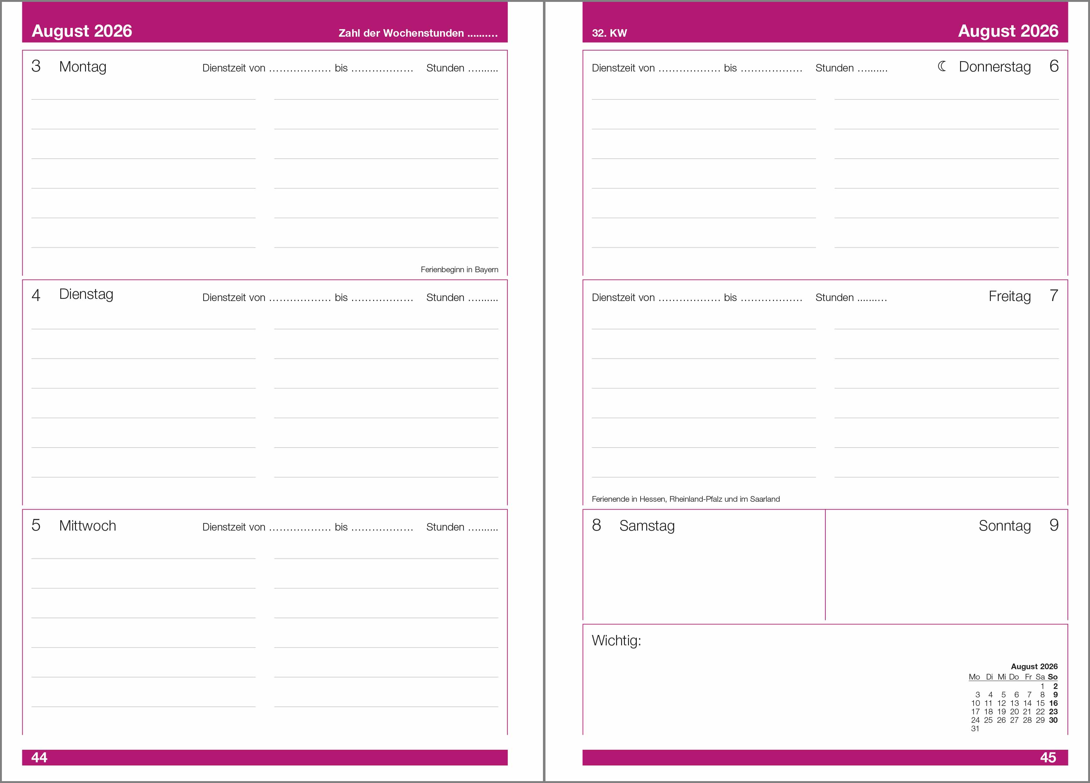 Ein Tischkalender ist prima, doch viel besser ist ein Tischkalender für das jeweilige Schuljahr. Auf dem Schreibtisch oder dem Küchentisch, neben dem Telefon, zu Hause oder im Dienst, egal wie, immer präsent. Der Kalenderwechsel findet im Sommerloch statt. Die Seitenabfolge im Einzelnen:Wichtige Rufnummern,Schulferien,Regionale Feiertage,Dienstplan,Stundenplan,Schuljahresübersicht,Projekte im Schuljahr,Monatsübersichten Juli bis Dezember im Folgejahr (18 Monate),Wochen ab Juli bis August im Folgejahr, die Woche hat auf 2 Seiten reichlich Platz,Umrechnung von Noten in Punkte,Verliehenes,Seiten neutrale Notizen,Wichtige Anschriften,Postentgelte.Im Abonnement verfügbar. Das hat viele Vorteile für Sie: Sie erhalten die Ausgabe für das kommende Schuljahr frühzeitig [März/April)nach Hause geliefert und Sie sparen die Versandkosten. Im Shop Service unter Abonnenten-Verwaltung liegt ein Bestellschein für Sie bereit.Anregungen zu diesem Kalender sind immer willkommen.