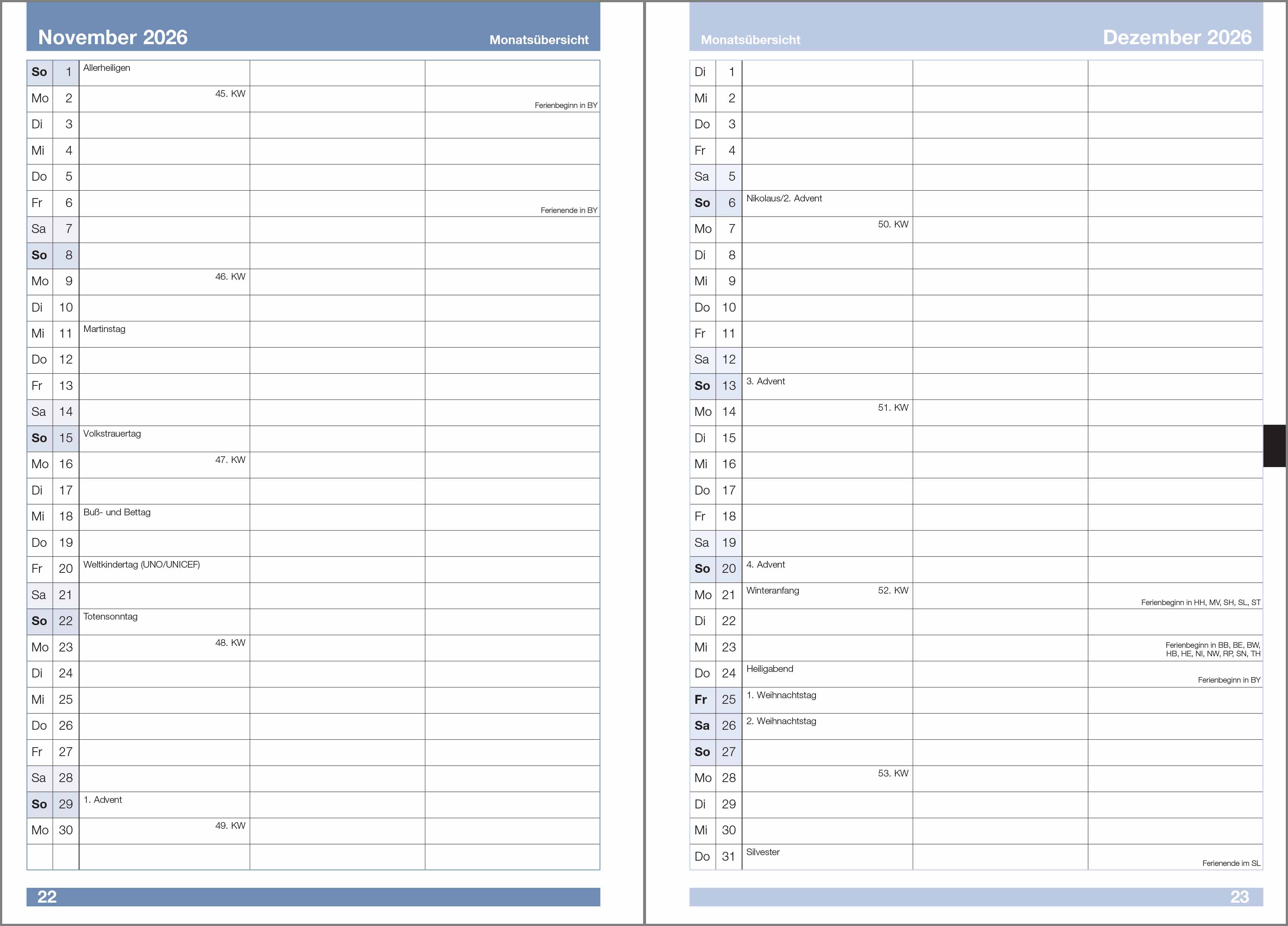Schulwochen ab Juli bis August im Folgejahr, die Tage der Woche sind in horizontalen Feldern dargestellt,