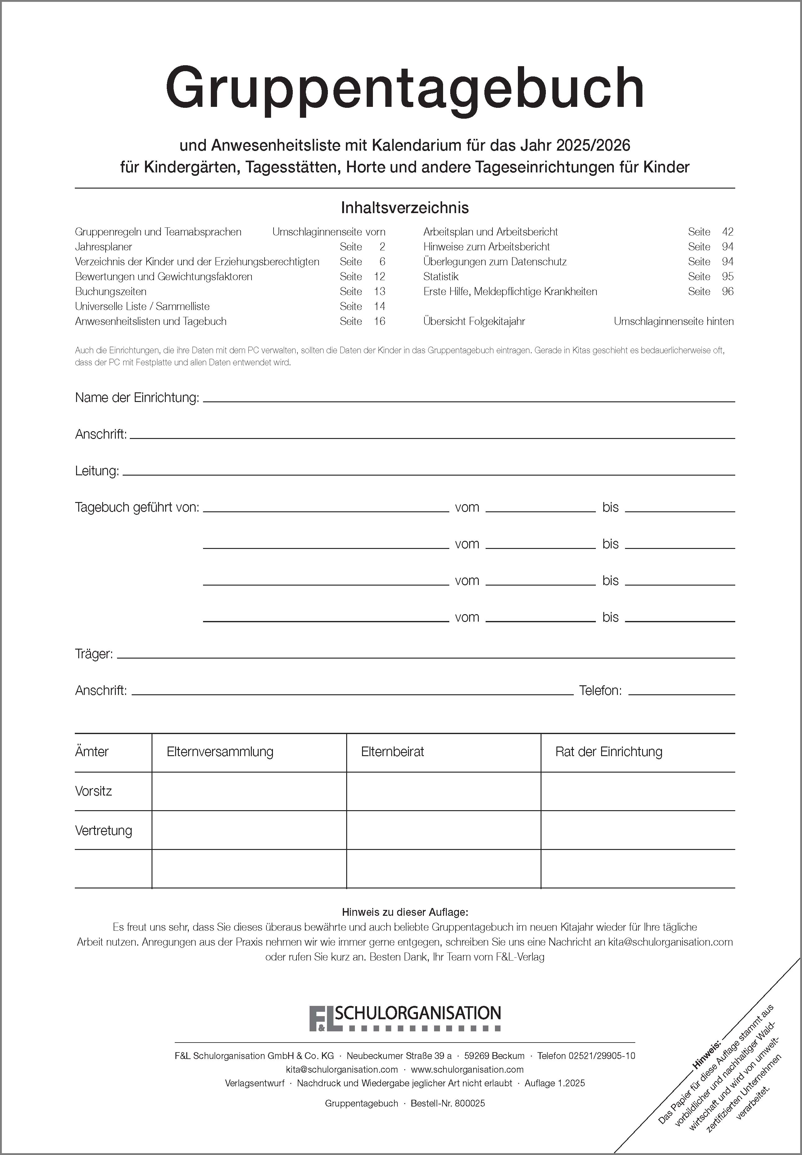 Produktinformationen "Gruppentagebuch mit Kalendarium Ausgabe 2025/2026"