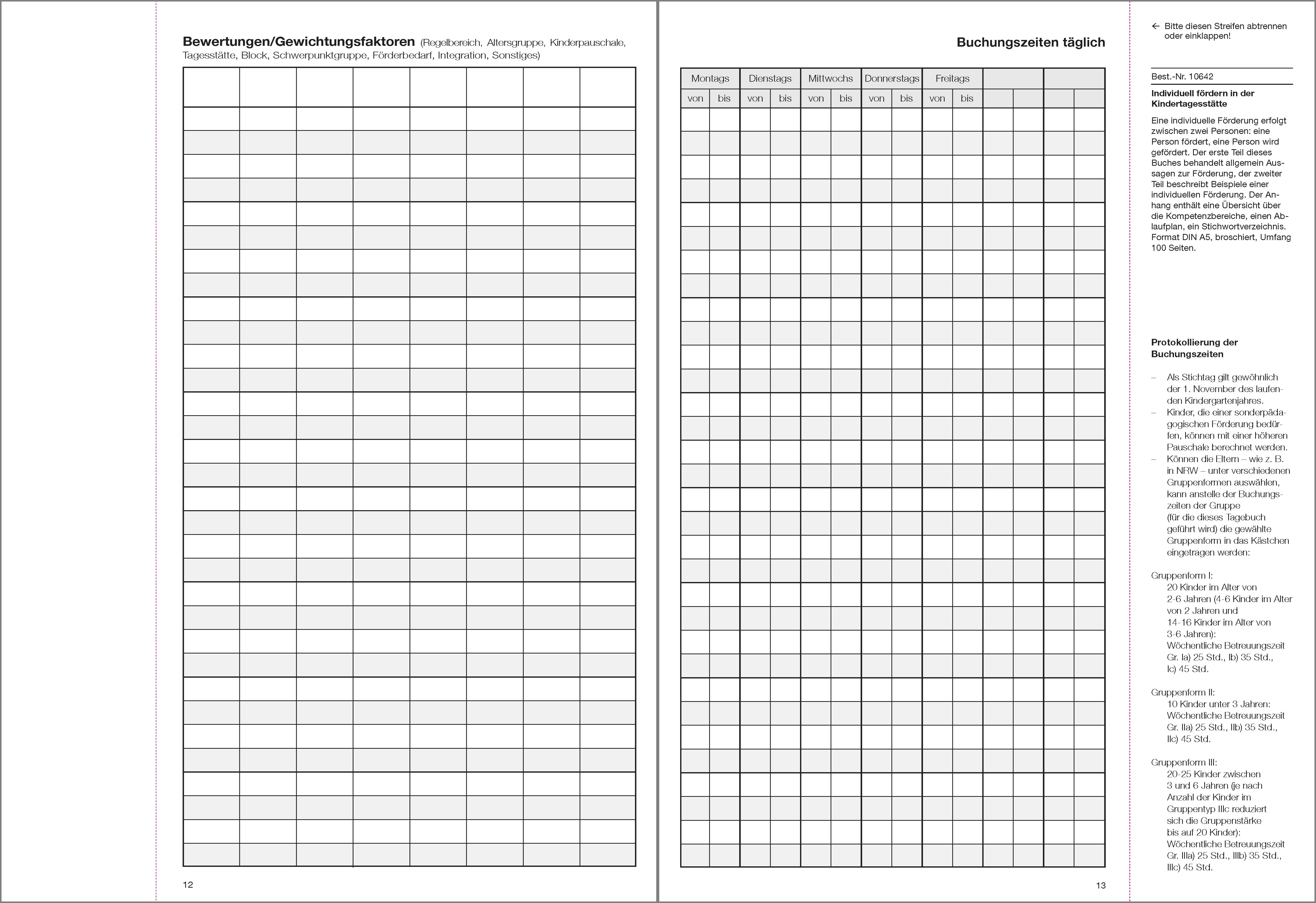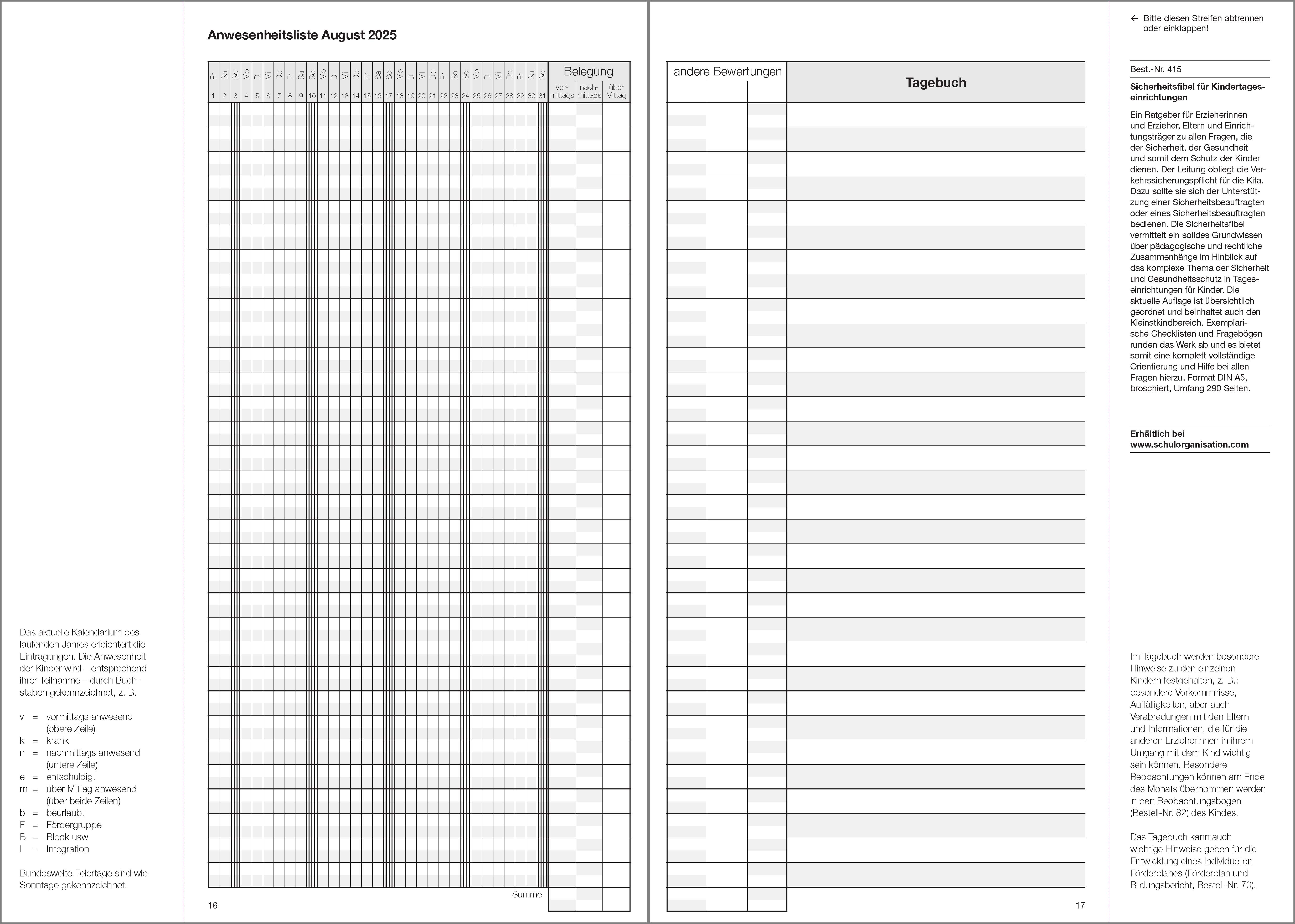 Für Kindertageseinrichtungen aller Art ist das Gruppentagebuch das Rückgrat für die Dokumentation der täglichen Arbeit. Das Kinderverzeichnis bietet Raum für 32 Kinder, ebenso die Seiten für die Buchungszeiten und Sammellisten. Die Anwesenheitslisten enthalten die Belegung und das Kalendarium des betreffenden Kita-Jahres. Arbeitsplan und Arbeitsbericht sind für ein Kita-Jahr ausreichend vorhanden, zusätzlich finden Sie hilfreiche Texte für die tägliche Verwaltungsarbeit, einen Jahresplaner und Aktennotizseiten für den Erste-Hilfe-Fall und vieles Hilfreiche mehr im Flöttmann-Gruppentagebuch. Das Heft ist in sechs frischen Umschlagfarben erhältlich.