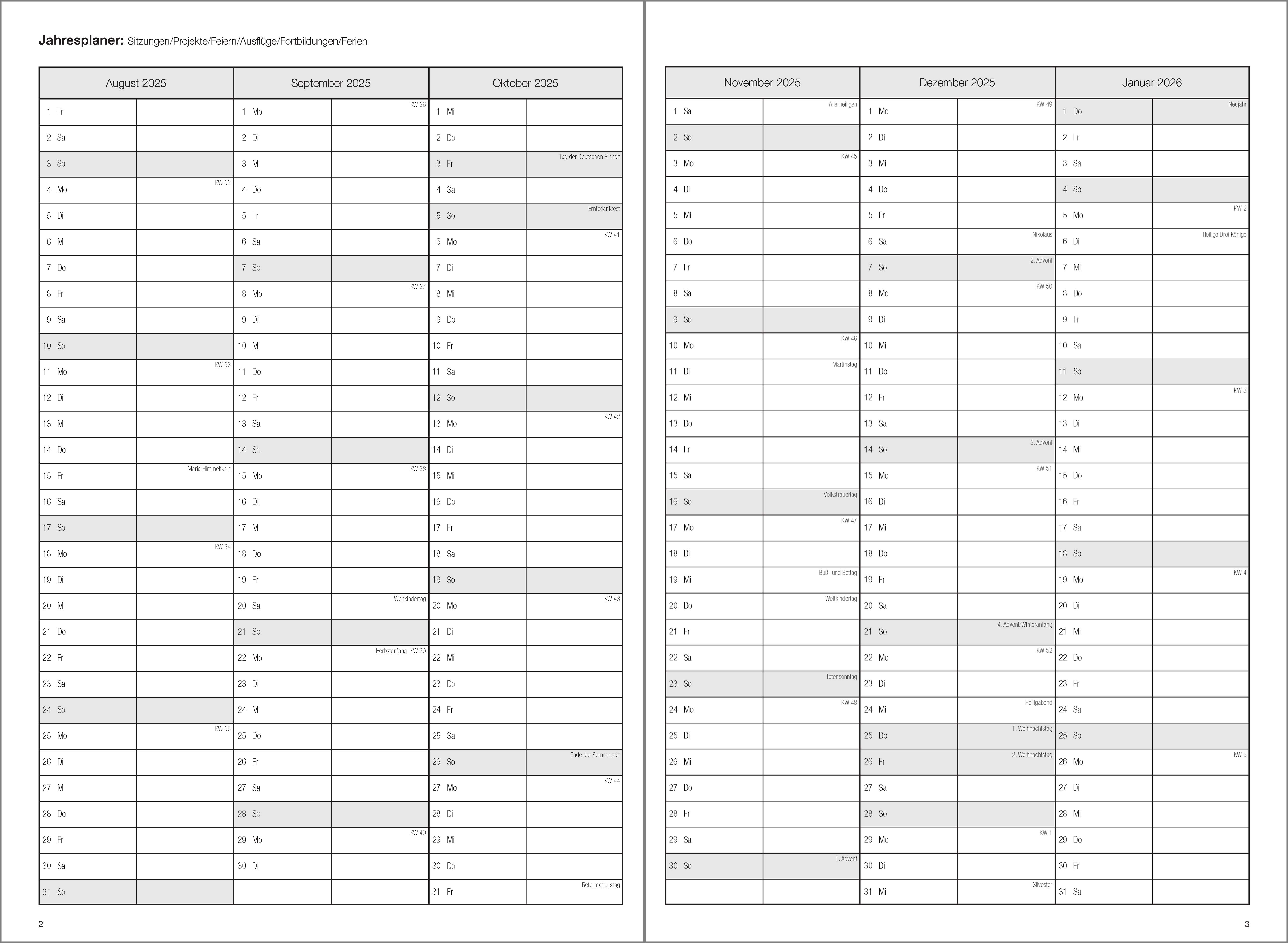 Ein Tischkalender ist prima, doch viel besser ist ein Tischkalender für das jeweilige Schuljahr. Auf dem Schreibtisch oder dem Küchentisch, neben dem Telefon, zu Hause oder im Dienst, egal wie, immer präsent. Der Kalenderwechsel findet im Sommerloch statt. Die Seitenabfolge im Einzelnen:Wichtige Rufnummern,Schulferien,Regionale Feiertage,Dienstplan,Stundenplan,Schuljahresübersicht,Projekte im Schuljahr,Monatsübersichten Juli bis Dezember im Folgejahr (18 Monate),Wochen ab Juli bis August im Folgejahr, die Woche hat auf 2 Seiten reichlich Platz,Umrechnung von Noten in Punkte,Verliehenes,Seiten neutrale Notizen,Wichtige Anschriften,Postentgelte.Im Abonnement verfügbar. Das hat viele Vorteile für Sie: Sie erhalten die Ausgabe für das kommende Schuljahr frühzeitig [März/April)nach Hause geliefert und Sie sparen die Versandkosten. Im Shop Service unter Abonnenten-Verwaltung liegt ein Bestellschein für Sie bereit.Anregungen zu diesem Kalender sind immer willkommen.