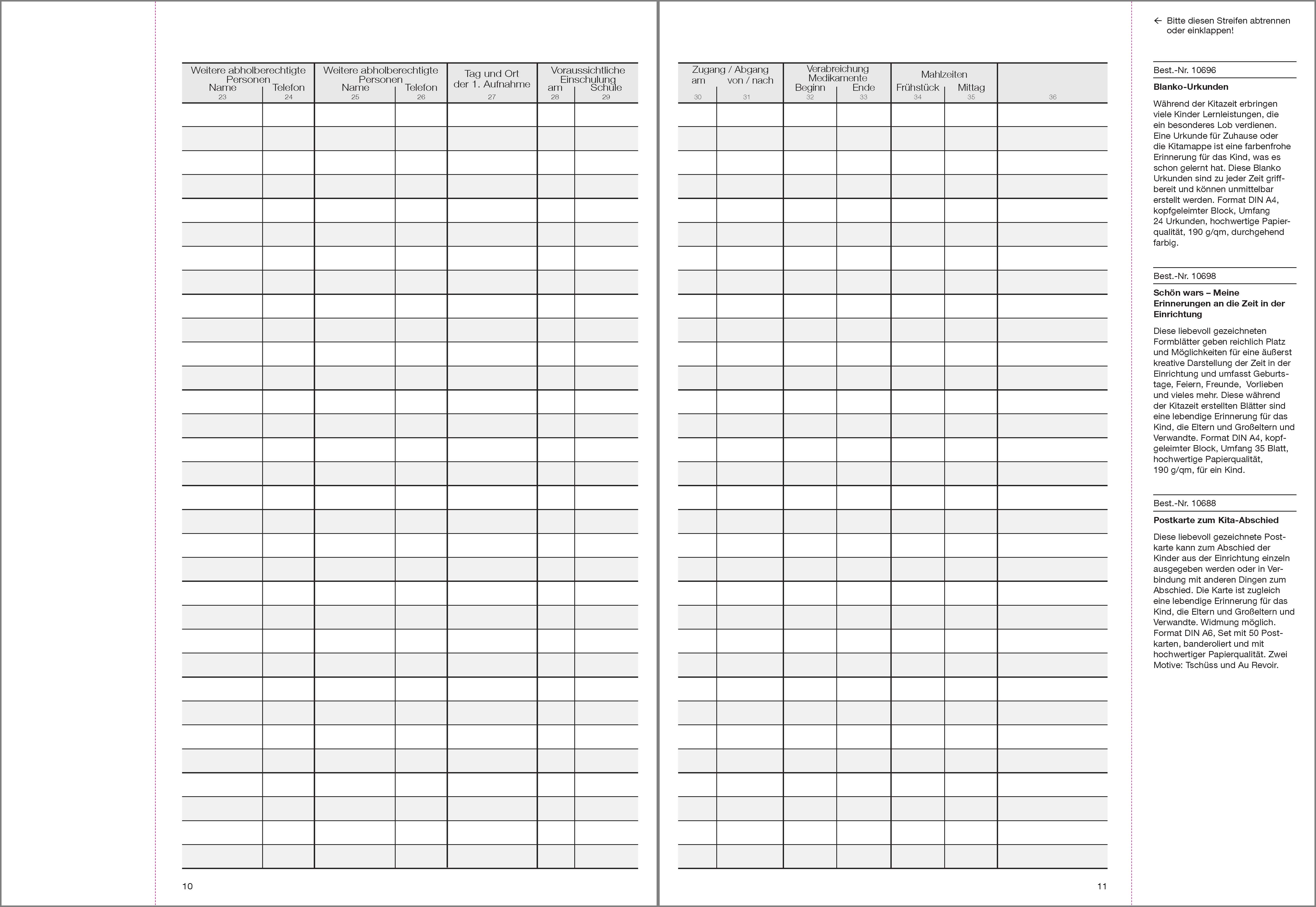 Diese liebevoll gezeichneten Formblätter geben reichlich Platz und Möglichkeiten für eine äußerst kreative Darstellung der Zeit in der Einrichtung und umfasst Geburtstage, Feiern, Freunde, Vorlieben und vieles mehr.Die erstellten Blätter sind eine lebendige Erinnerung für das Kind, die Eltern, Großeltern und Verwandte und Bestandteil der Portfolios.