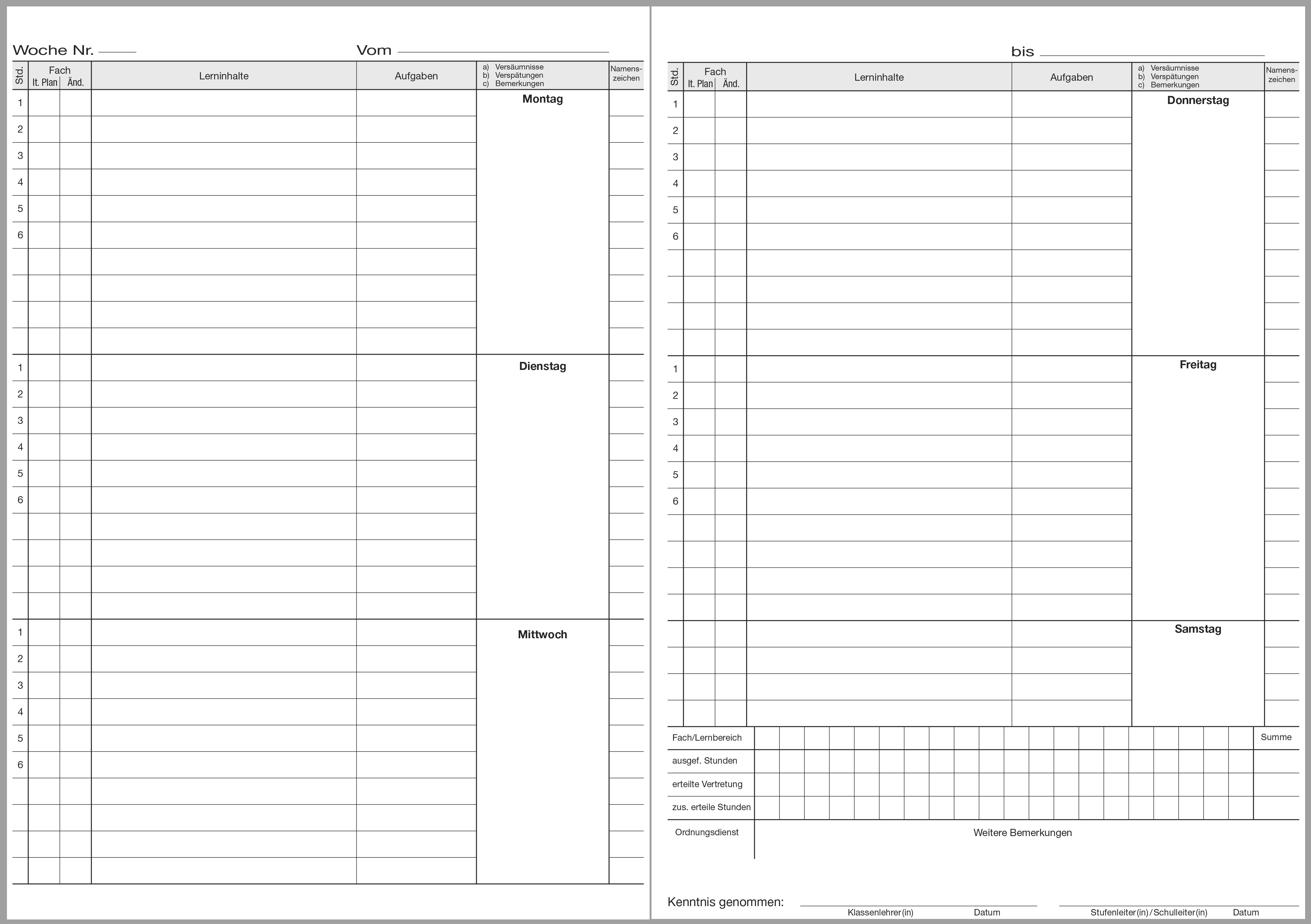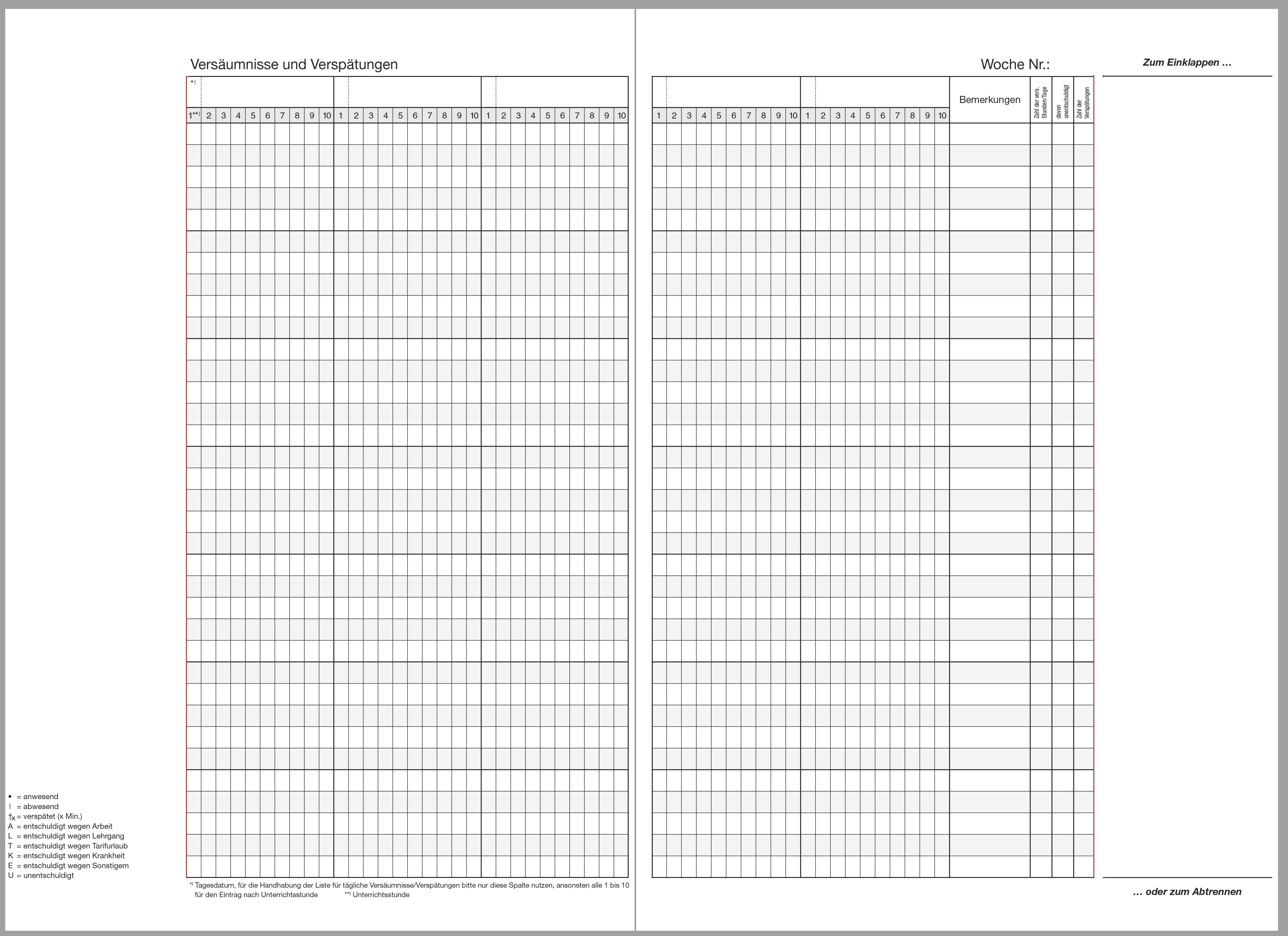 und vielen hilfreichen Seiten, Versäumnislisten für den stündlichen Eintrag,
