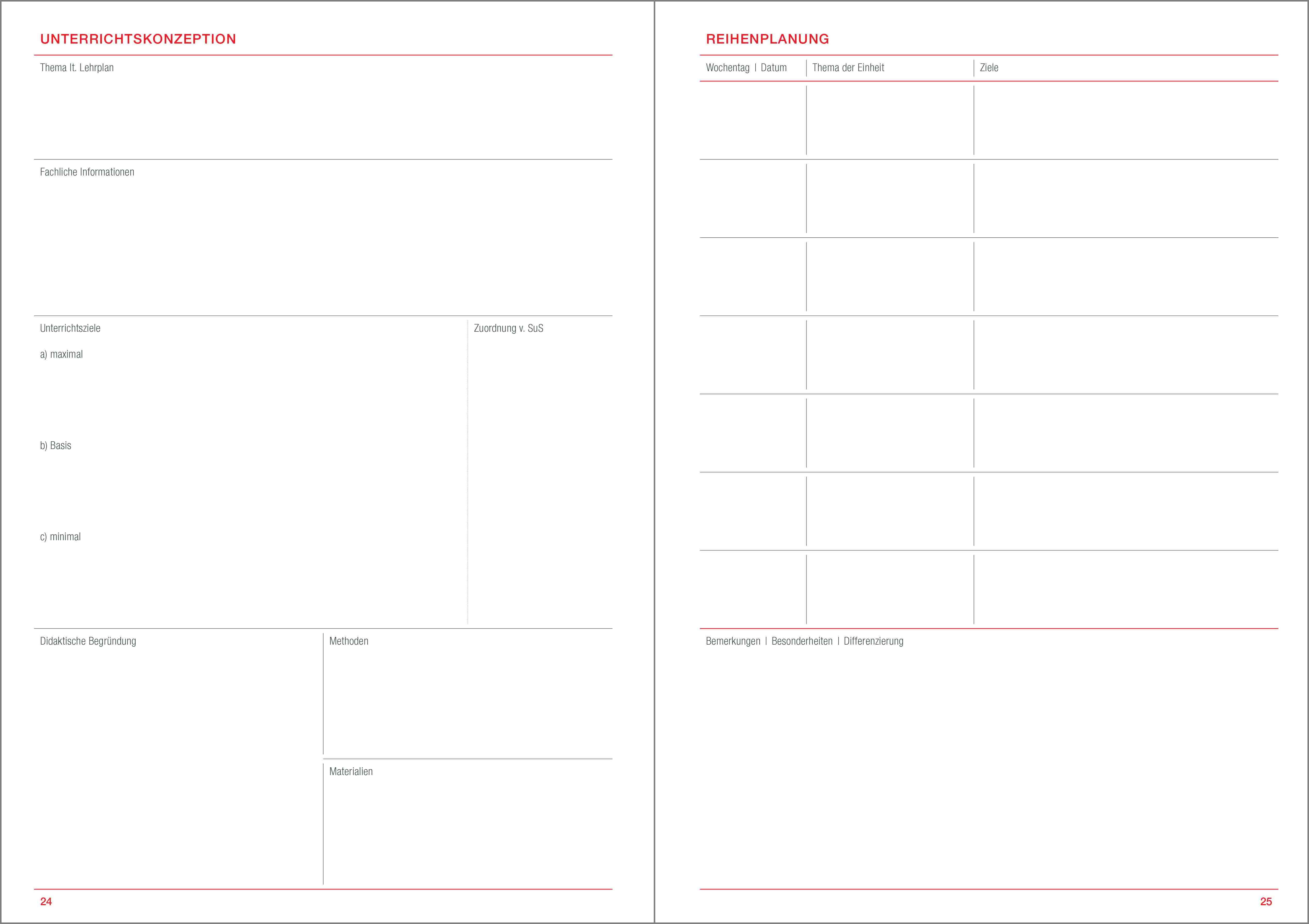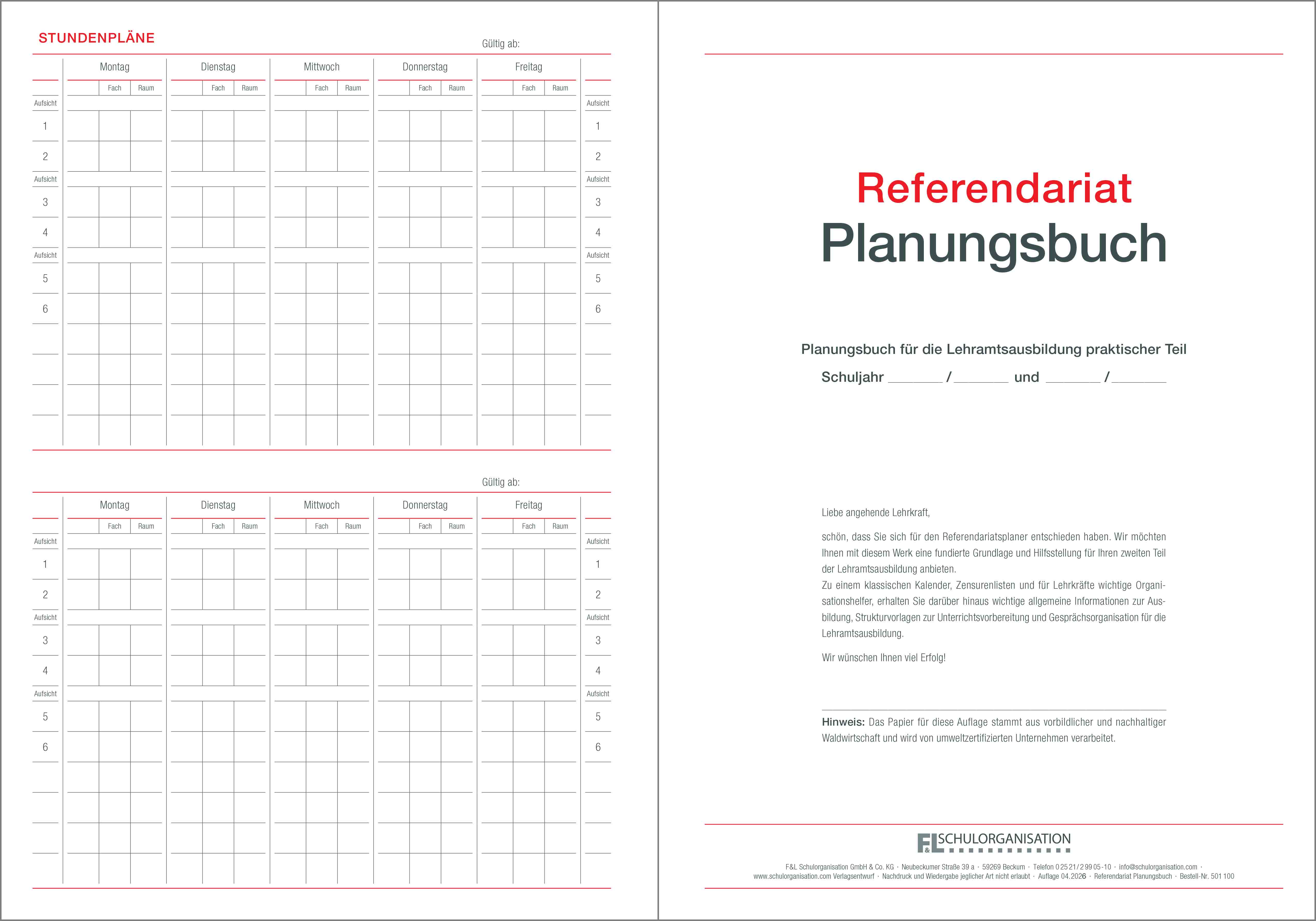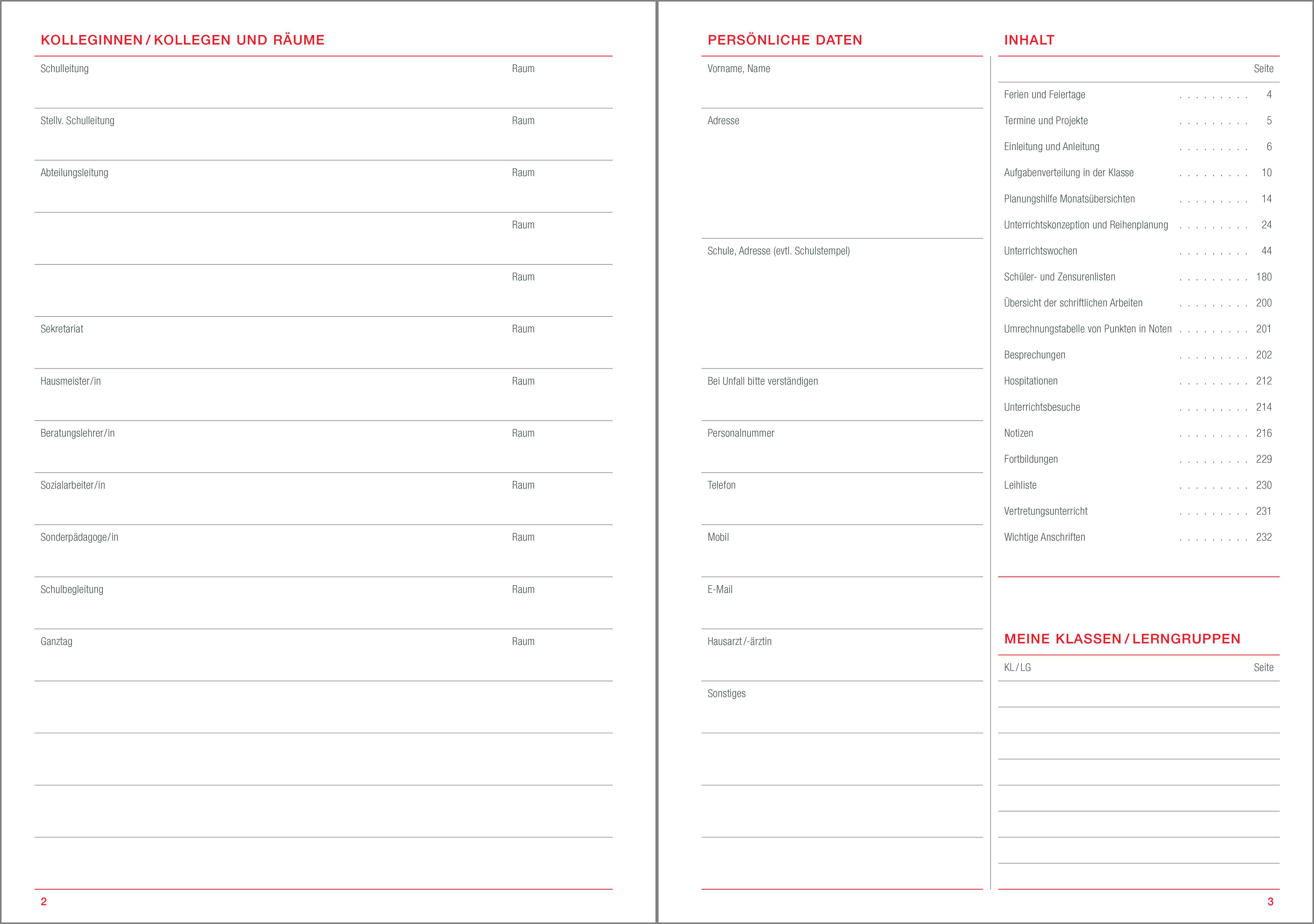 Hier kurz aus dem Inhalt: Termine und Projekte - Einleitung und Anleitung - Unterrichtskonzeption und Reihenplanung - Unterrichtswochen - Schülerlisten und Zensurenlisten - Besprechungen - Hospitationen - Unterrichtsbesuche - Notizen - Fortbildungen - und einiges mehr.
