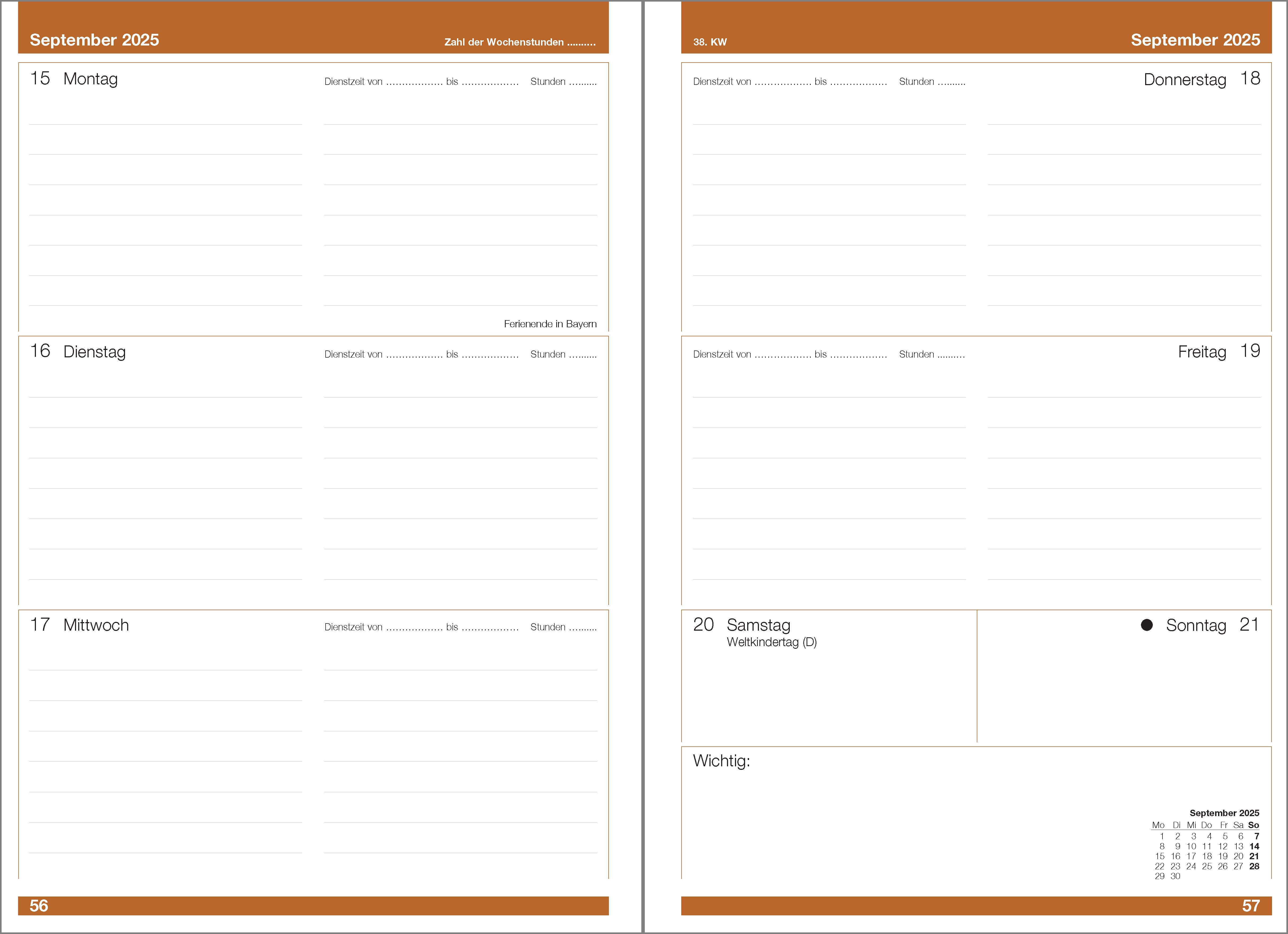 Mit jährlich wechselndem Titelmotiv, Wire-O-Bindung (ähnlich Spiralbindung).