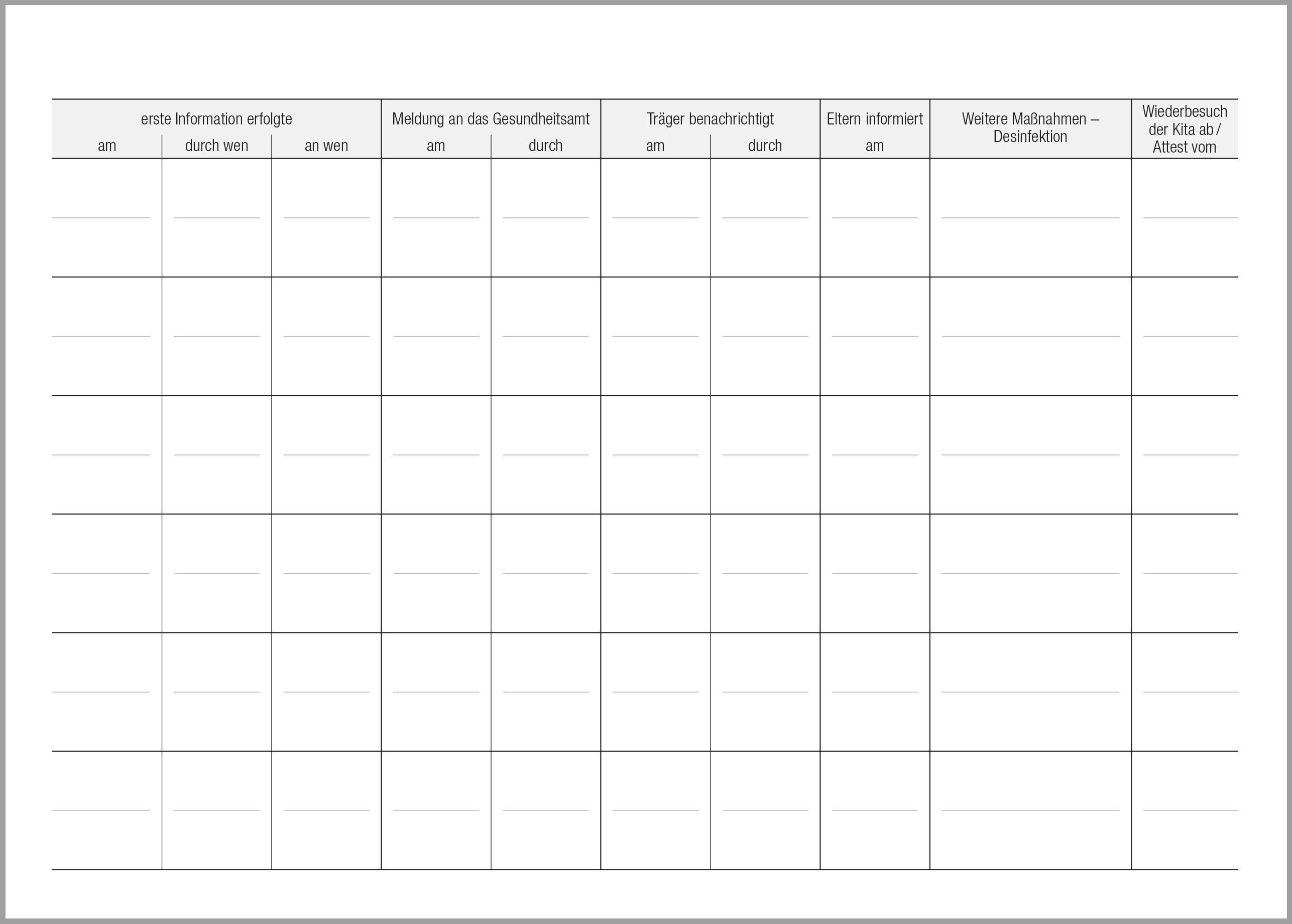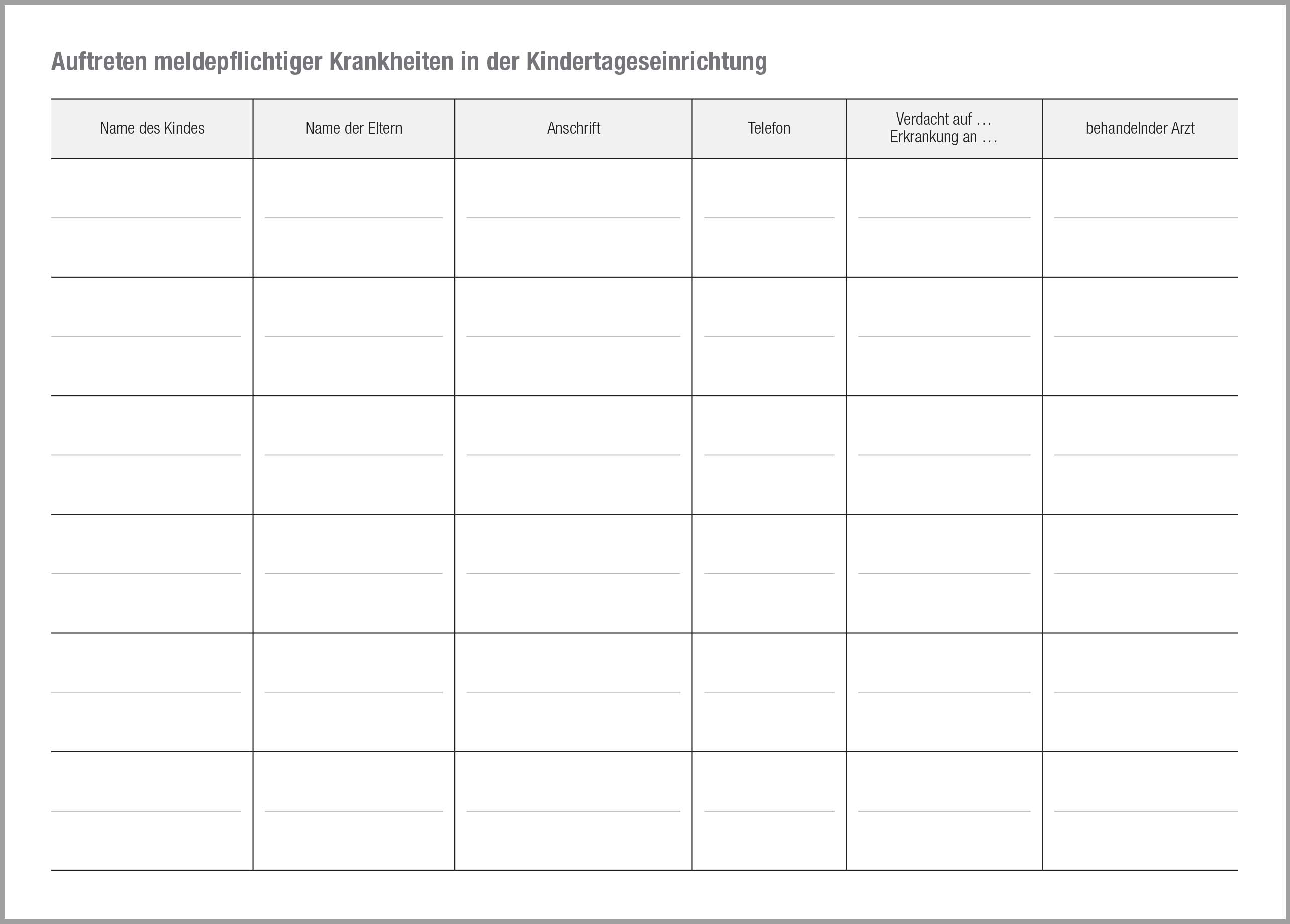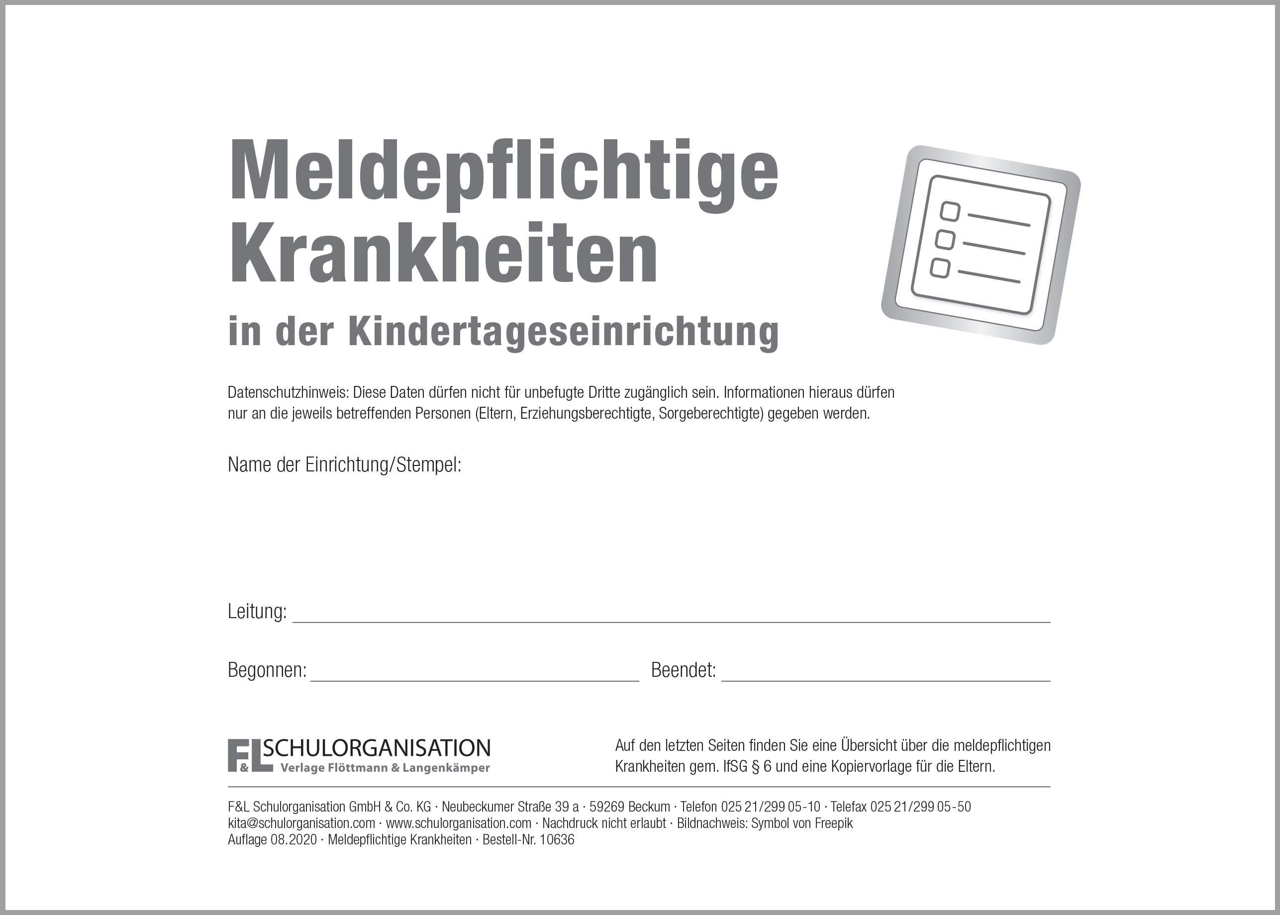 Dieses Heft hilft bei der Dokumentation der meldepflichtigen Krankheiten (auch Coronavirus) und den in der Einrichtung zu treffenden Maßnahmen.