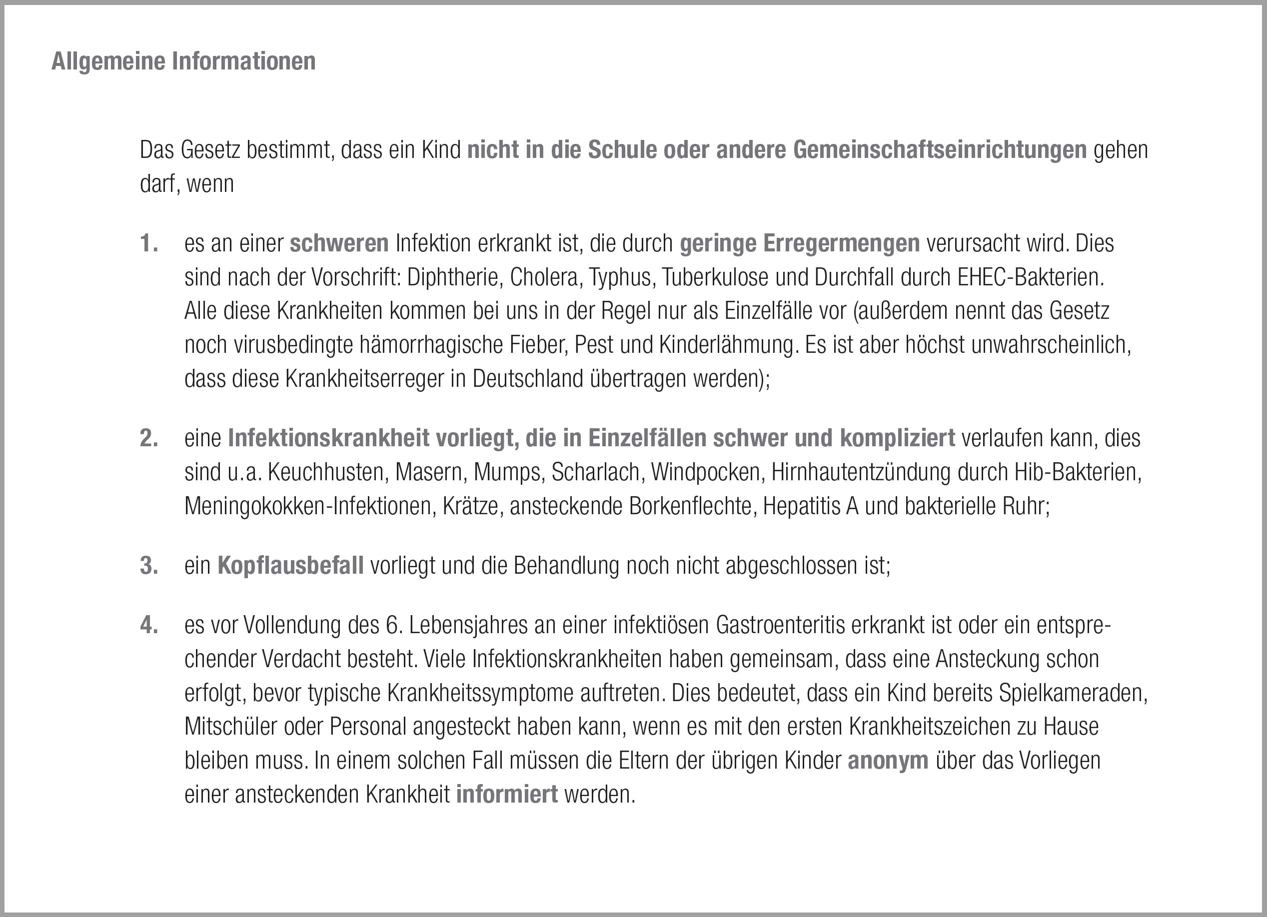 Das Infektionsschutzgesetz gem. IFSG §6 (Arztmeldepflicht) bestimmt, dass ein Kind nicht in die Kita oder eine andere Gemeinschaftseinrichtung gehen darf, wenn es an einer schweren Infektion erkrankt ist, eine Infektionskrankheit vorliegt, die in Einzelfällen schwer und kompliziert verlaufen kann, ein Kopflausbefall vorliegt und die Behandlung noch nicht abgeschlossen ist. Dies sind jedoch nur einige Fälle.
