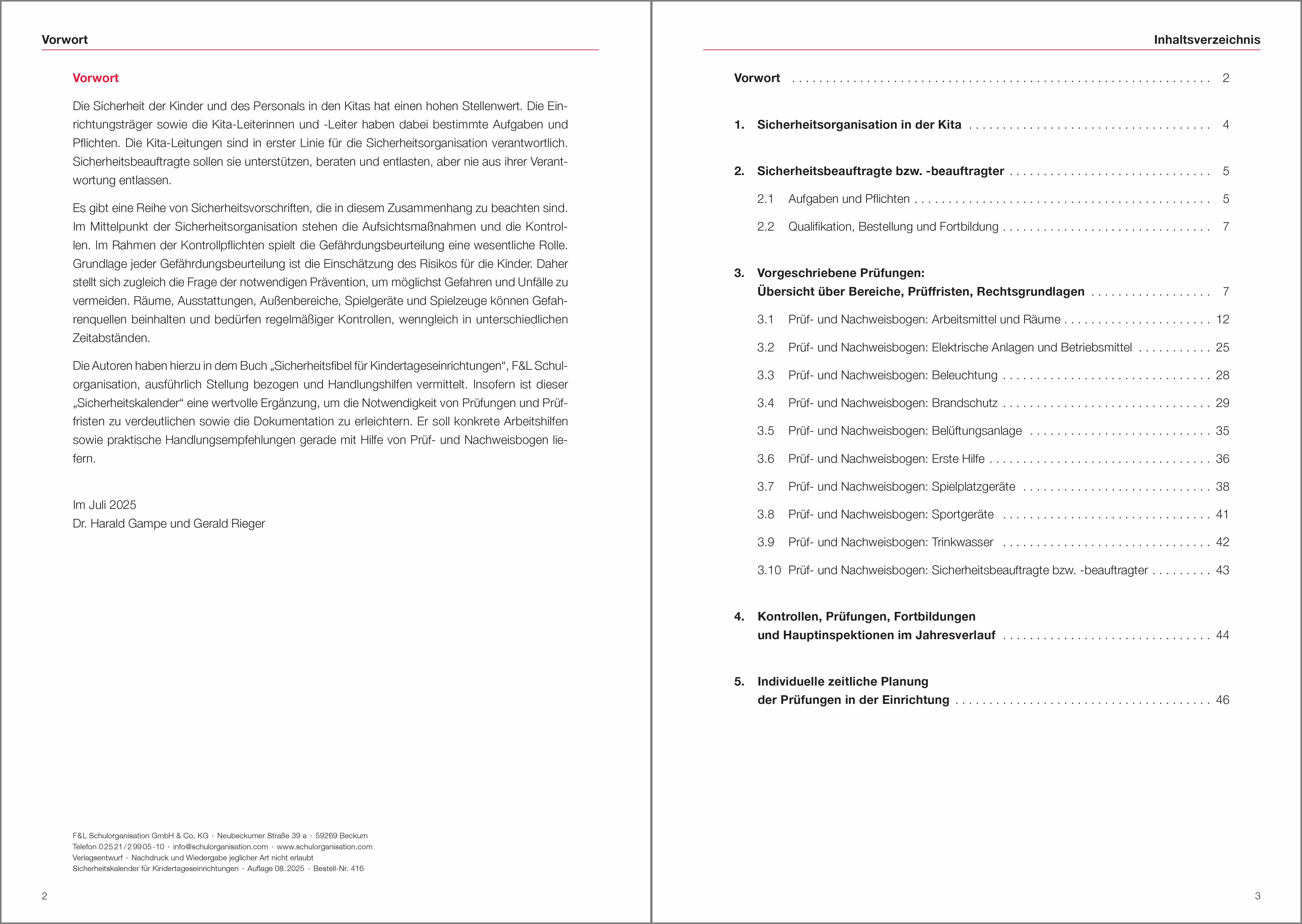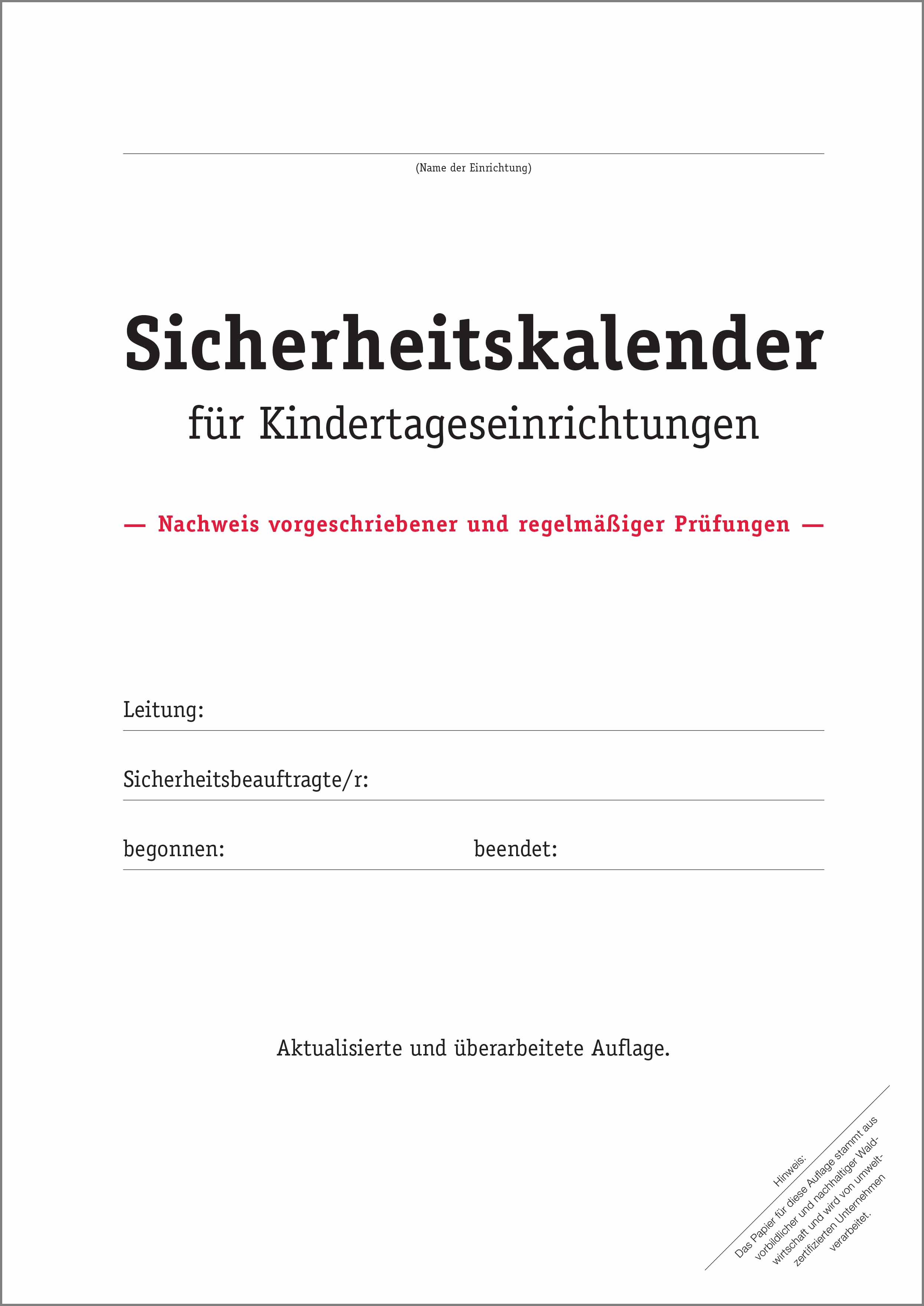 Der Sicherheitskalender dient als Nachweis der vorgeschriebenen und regelmäßigen Prüfungen und zeigt die notwendigen Maßnahmen von Kita-Träger und Kita-Leitung im Rahmen der Sicherheitsorganisation auf. Er beinhaltet die Aufgaben, Ziele und Vorgehensweisen und ist eine wertvolle Hilfe bei der Dokumentation der vorgeschriebenen Sicherheitsprüfungen.