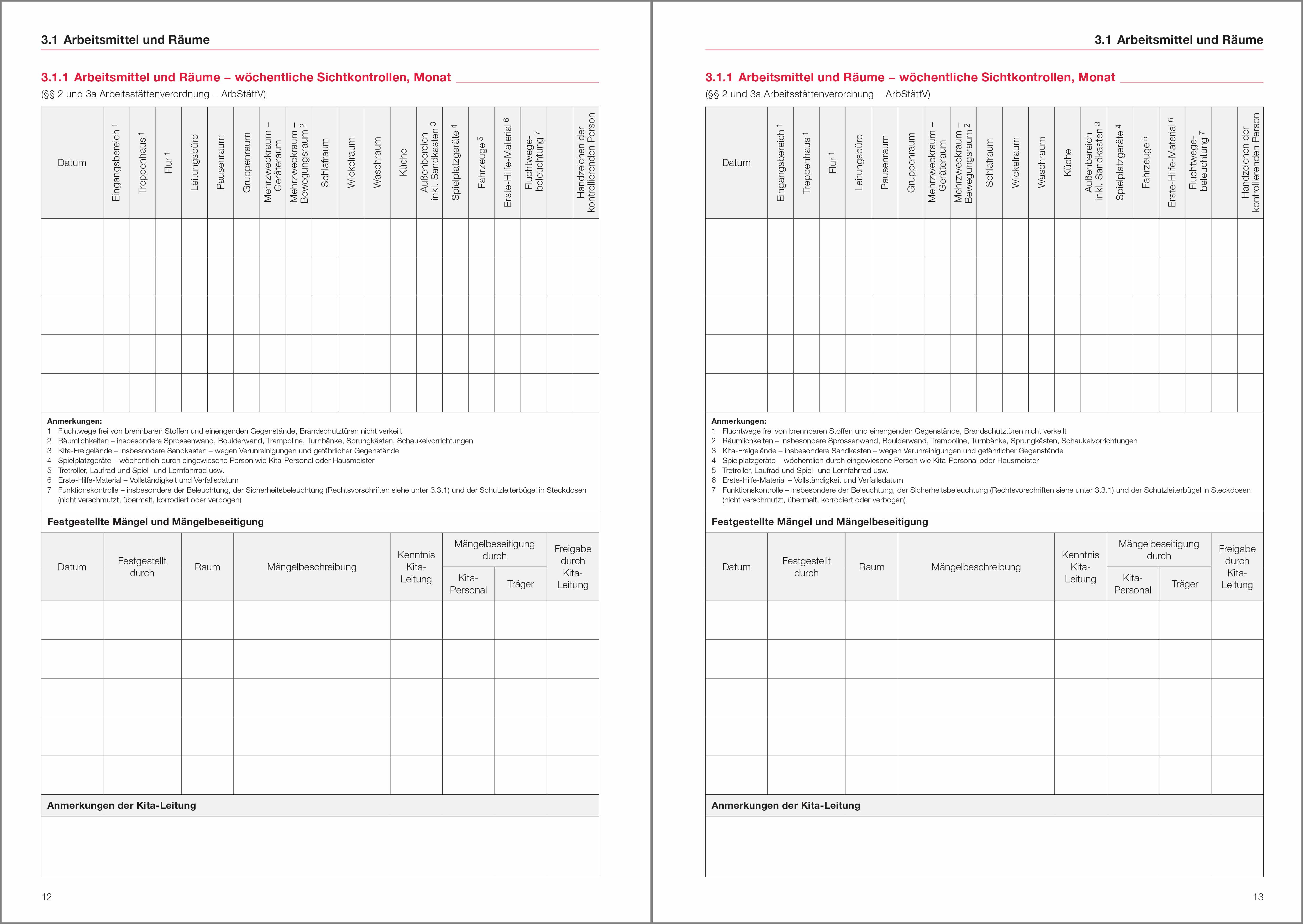 Die dazu erstellten Kontrollbögen erleichtern die einzelnen Prüfvorgänge unter Beachtung der Prüffristen und der Aufgaben der Personen, die für die Prüfung verantwortlich sind. Dies sorgt für Handlungsklarheit und Rechtssicherheit. Für 12 Monate angelegt und mit praktischer Ringösenheftung.