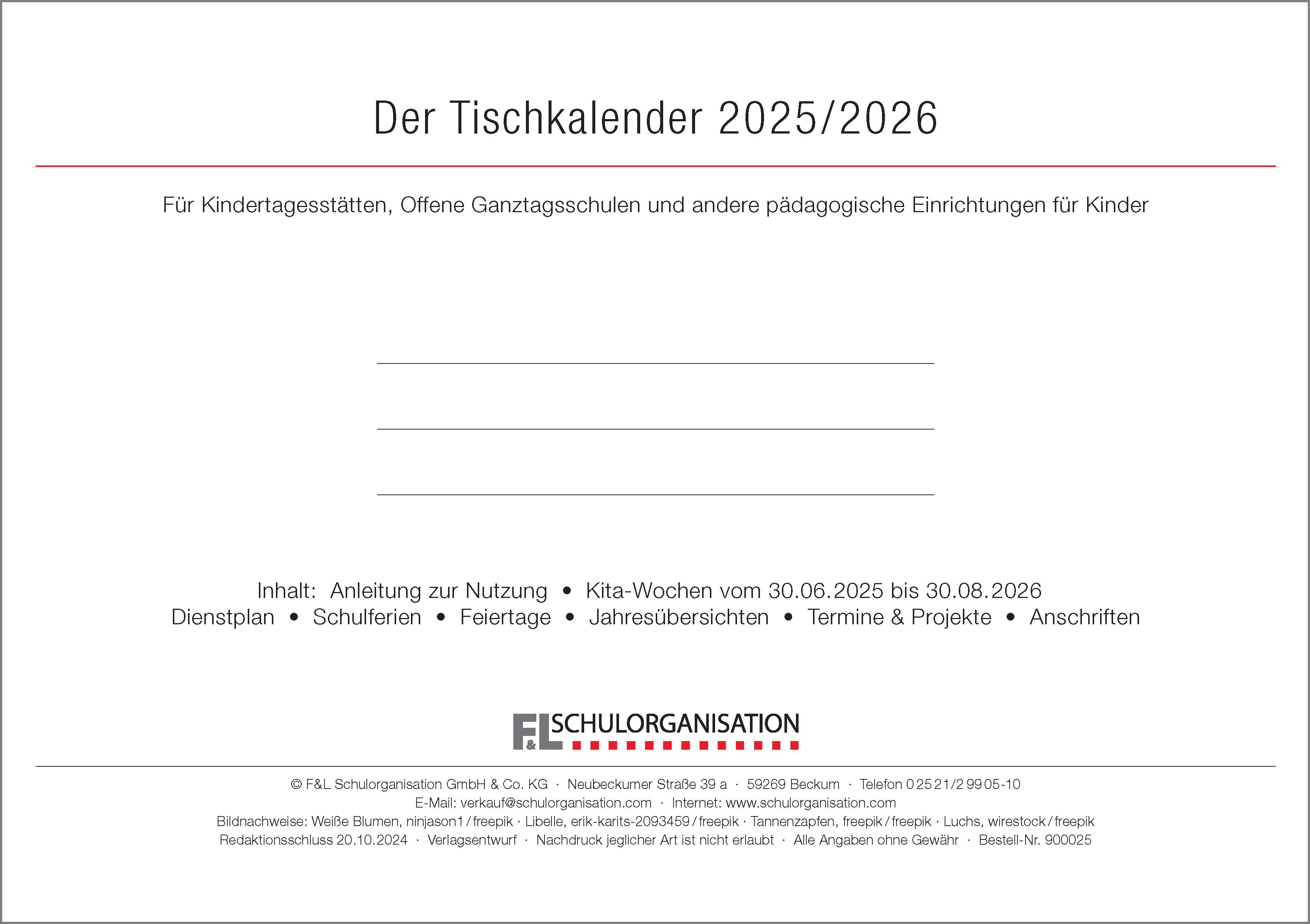 Ein Tischkalender ist prima, doch viel besser ist ein Tischkalender für das jeweilige Schuljahr. Auf dem Schreibtisch oder dem Küchentisch, neben dem Telefon, zu Hause oder im Dienst, egal wie, immer präsent. Der Kalenderwechsel findet im Sommerloch statt. Die Seitenabfolge im Einzelnen:Wichtige Rufnummern,Schulferien,Regionale Feiertage,Dienstplan,Stundenplan,Schuljahresübersicht,Projekte im Schuljahr,Monatsübersichten Juli bis Dezember im Folgejahr (18 Monate),Wochen ab Juli bis August im Folgejahr, die Woche hat auf 2 Seiten reichlich Platz,Umrechnung von Noten in Punkte,Verliehenes,Seiten neutrale Notizen,Wichtige Anschriften,Postentgelte.Im Abonnement verfügbar. Das hat viele Vorteile für Sie: Sie erhalten die Ausgabe für das kommende Schuljahr frühzeitig [März/April)nach Hause geliefert und Sie sparen die Versandkosten. Im Shop Service unter Abonnenten-Verwaltung liegt ein Bestellschein für Sie bereit.Anregungen zu diesem Kalender sind immer willkommen.