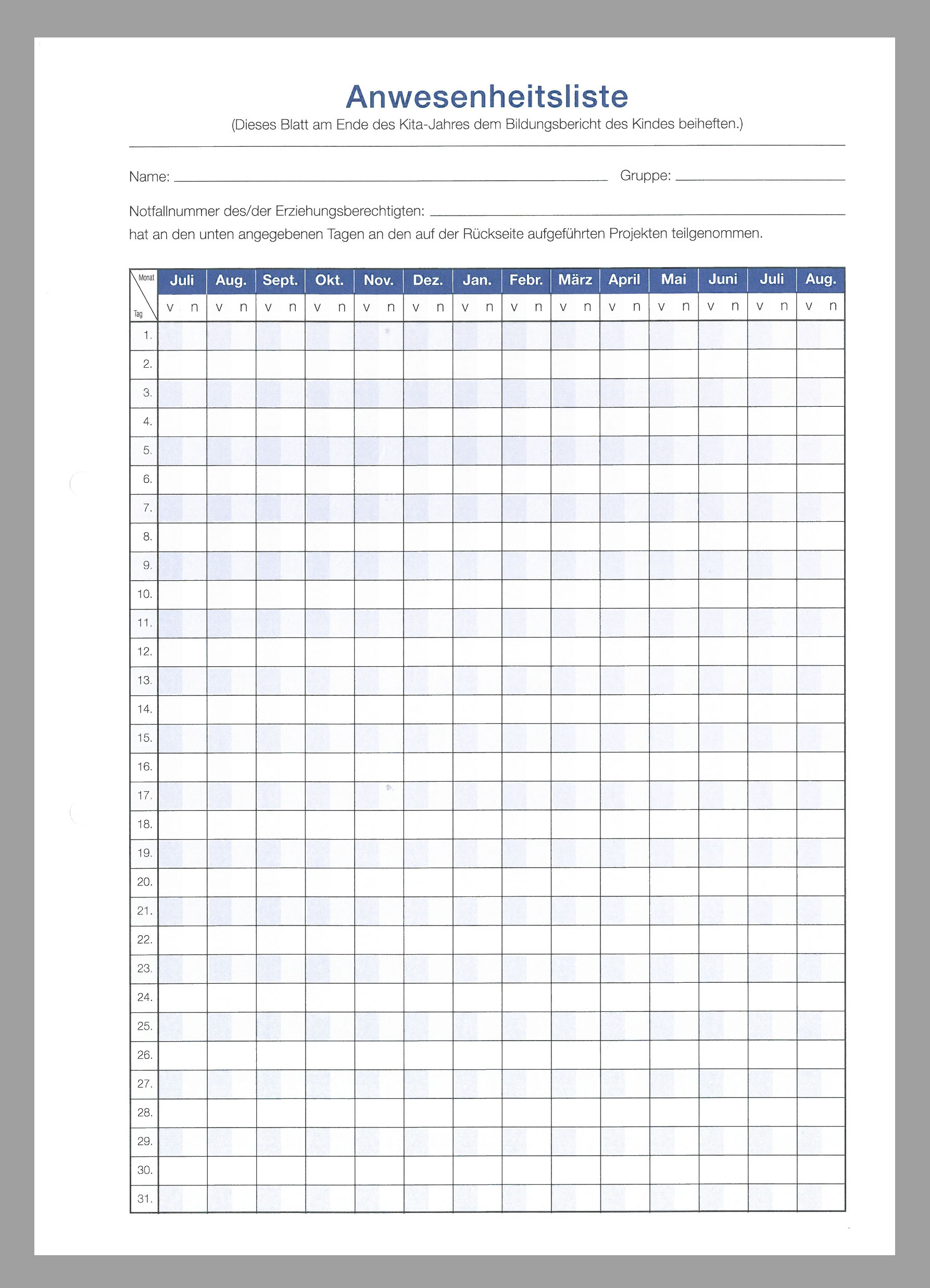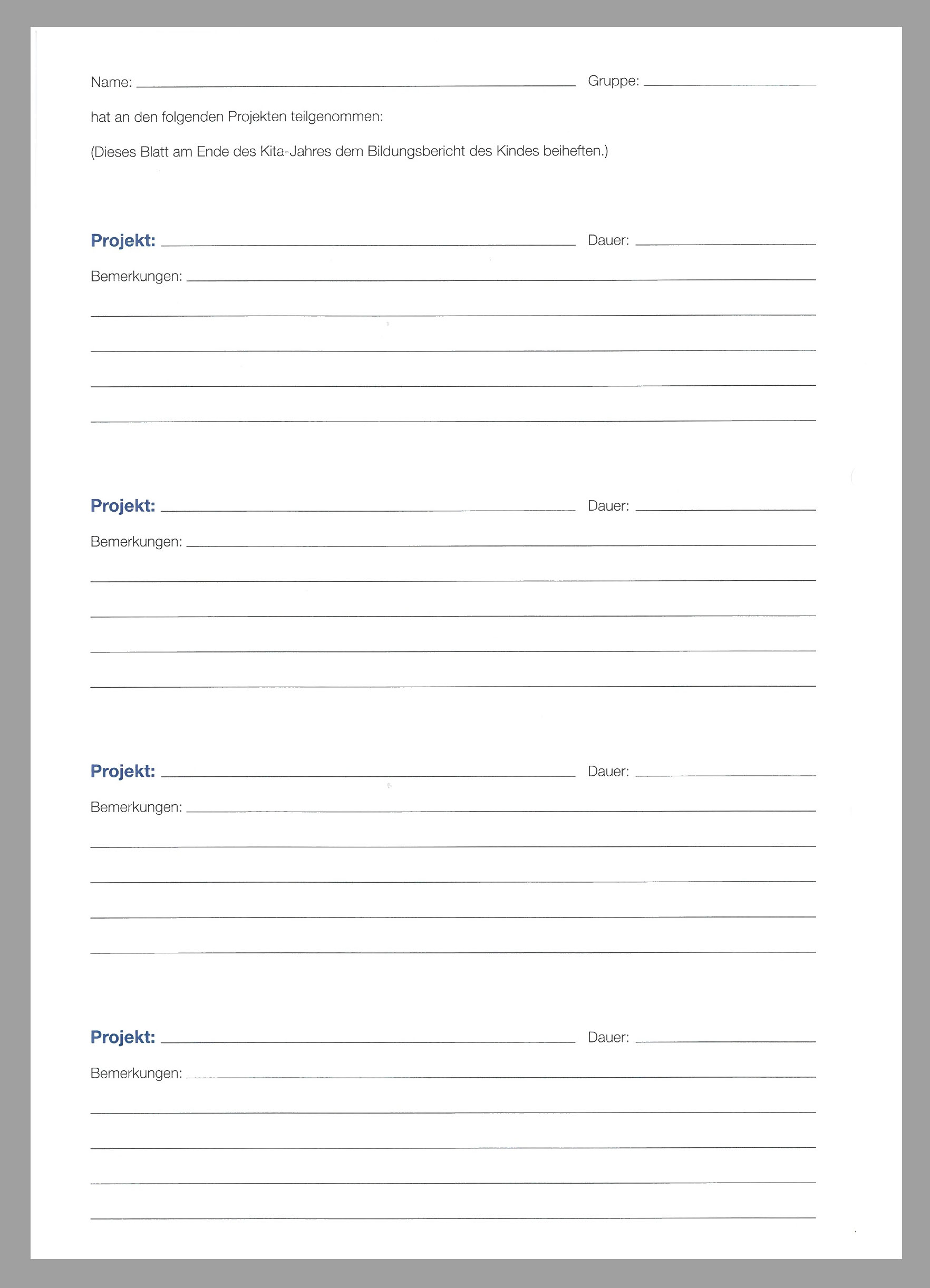 Die Teilnahmeblätter der Kinder werden zum Ende des Kita-Jahres in deren Bildungsbericht übernommen. Pro Kita-Gruppe wird eine Projektmappe benötigt.