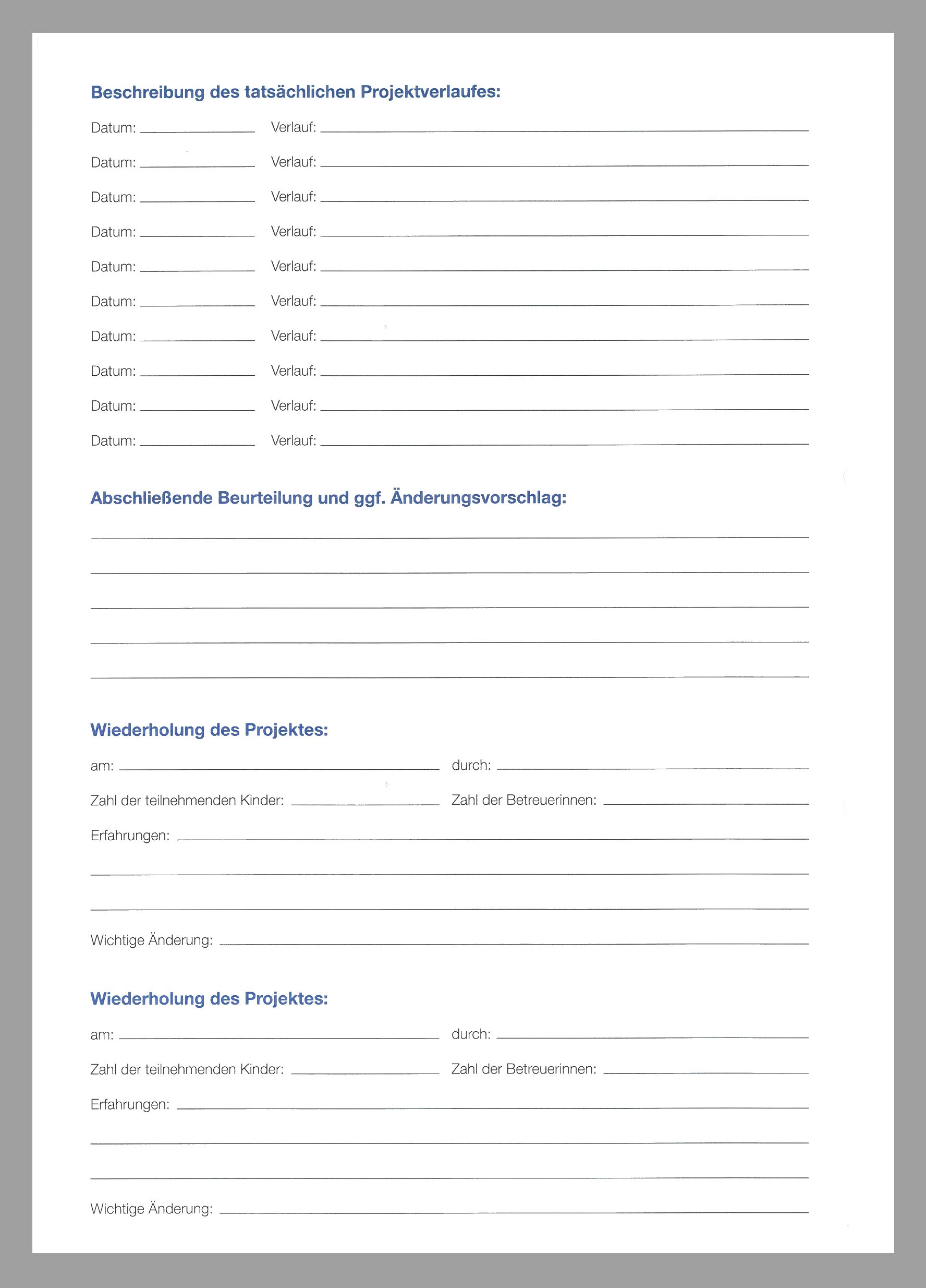 Das Blatt "Projektbeschreibung" wird zusammen mit den Anwesenheitslisten der Kinder in einem Schnellhefter zu einer Projektmappe zusammen gestellt. So sind alle Unterlagen und Daten während der Projektarbeit verfügbar.