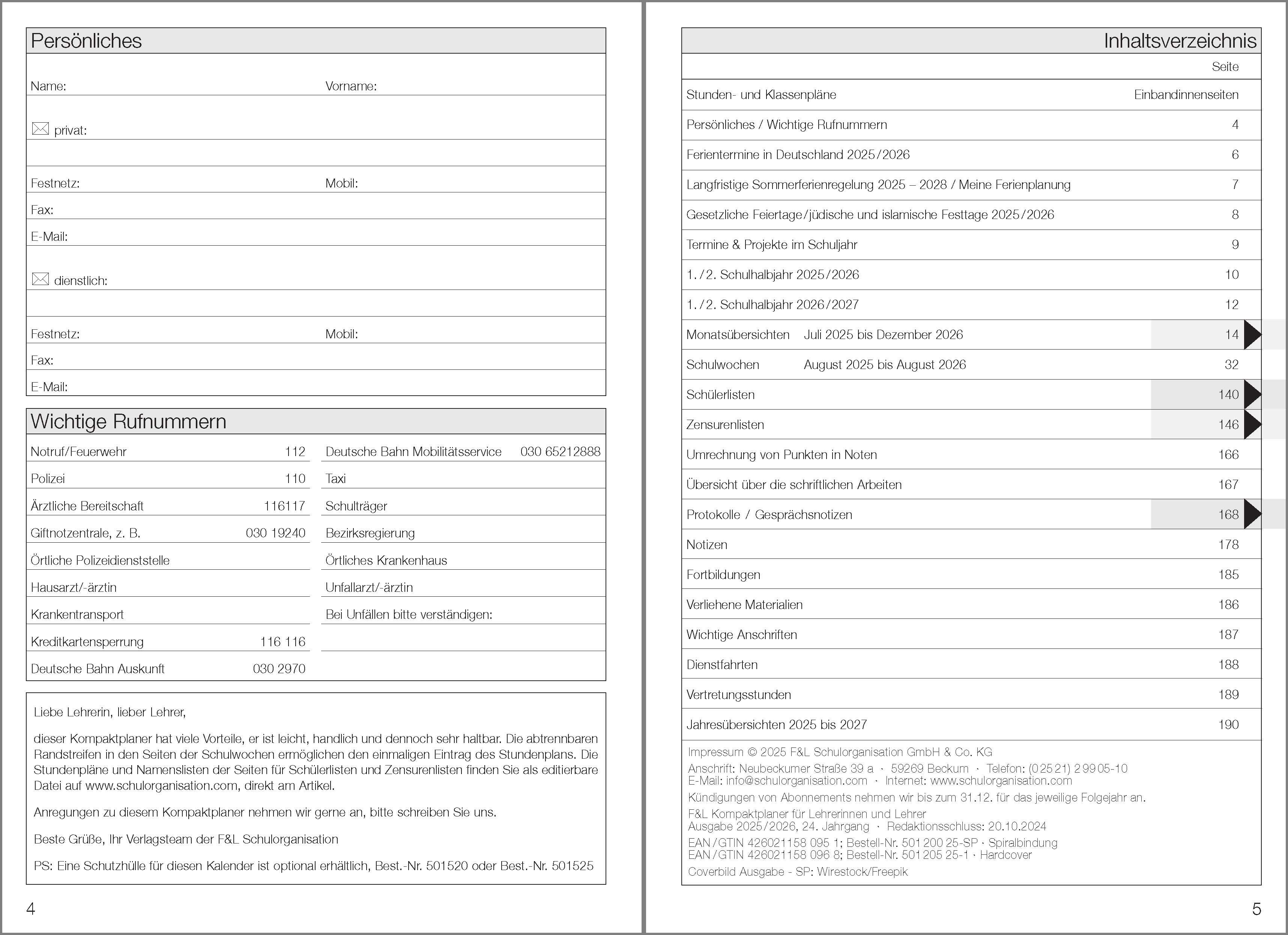 Ein Tischkalender ist prima, doch viel besser ist ein Tischkalender für das jeweilige Schuljahr. Auf dem Schreibtisch oder dem Küchentisch, neben dem Telefon, zu Hause oder im Dienst, egal wie, immer präsent. Der Kalenderwechsel findet im Sommerloch statt. Die Seitenabfolge im Einzelnen:Wichtige Rufnummern,Schulferien,Regionale Feiertage,Dienstplan,Stundenplan,Schuljahresübersicht,Projekte im Schuljahr,Monatsübersichten Juli bis Dezember im Folgejahr (18 Monate),Wochen ab Juli bis August im Folgejahr, die Woche hat auf 2 Seiten reichlich Platz,Umrechnung von Noten in Punkte,Verliehenes,Seiten neutrale Notizen,Wichtige Anschriften,Postentgelte.Im Abonnement verfügbar. Das hat viele Vorteile für Sie: Sie erhalten die Ausgabe für das kommende Schuljahr frühzeitig [März/April)nach Hause geliefert und Sie sparen die Versandkosten. Im Shop Service unter Abonnenten-Verwaltung liegt ein Bestellschein für Sie bereit.Anregungen zu diesem Kalender sind immer willkommen.