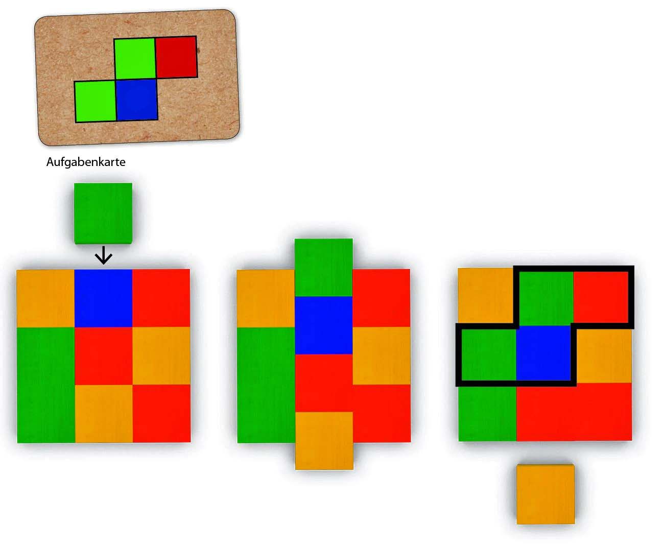 Das Spielfeld gibt ein rechteckiges Muster aus unterschiedlichen Farbplättchen vor. Punkte sammelt, wer es schafft, durch Einschieben weiterer Farbplättchen die geometrischen Muster auf seinen oder ihren Aufgabenkarten nachzubilden. Wer aufmerksam die Spielzüge seiner Mitspielerinnen und Mitspieler verfolgt und dabei die Muster auf den eigenen Aufgabenkarten entdeckt, kann schneller Punkte ergattern. So entwickelt sich ein spannender Wettbewerb!