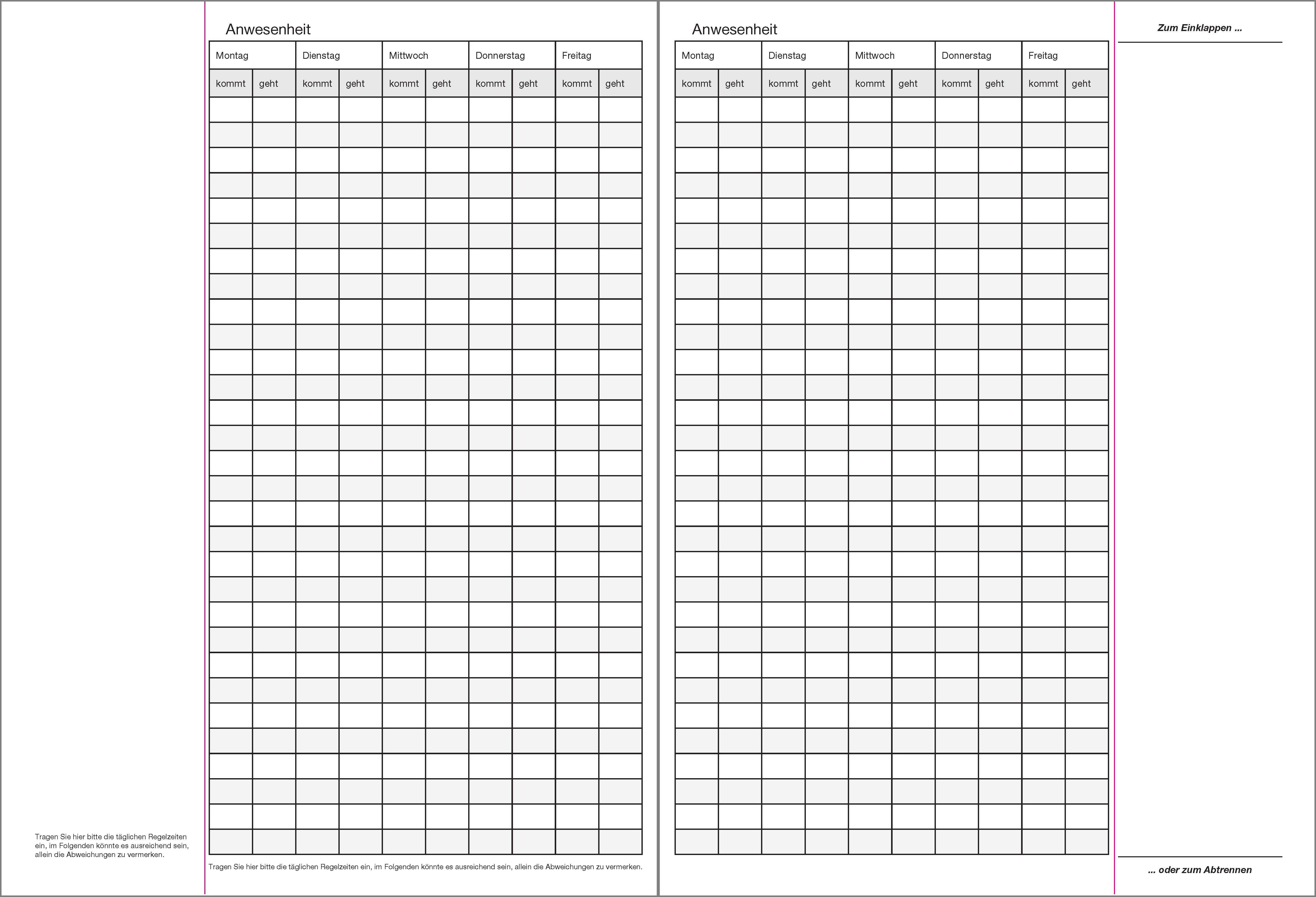 Dieses Heft kombiniert die Eintragungsmöglichkeiten der Anwesenheitsliste „kommt/geht" Best.-Nr. 9011-1520 mit dem Gruppenheft/Übergabeheft Best.-Nr. 9011-1510.