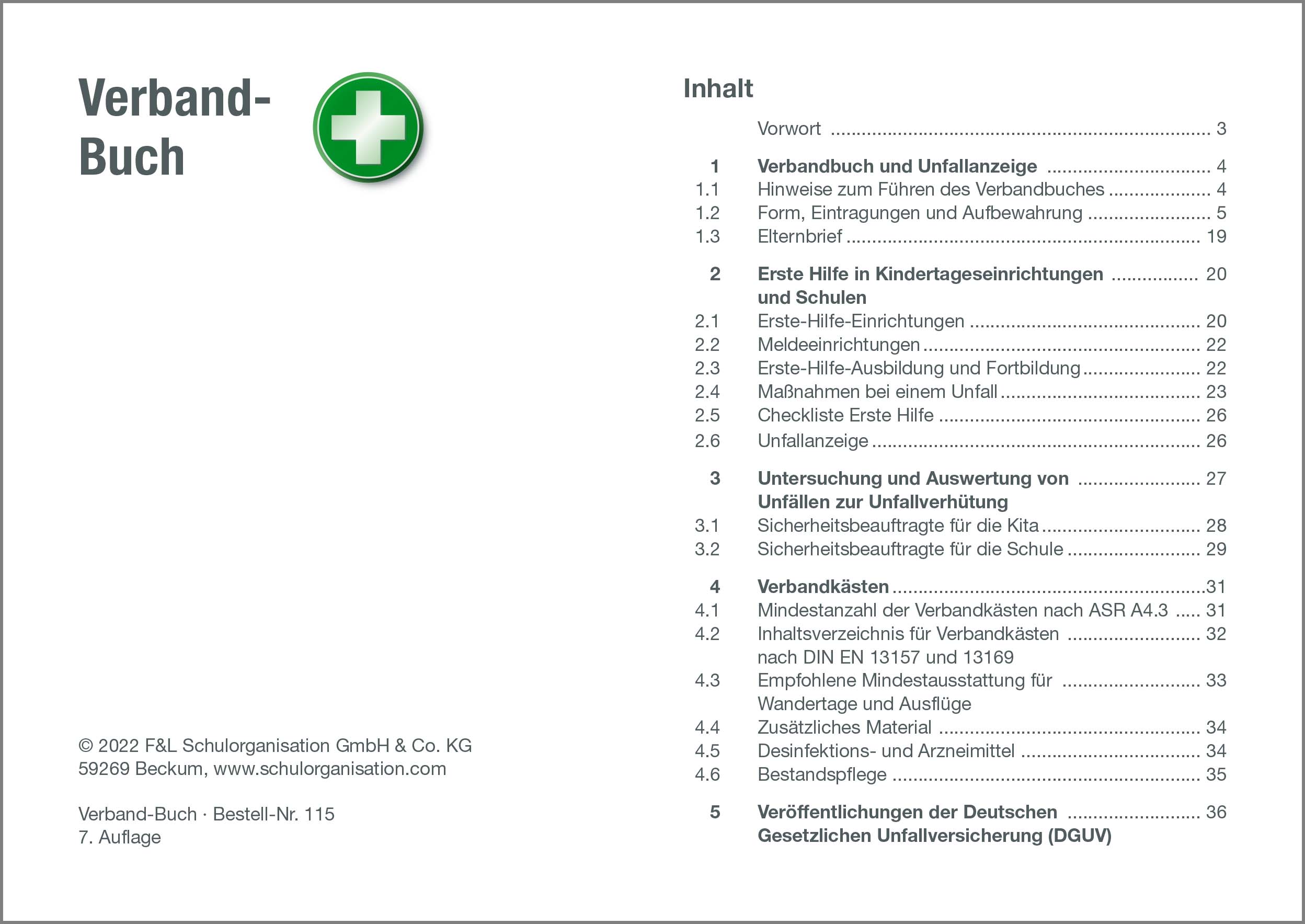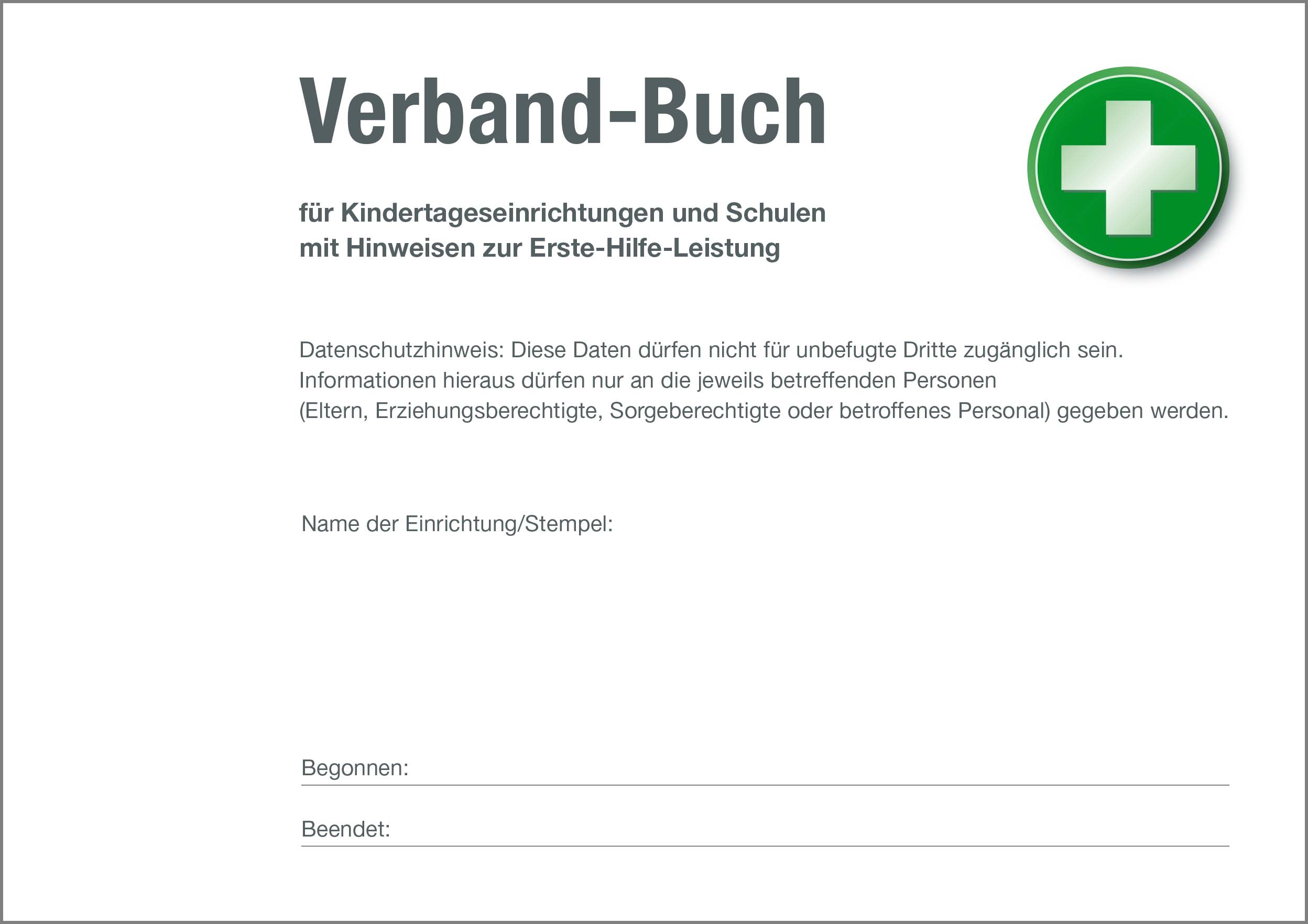 Das Verbandbuch dient dazu, die gesetzlichen Vorschriften zu erfüllen (§ 24 Abs. 6 DGVU). Danach hat jede Einrichtung schriftlich festzuhalten, wenn Erste Hilfe geleistet wird. Die Dokumentation erstreckt sich z. B. auf das Anlegen eines Pflasters, eines Verbandes, das Behandeln eines Insektenstichs, das Entfernen einer Zecke usw.