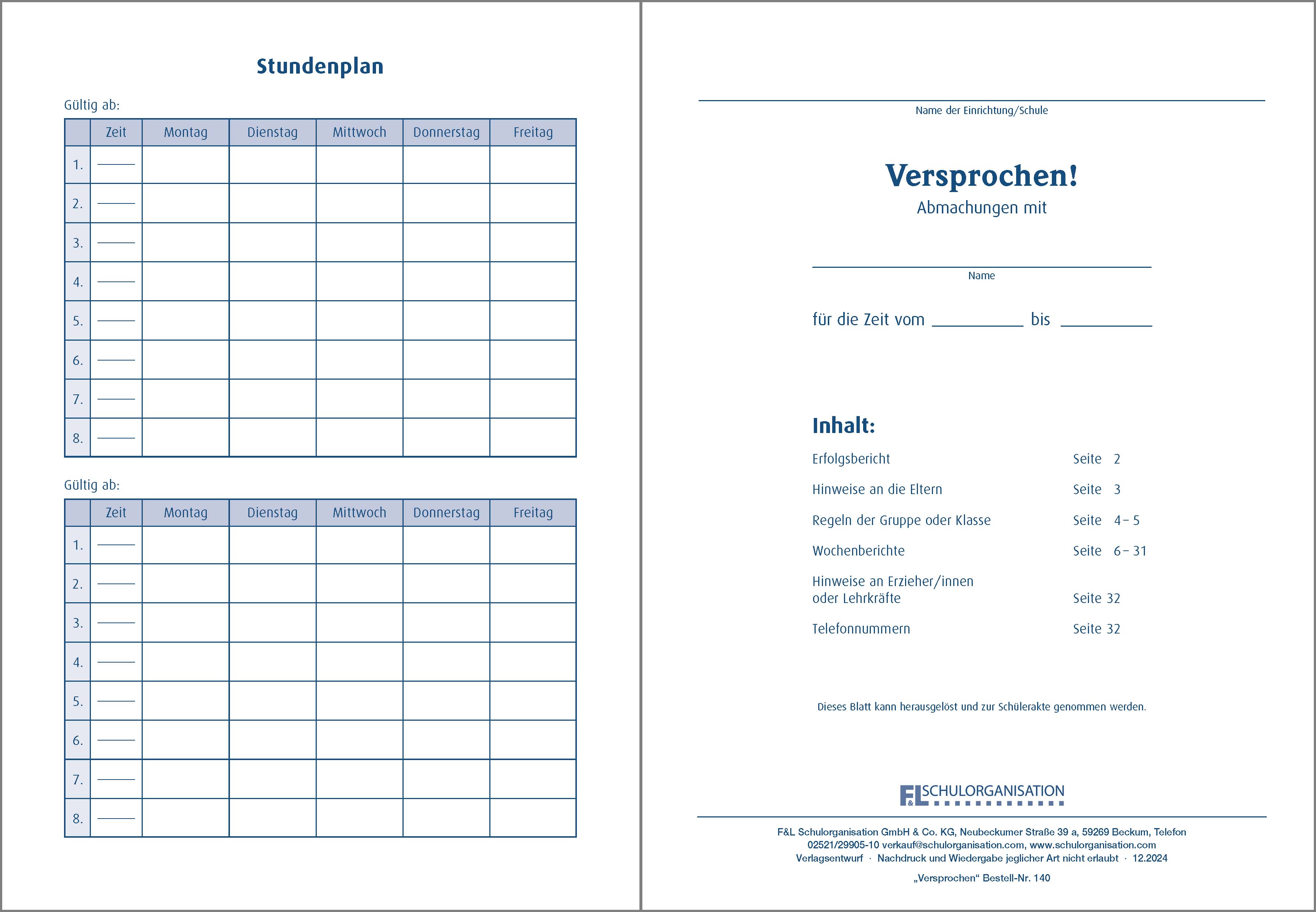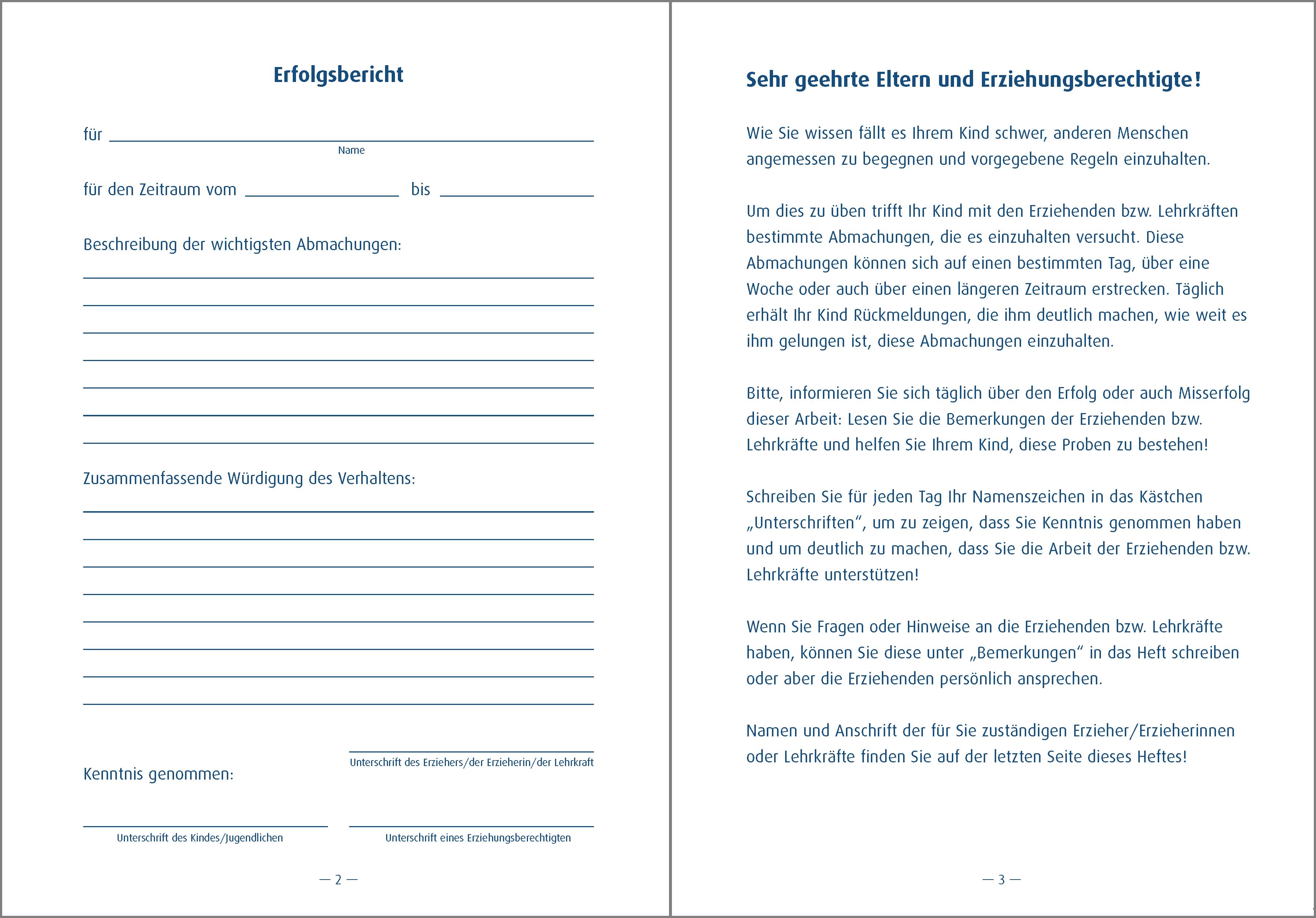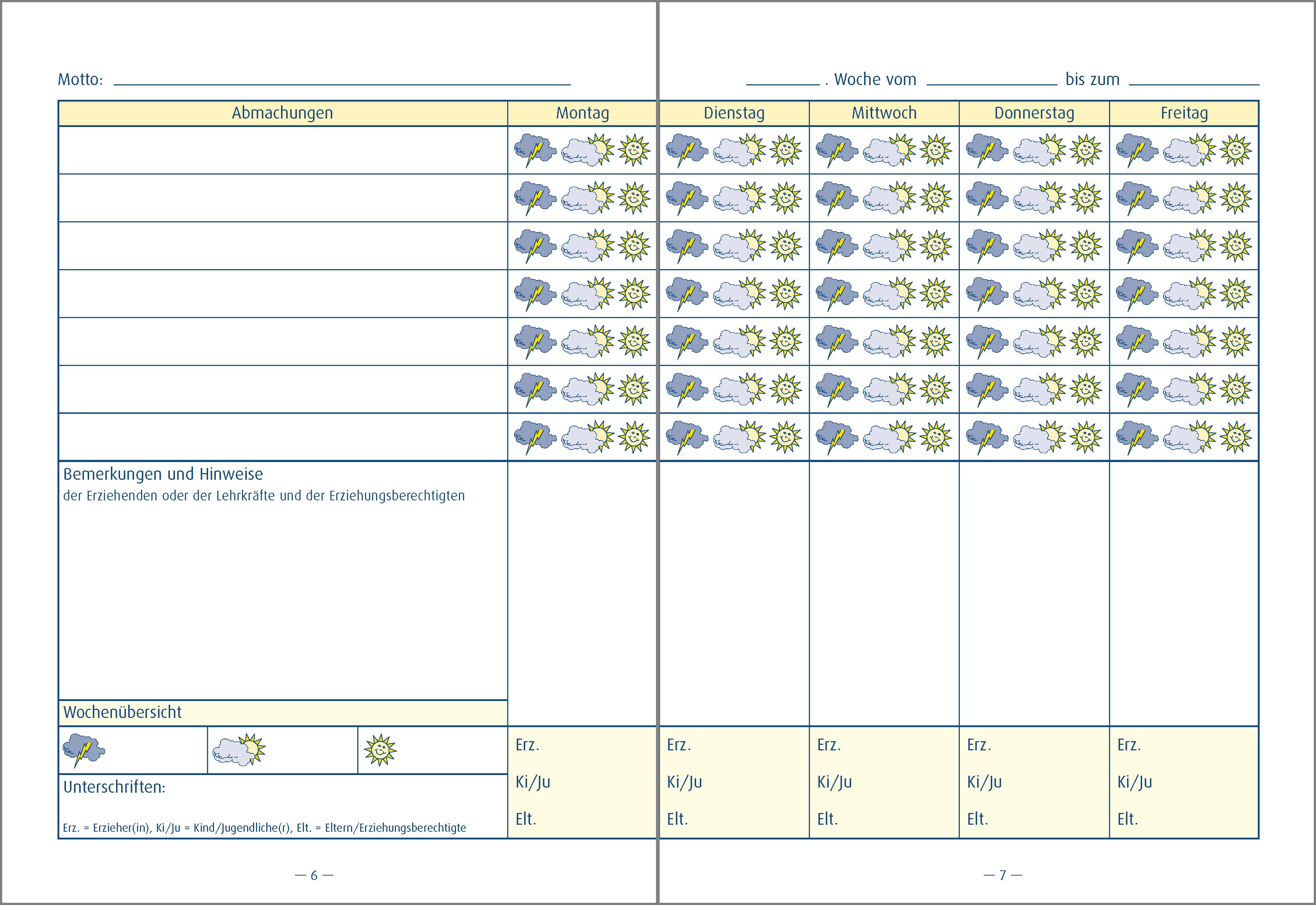 Dieses Heft wird mehrfach als Sonnenheft bezeichnet und erlaubt es Ihnen mit geringem Aufwand, die mit den Kindern getroffenen individuellen Abmachungen und deren Einhaltung in einer kurzen Aktennotiz festzuhalten und damit sowohl ihnen als auch den Eltern eine Rückmeldung über den Erfolg oder Misserfolg zu geben.Es ist eine aufwendige und meist auch frustrierende Tätigkeit, bei auffälligen Kindern Verhaltensänderungen zu bewirken. Das Schlüsselwort lautet hier: Konsequentes Handeln! Es Kommt darauf an, gemeinsam Abmachungen über erwünschtes verhalten zu treffen, Ihre Einhaltung zu kontrollieren und den Betroffenen eine schnelle Rückmeldung zu geben. So wird ihnen durch Bestätigung und auch durch Sanktionen bewusst, welches Verhalten akzeptabel ist und welches nicht. 7 Zeilen in den Wochenabschnitten, für eine stündliche oder tägliche oder wöchentliche Nutzung.