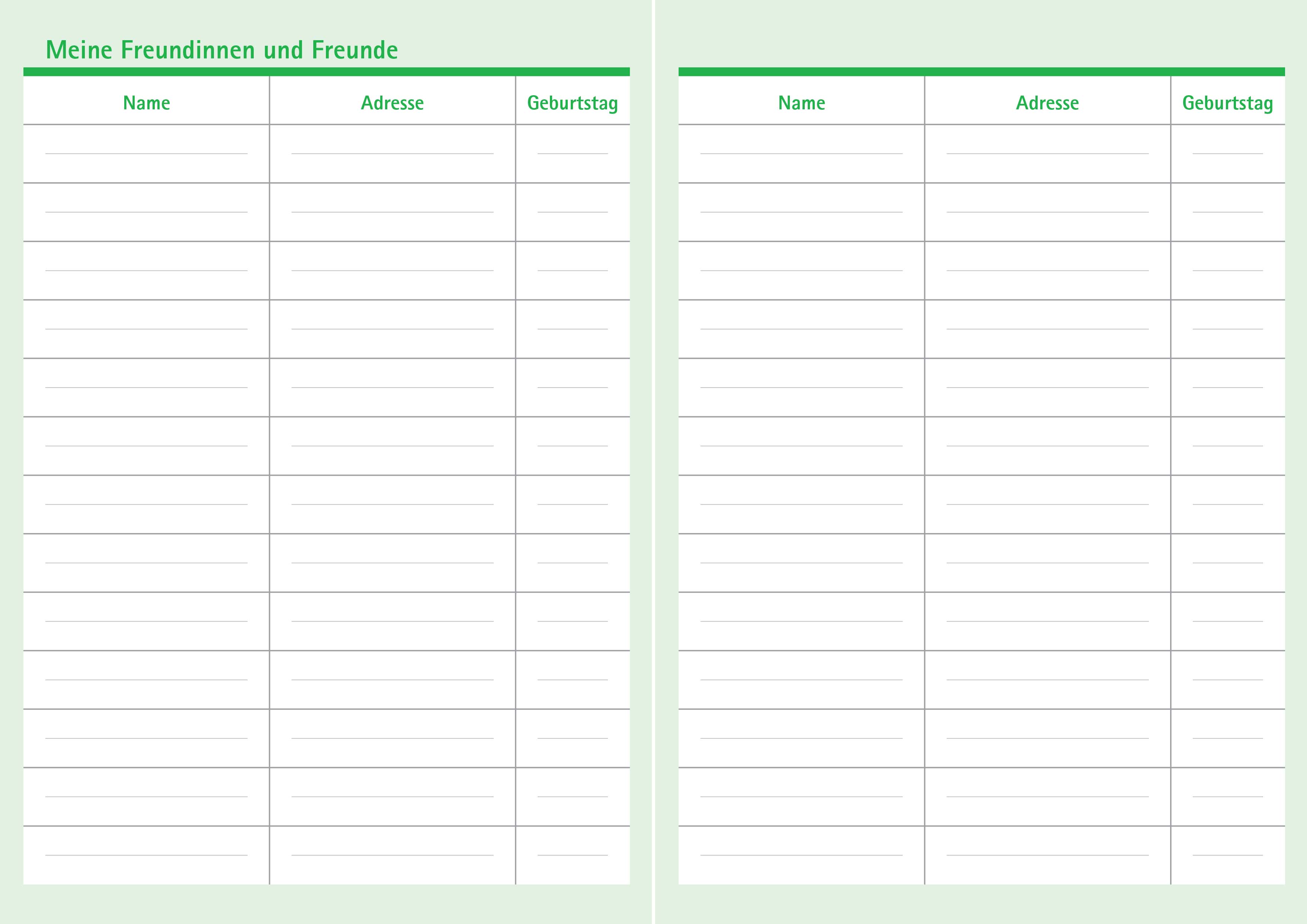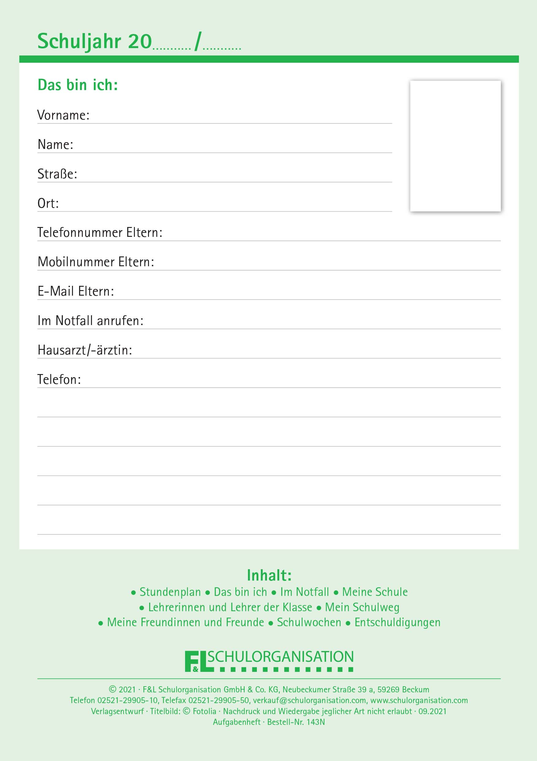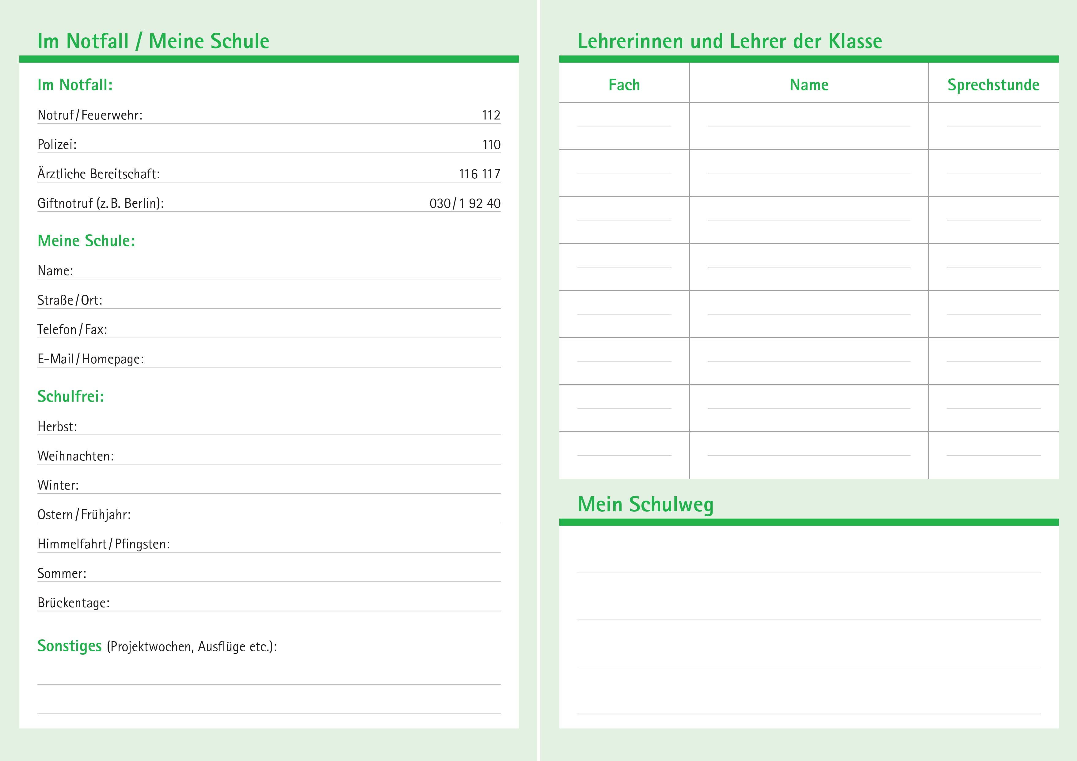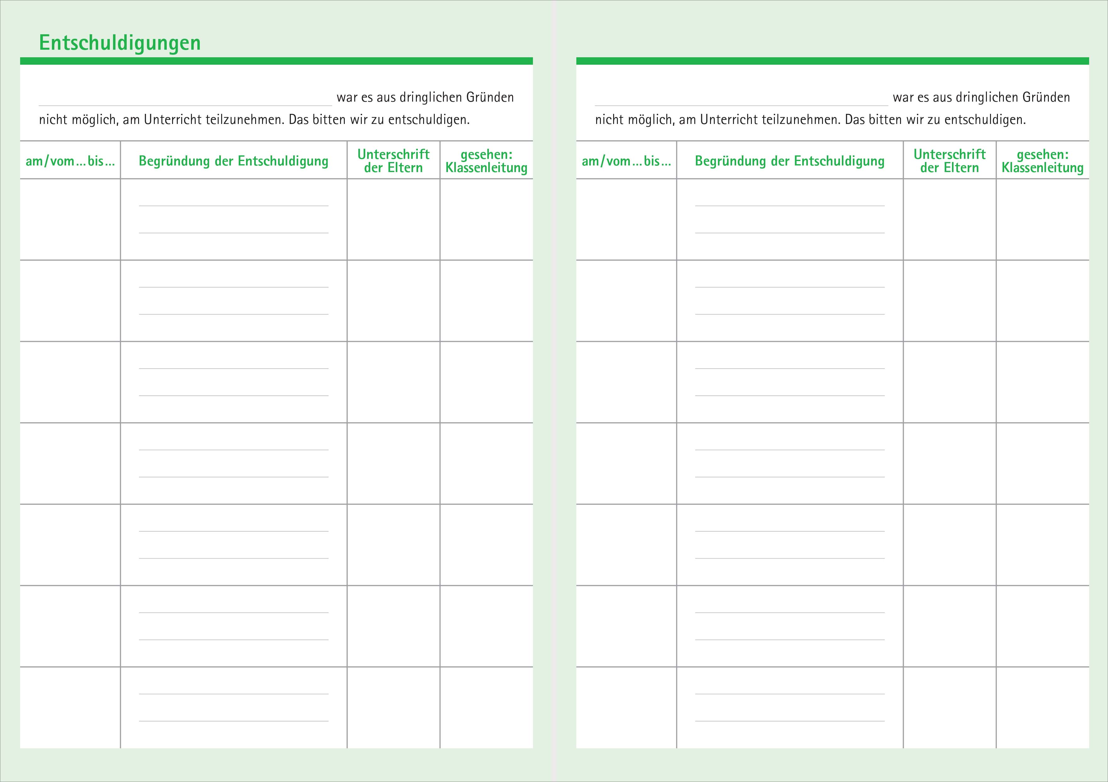 Durch die Seiten für den Stundenplan, Seiten für Entschuldigungen und andere Nützlichkeiten