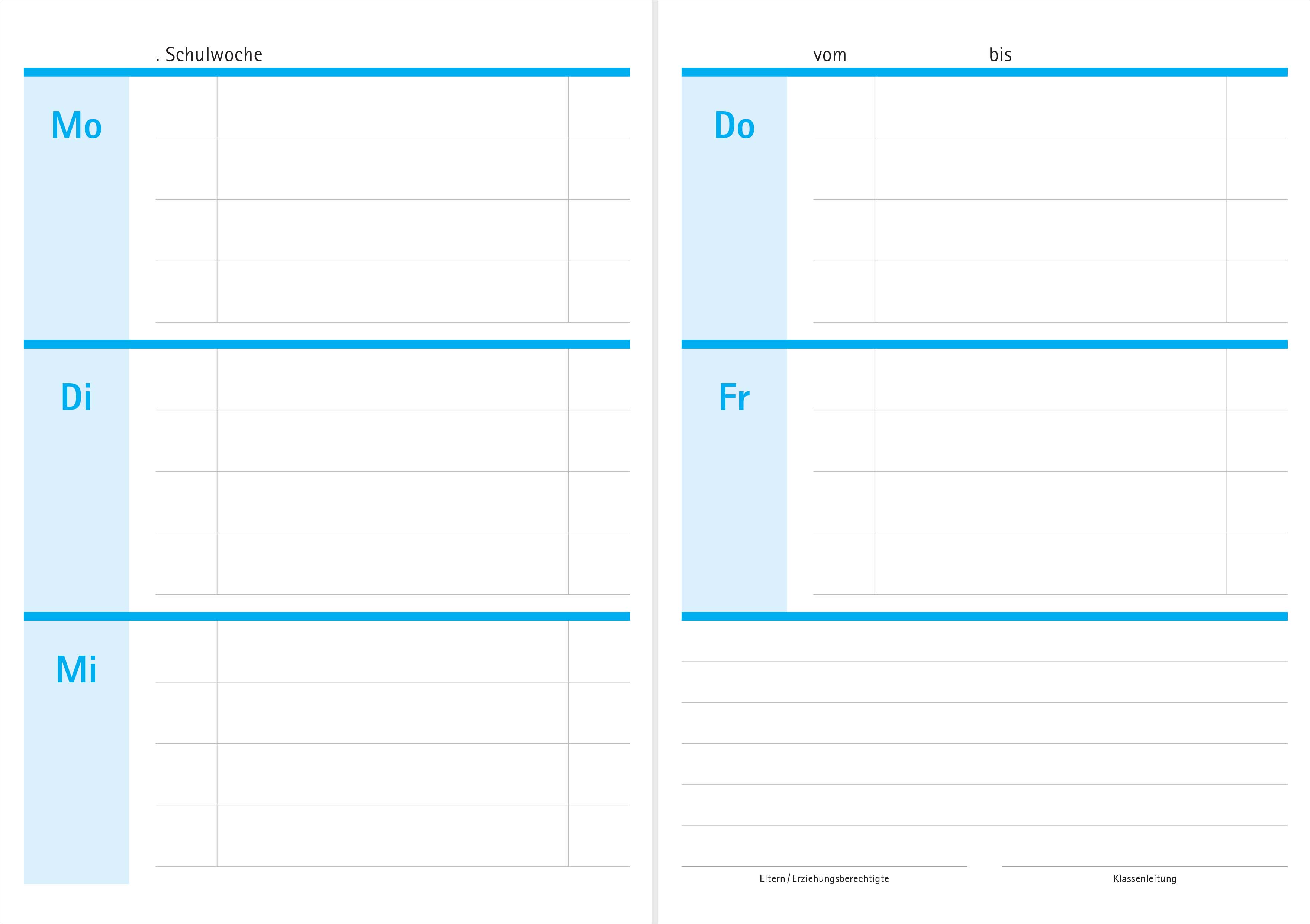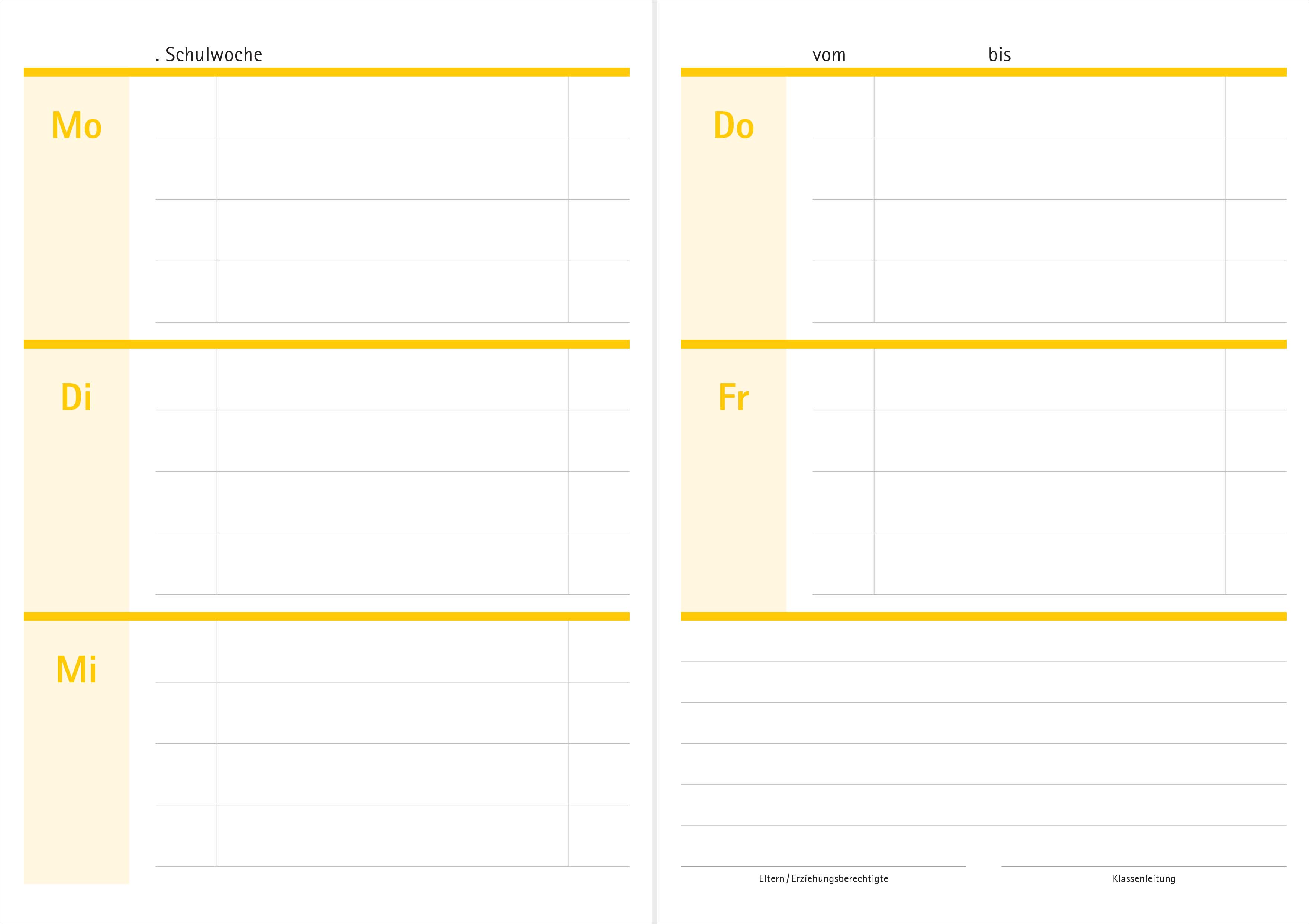 abgesetzten Unterrichtswochen finden Sie auch hier, jedoch ohne die Symbole für die Wochentage und die Unterrichtsfächer. Jede Woche enthält zudem ein Feld für die Kommunikation zwischen Schule und Elternhaus.