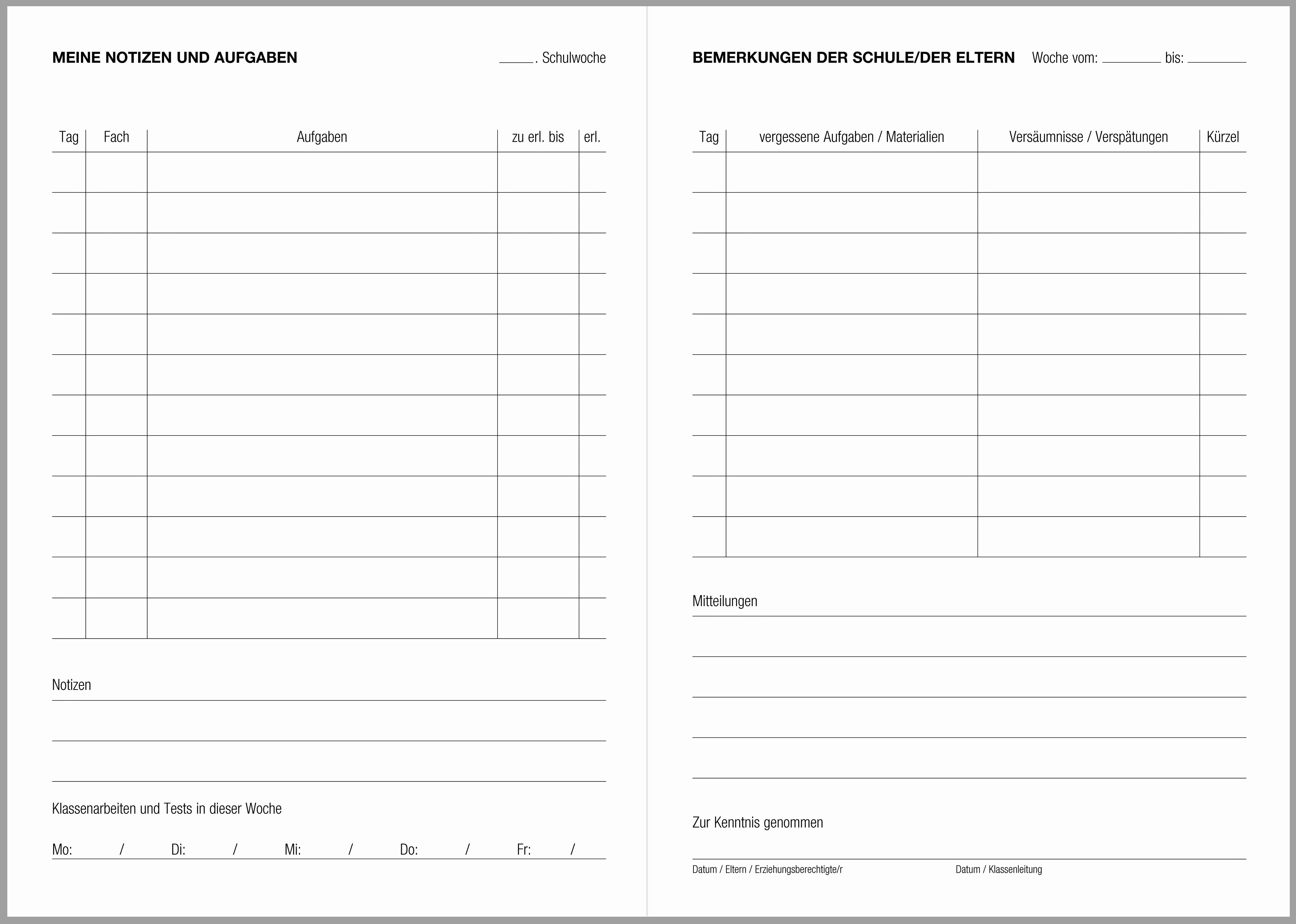 Mit Mitteilungsfeldern und wöchentlichen Unterschriftszeilen. Durch Seiten für den Stundenplan, Seiten