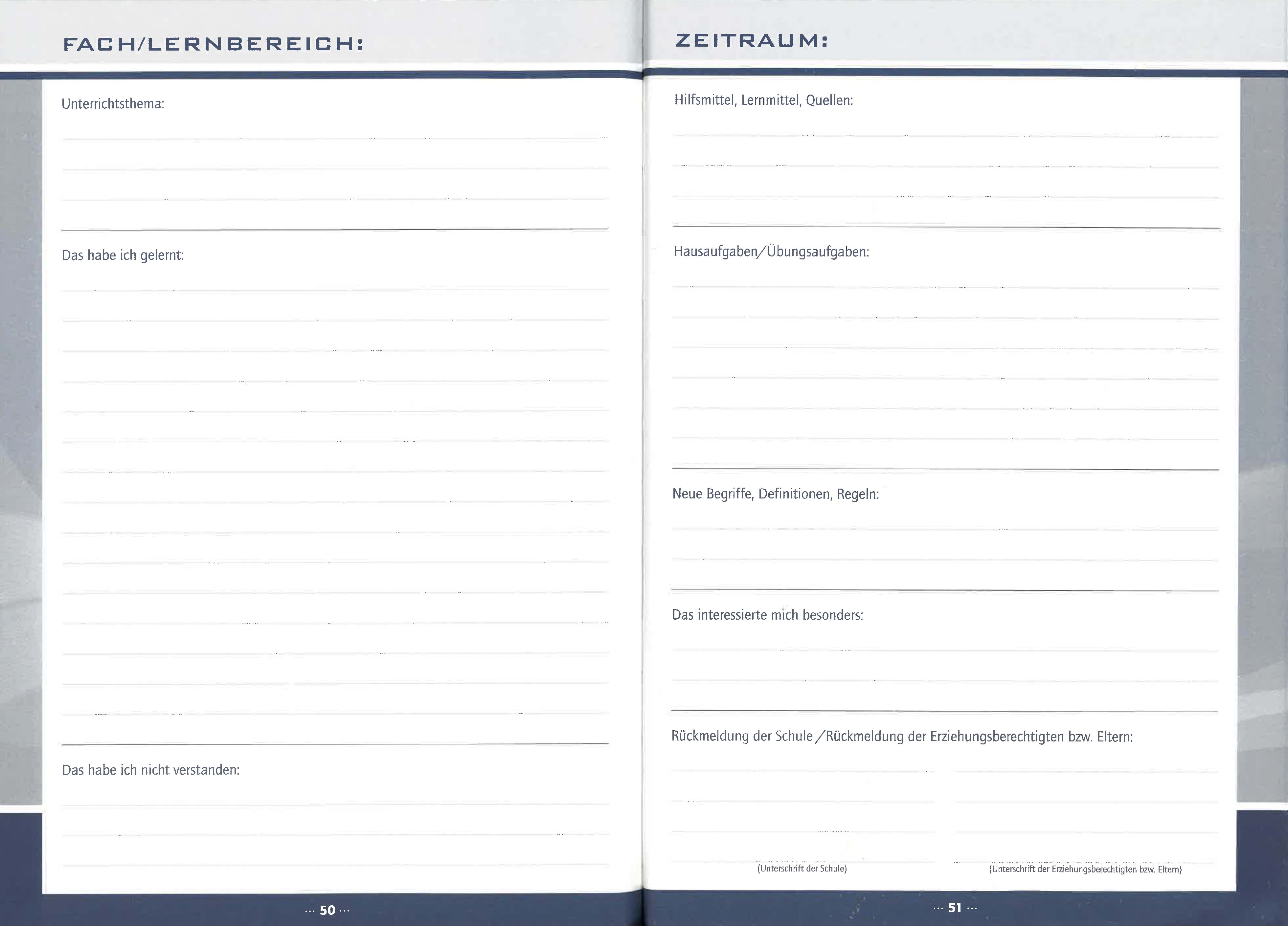 für Elternmitteilungen sowie Seiten für Lob und Tadel, Vereinbarungen und Entschuldigungen.