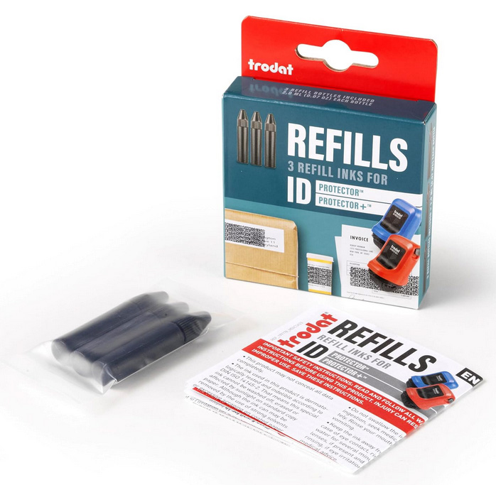 Passend für den ID Protector und auch für die Variante Plus erhalten Sie mit diesem 3er Pack schnelltrocknende und dokumentenechte Tinte für 3x weitere 100 Meter. Die Tinte kann schnell und einfach selbst nachgefüllt werden.