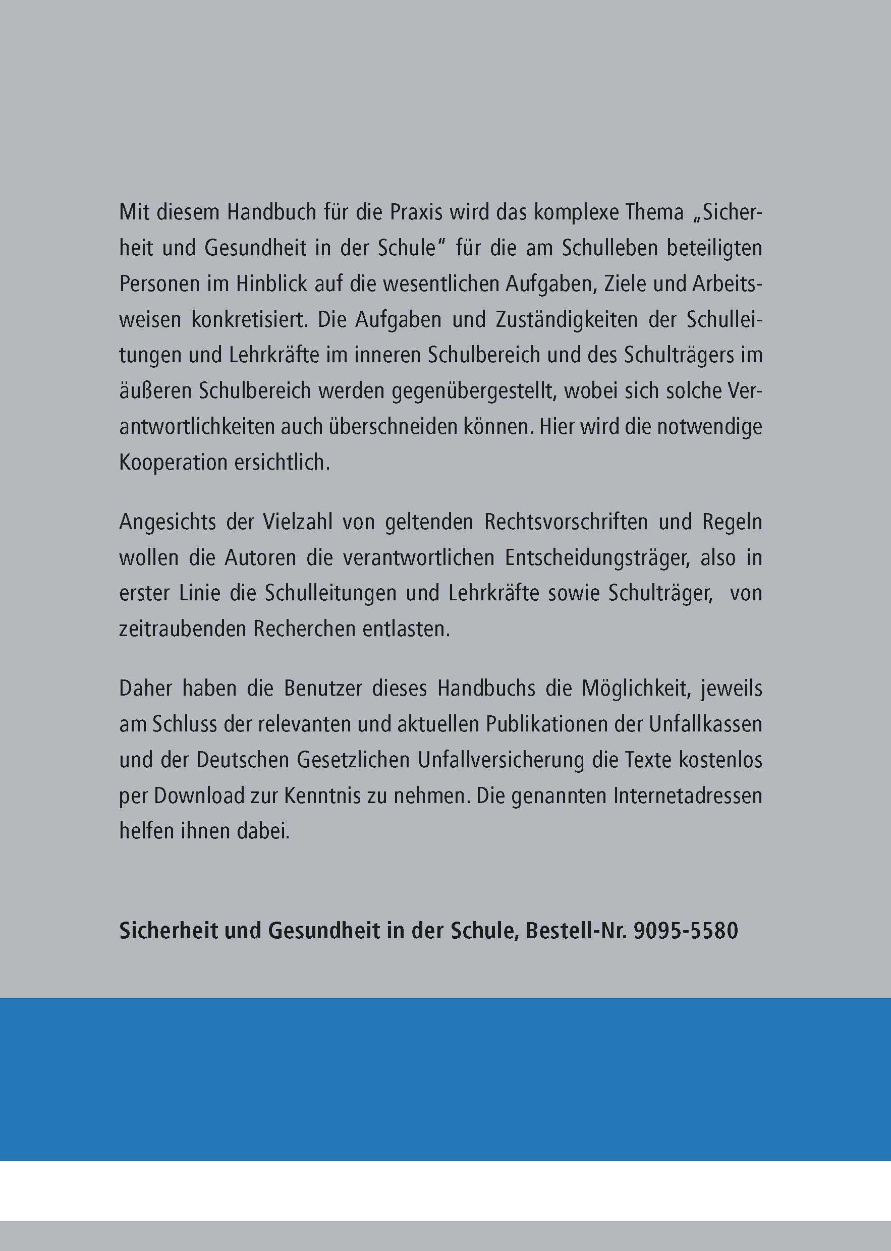 Mit diesem Handbuch für die Praxis wird das komplexe Thema „Sicherheit und Gesundheit in der Schule" für die am Schulleben beteiligten Personen im Hinblick auf die wesentlichen Aufgaben, Ziele und Arbeitsweisen konkretisiert. Die Aufgaben und Zuständigkeiten der Schulleitungen und Lehrkräfte im inneren Schulbereich und des Schulträgers im äußeren Schulbereich werden gegenübergestellt, wobei sich solche Verantwortlichkeiten auch überschneiden können. Hier wird die notwendige Kooperation ersichtlich. Angesichts der Vielzahl von geltenden Rechtsvorschriften und Regeln wollen die Autoren die verantwortlichen Entscheidungsträger, also in erster Linie die Schulleitungen und Lehrkräfte sowie Schulträger, von zeitraubenden Recherchen entlasten. Daher haben die Benutzer dieses Handbuchs die Möglichkeit, jeweils am Schluss der relevanten und aktuellen Publikationen der Unfallkassen und der Deutschen Gesetzlichen Unfallversicherung die Texte kostenlos als Online-Informationsquelle zur Kenntnis zu nehmen. Die genannten Internetadressen helfen ihnen dabei.