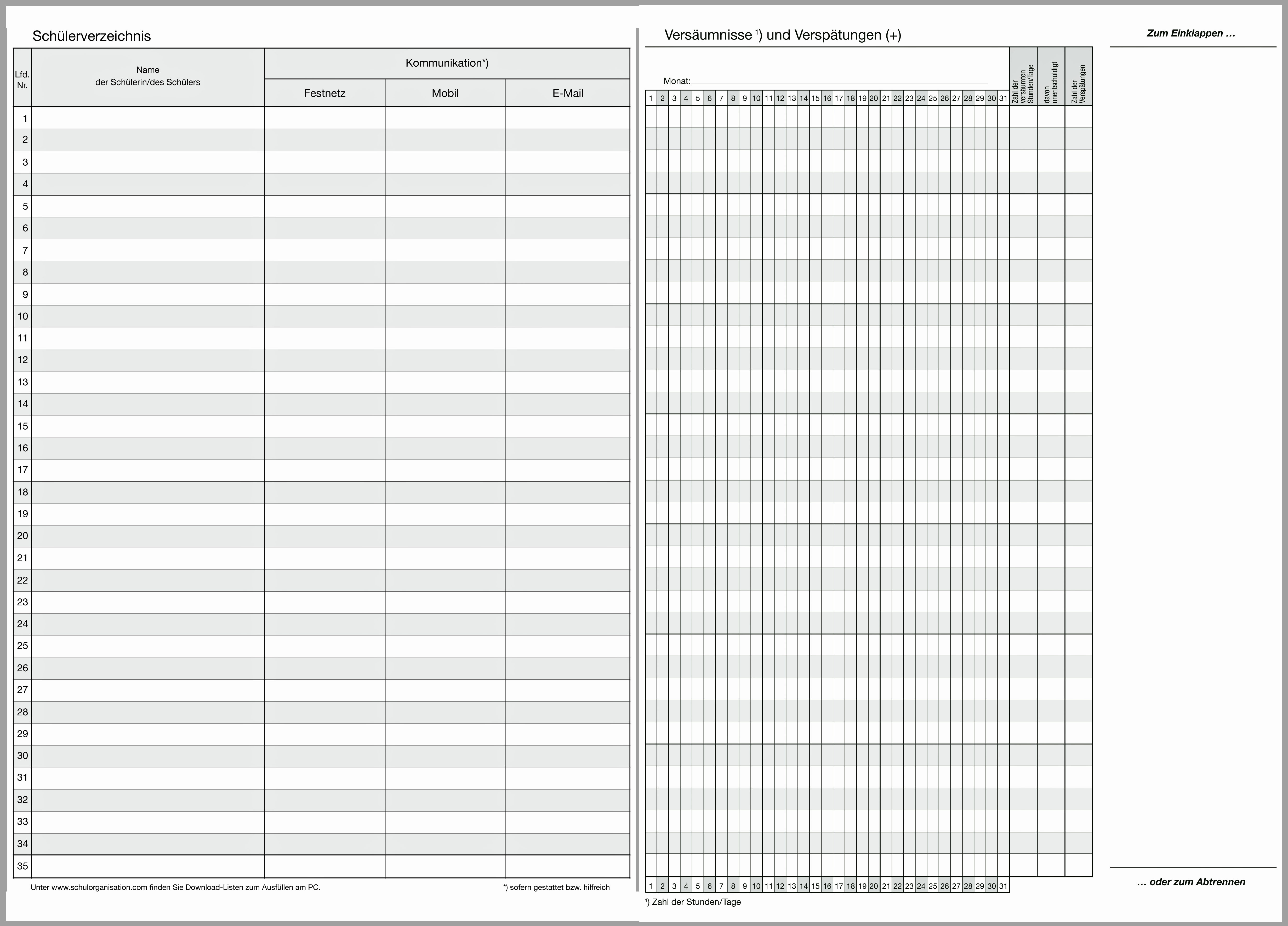 Beiheft zum Klassenbuch zum Eintragen der Versäumnisse und Verspätungen,