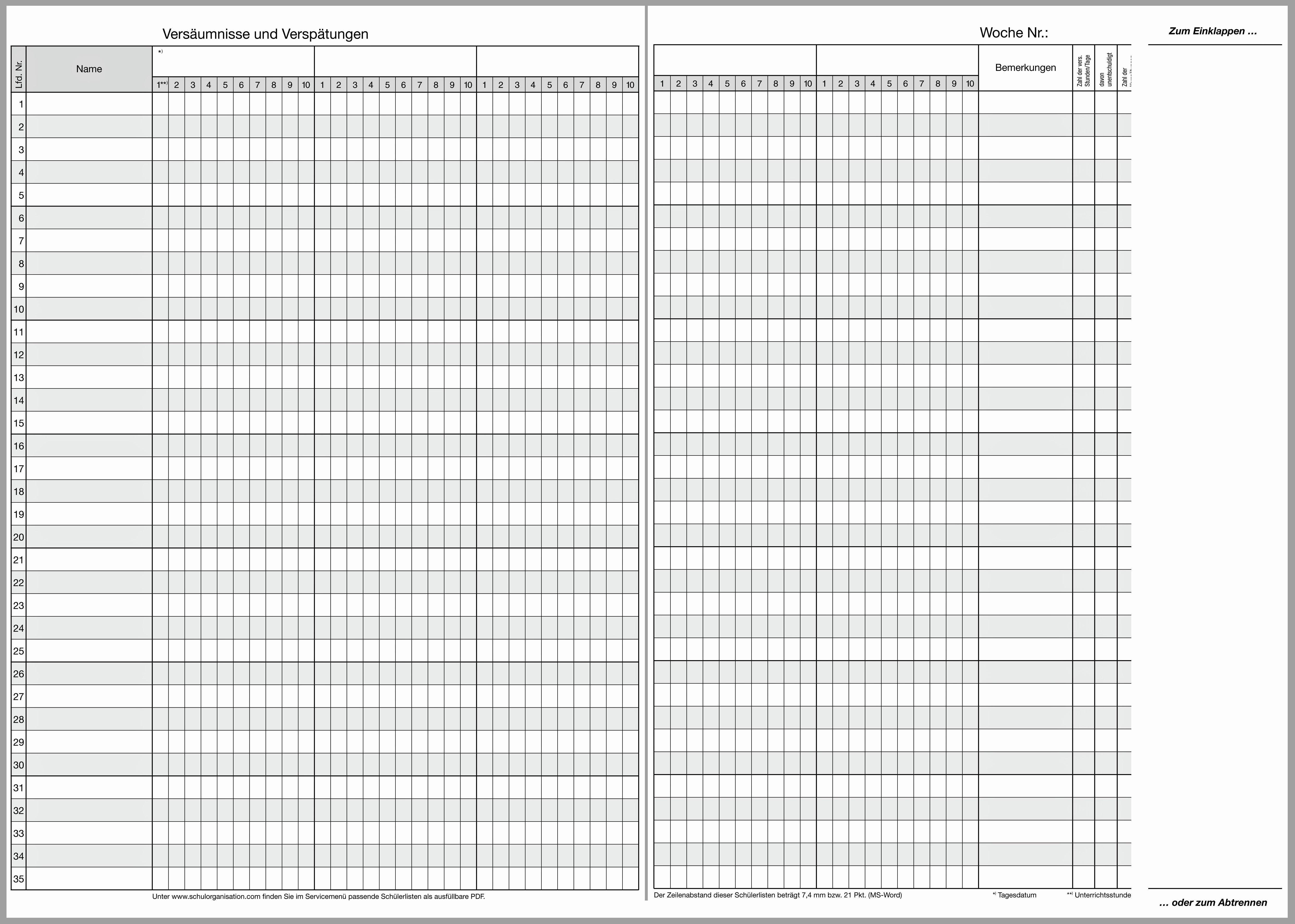 Beiheft zum Klassenbuch für den stündlichen Eintrag der Versäumnisse und Verspätungen für