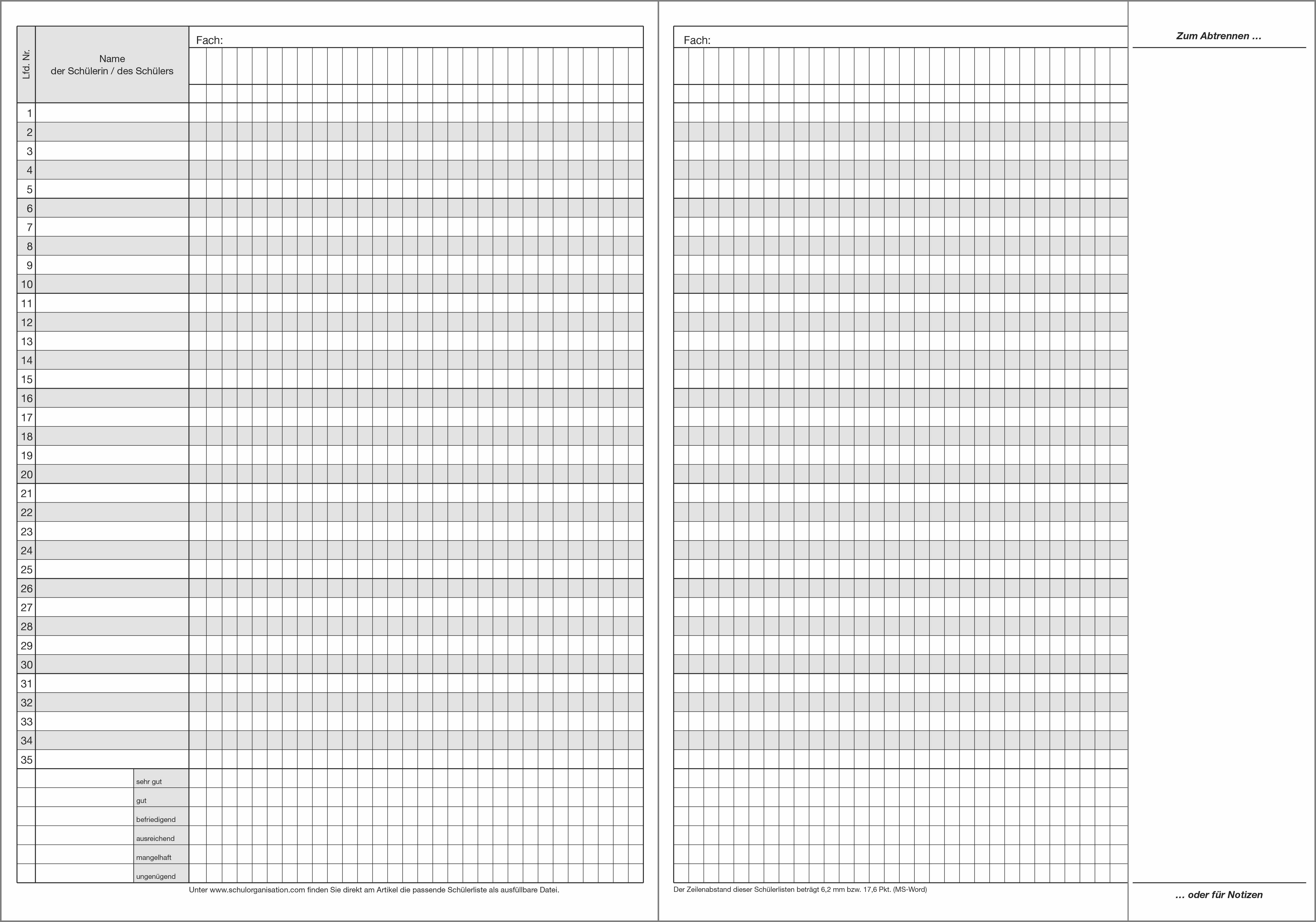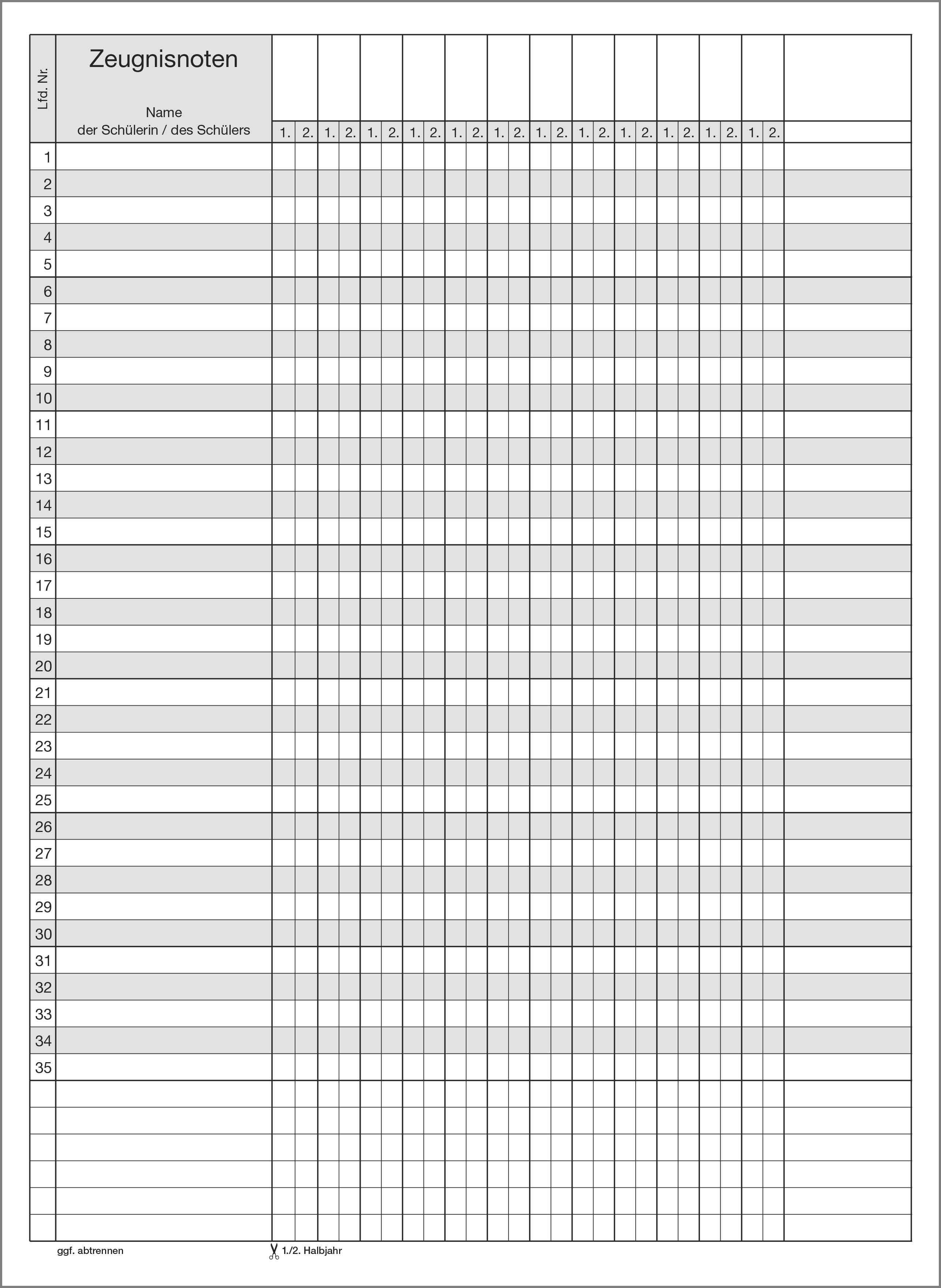 30 Eintragungsmöglichkeiten je Seite sowie einer zusammenfassenden Zensurenliste.