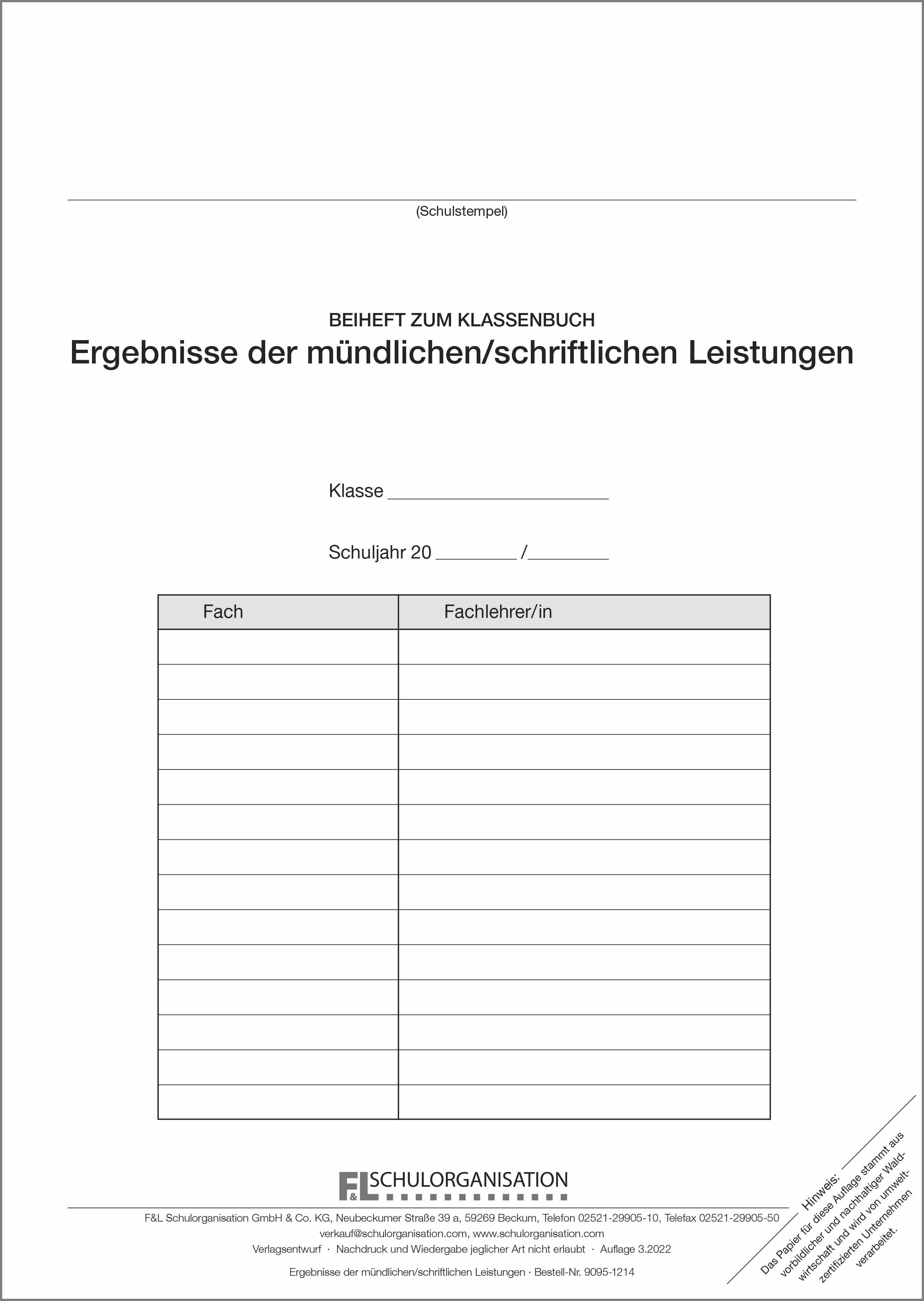Beiheft zum Klassenbuch zum Eintragen der Ergebnisse der mündlichen und schriftlichen