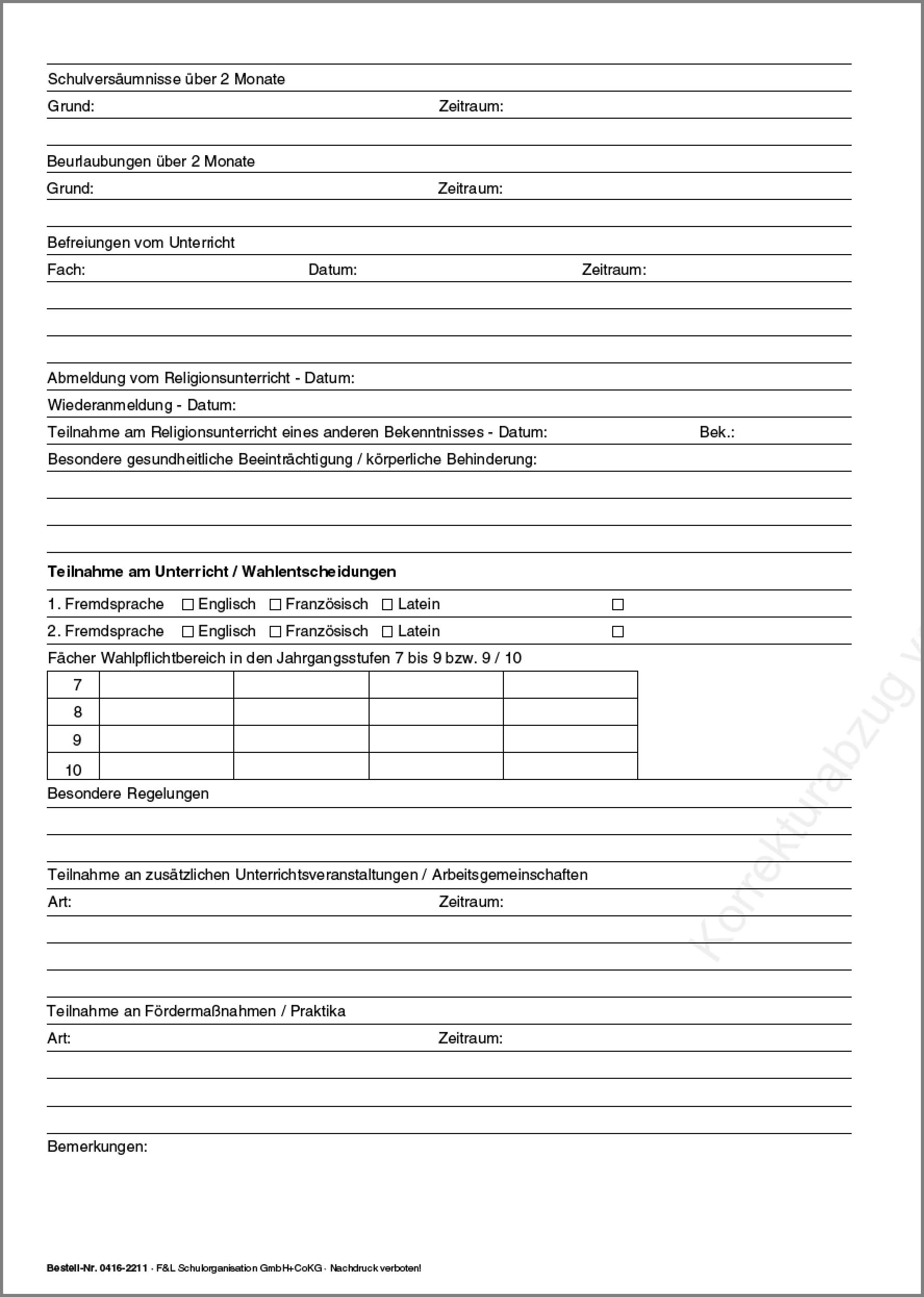 Schülerstammblatt Sekundarstufe I mit zusätzlichen Eintragungsmöglichkeiten zumArbeits- und Sozialverhalten.