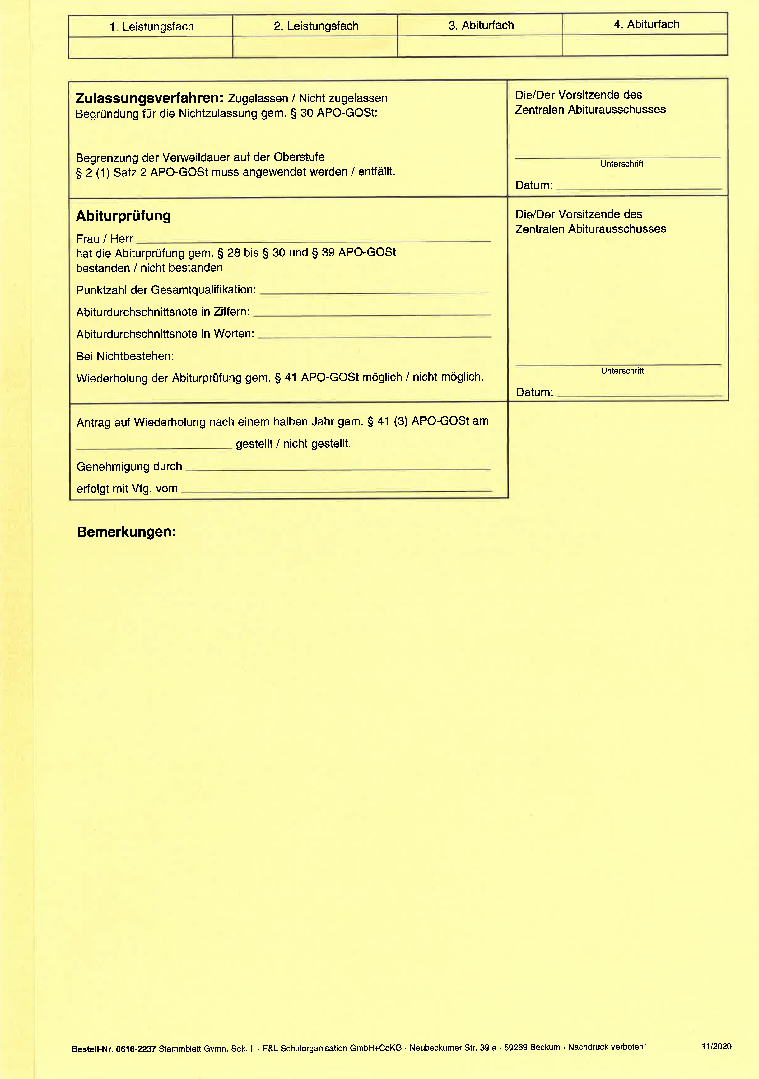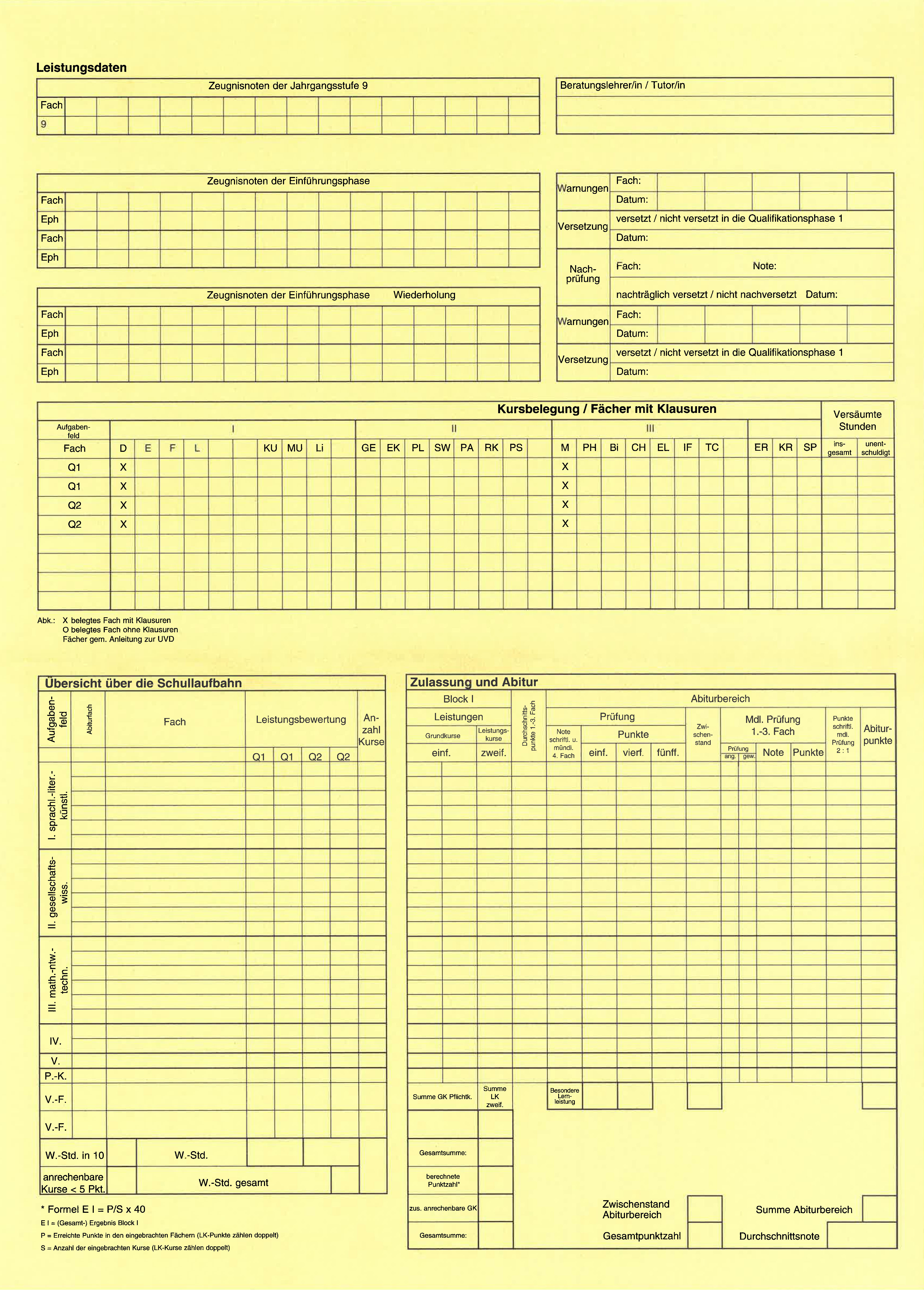 Schülerstammblatt gymnasiale Oberstufe NRW, Karteikarte, Doppelblatt, für die gymnasiale Oberstufe am Gymnasium und an der Gesamtschule, aktuelle Fassung.