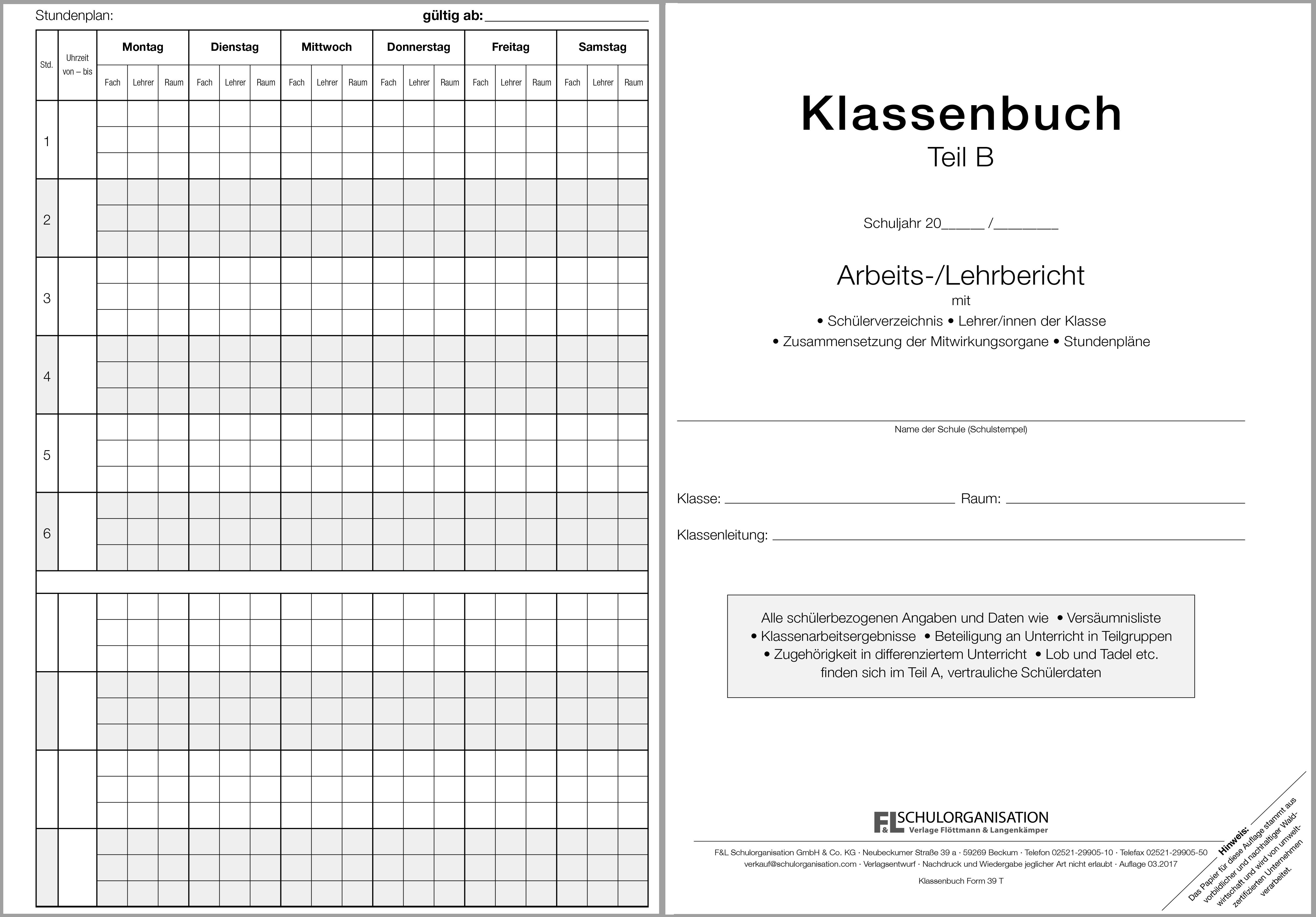 Flöttmann Klassenbuch Teil B (Lehrbericht) mit Schülerverzeichnis in Kurzfassung, Klassenämter und Stundenpläne und den Bericht von Montag bis Freitag. Die Schülerdaten und die Versäumnisse und Verspätungen werden in Teil A geführt.