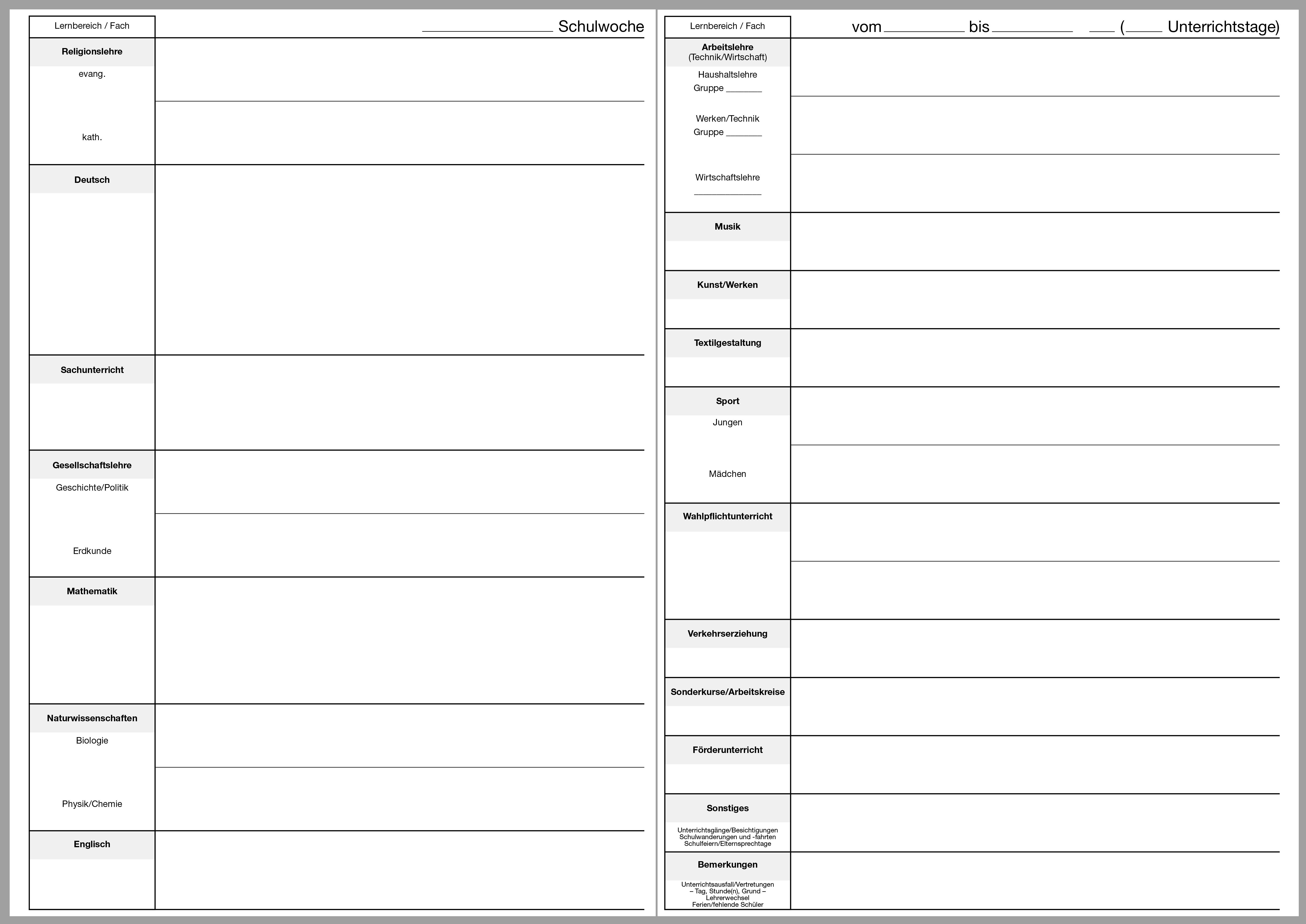 Dieser Teil B für den wochenweisen Bericht ist nach Fächern der Förderschule NRW gegliedert, dazu passt der Teil A Schülerdaten für die Förderschule Bestell-Nr. 1900XX (XX gleich aktuelle Jahreszahl).