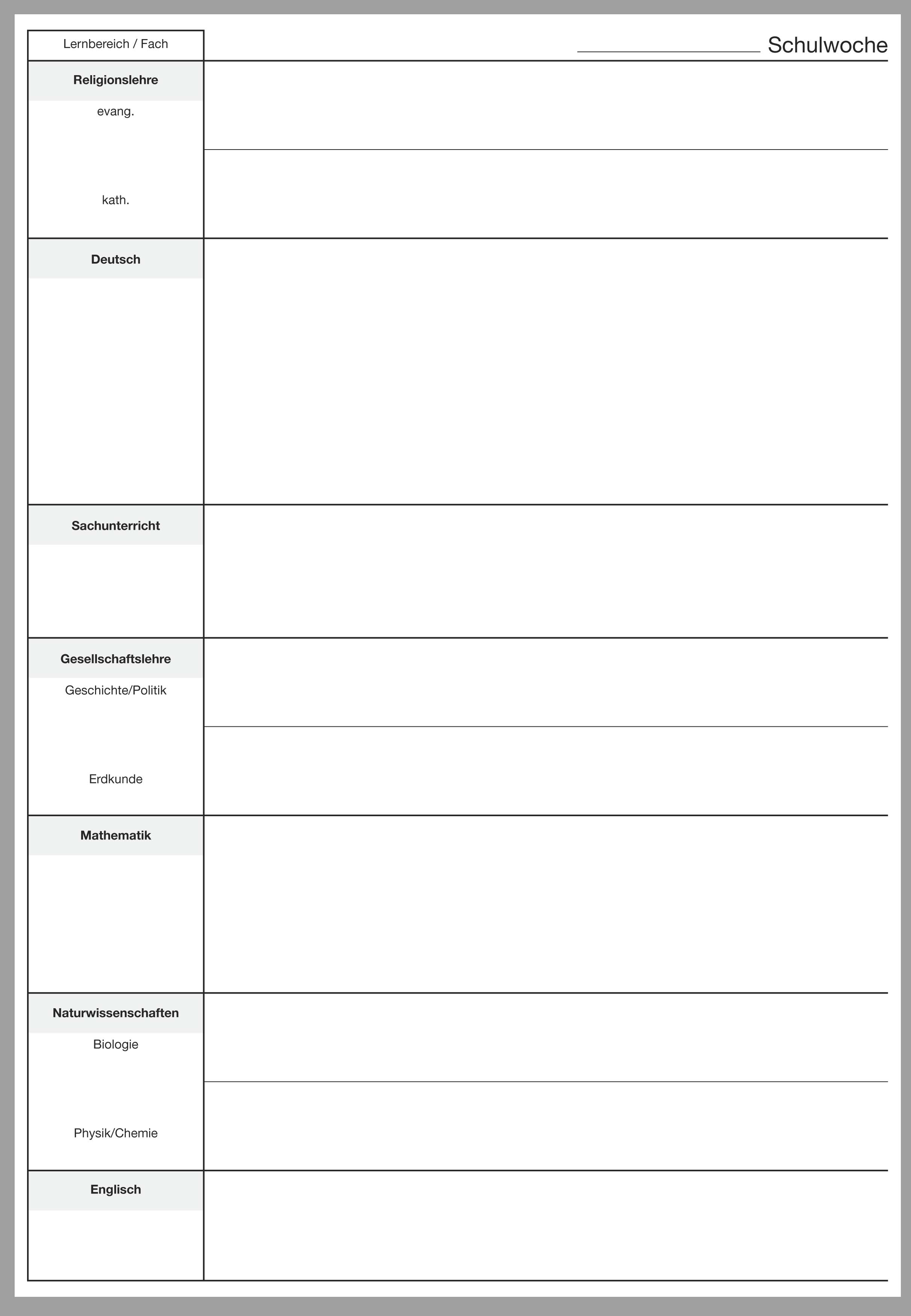 Dieser Teil B für den wochenweisen Bericht ist nach Fächern der Förderschule NRW gegliedert, dazu passt der Teil A Schülerdaten für die Förderschule Bestell-Nr. 1900XX (XX gleich aktuelle Jahreszahl).
