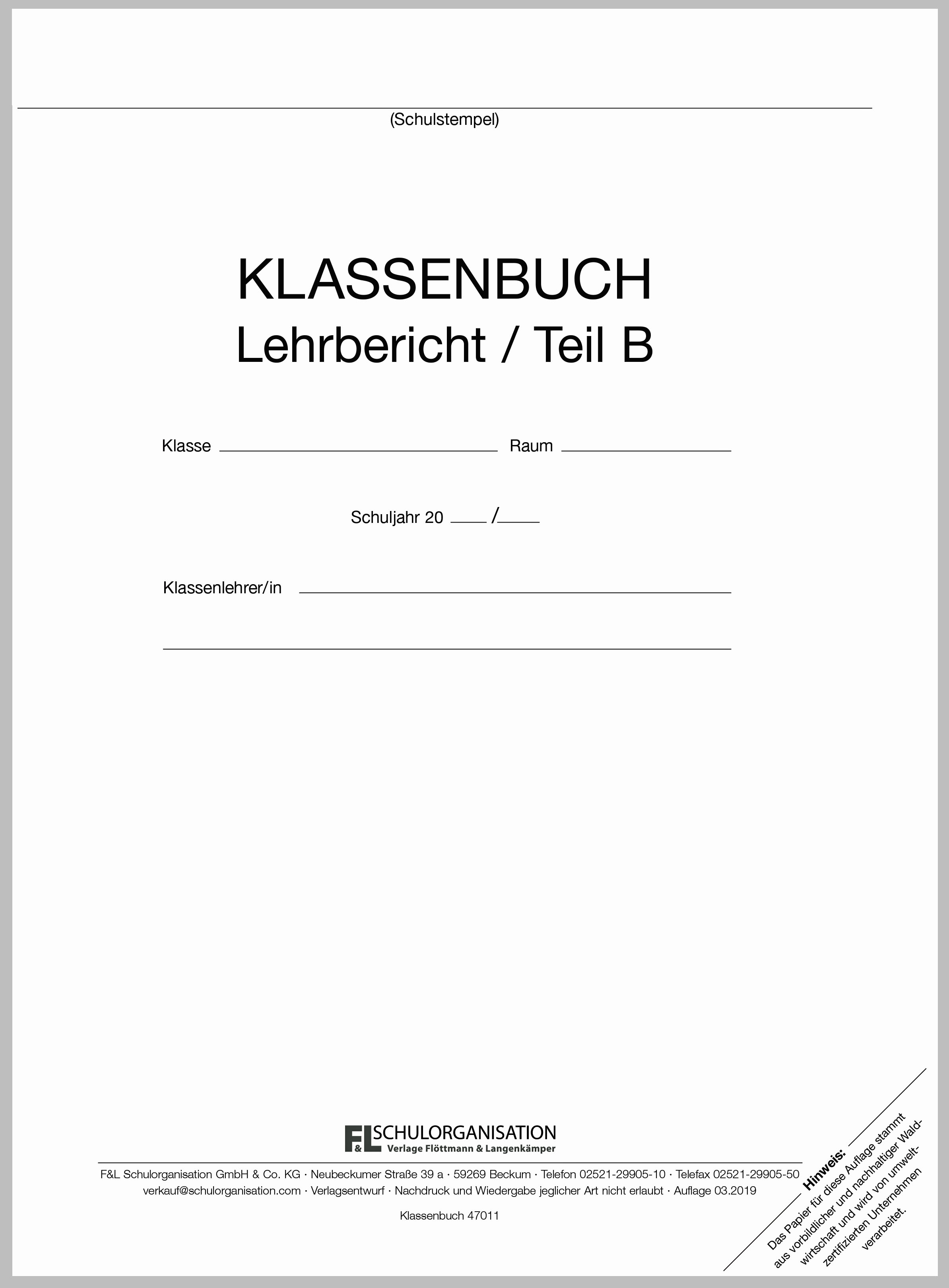 Das Flöttmann Klassenbuch besteht aus dem Teil B (Lehrbericht) und dem Teil A (Versäumnisse und Verspätungen und vetrauliche Schülerdaten). Diese Teile sind getrennt zu bestellen, es erfolgt keine automatische gemeinsame Lieferung.