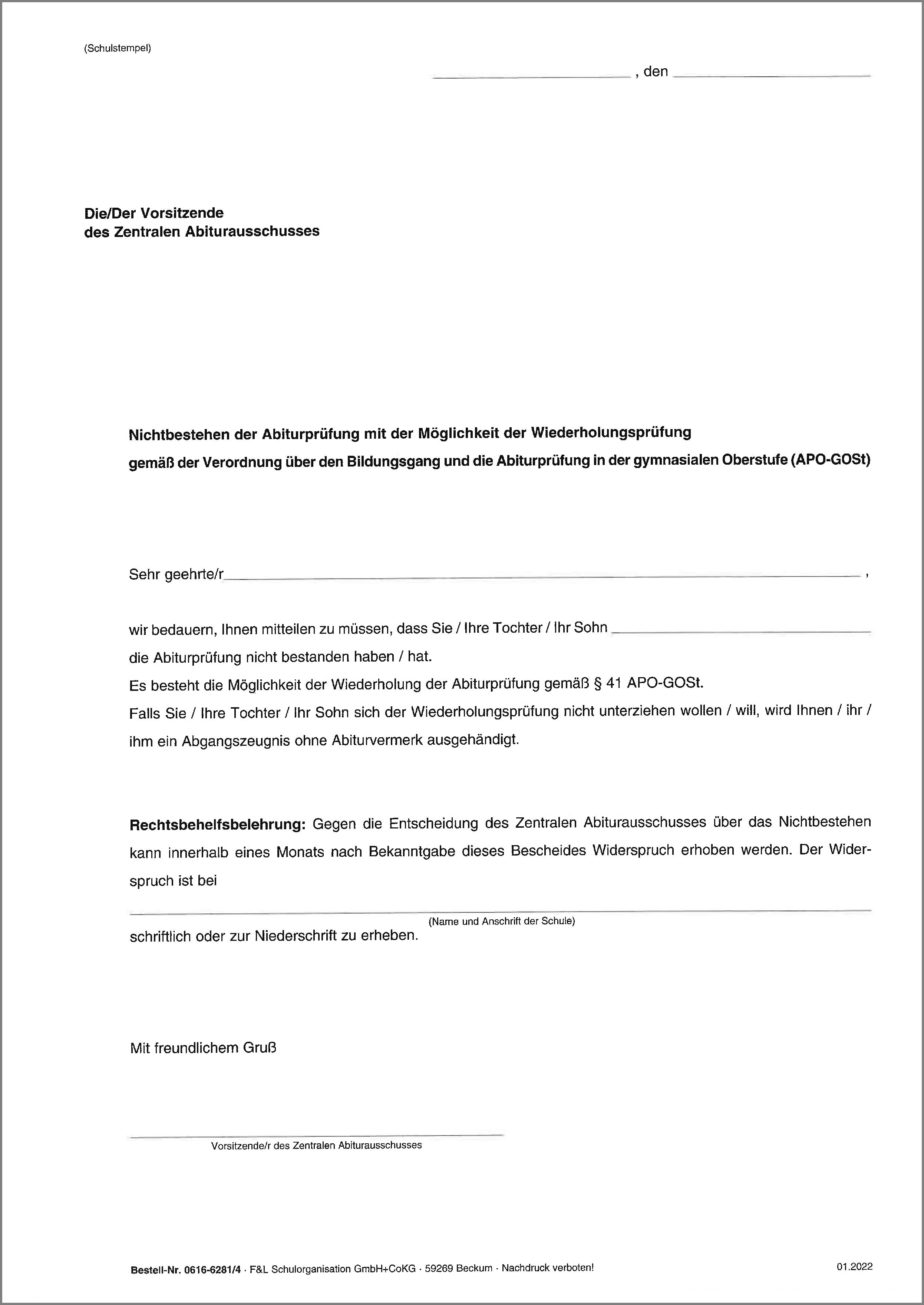 Mitteilung über das Nichtbestehen der Abiturprüfung mit der Möglichkeit der Wiederholungsprüfung nach einem Jahr.