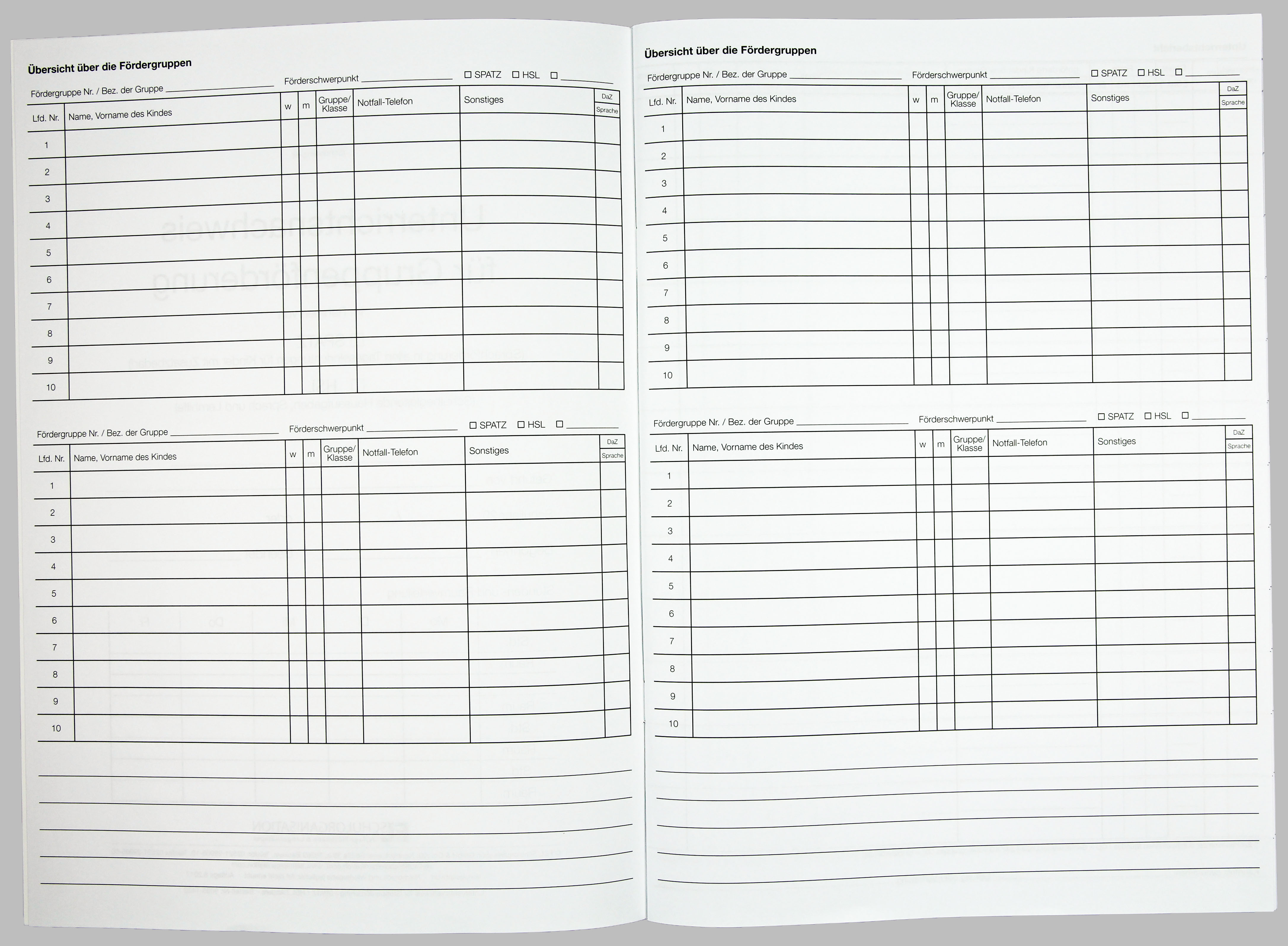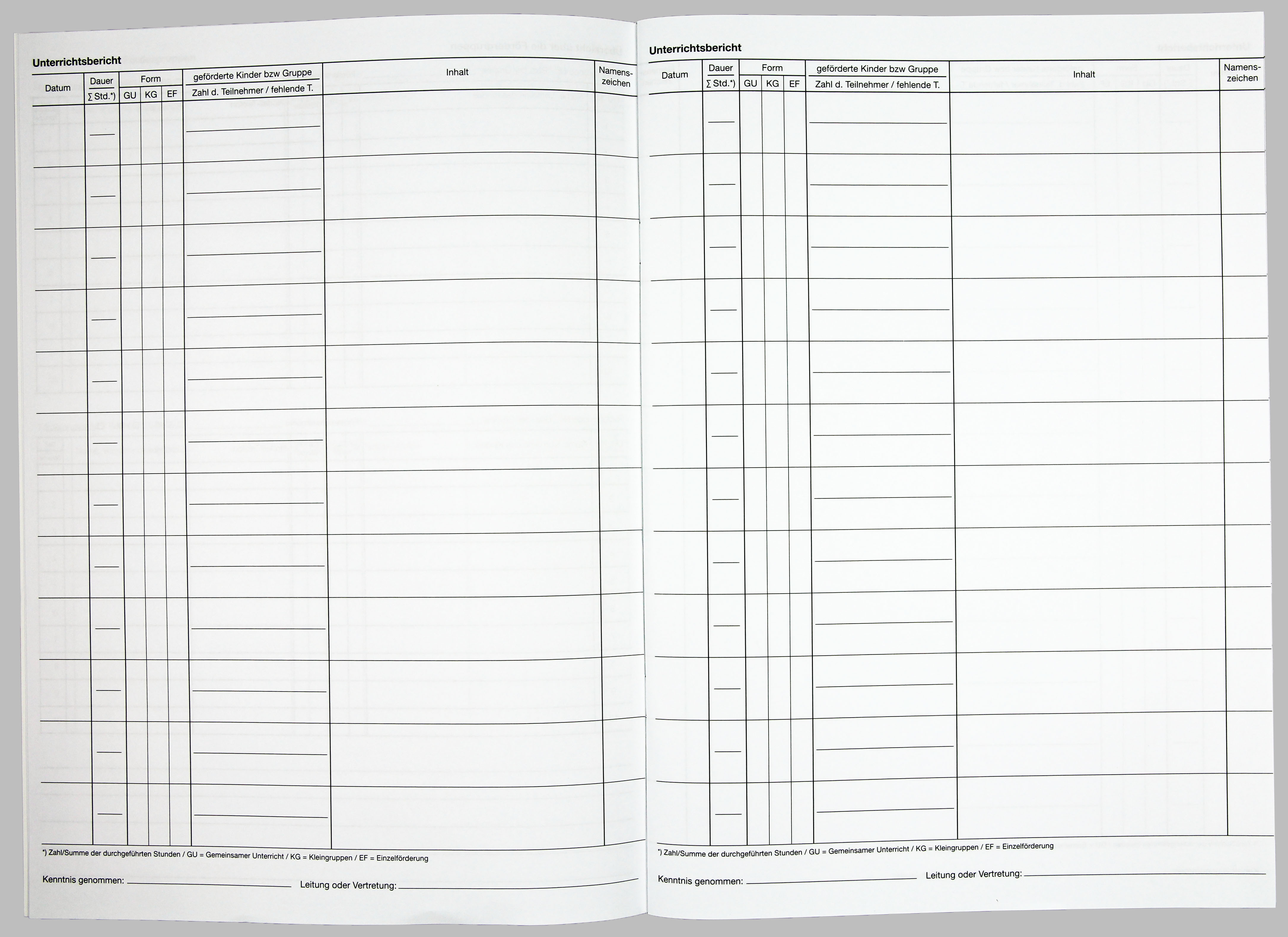 Dieser Nachweis ist speziell für Sprachförderungen in Tageseinrichtungen für Kinder bzw. Schülerinnen und Schüler mit Zusatzbedarf oder für schulbegleitende Hausaufgaben, Sprach- und Lernhilfen (HSL) erstellt und es hilft den Förderkräften, einen übersichtlichen und zeitsparenden Unterrichtsnachweis zu erstellen. Es enthält offene Listen für die Fördergruppen (10er Gruppen). Der Unterrichtsnachweis ist für bis zu 480 Eintragungen bzw. für 4 Gruppen à 120 Stunden ausgelegt. Weiterhin sind Seiten für begleitende Elternprojekte, neutrale Notizseiten und eine Übersicht für die Stundenabrechnung enthalten.