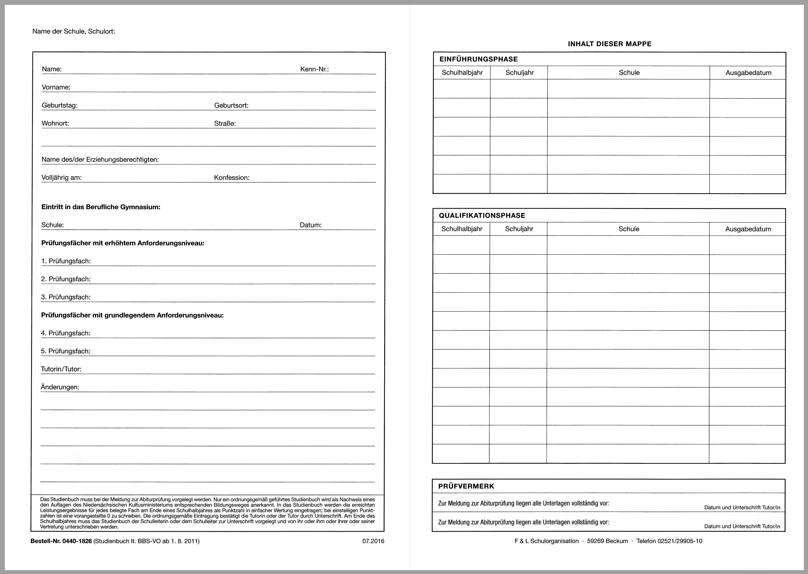Studienbuch als Sammelmappe mit der praktischen Klemmleiste für Leistungsnachweise am beruflichen Gymnasium. Durch das Überformat der Mappe können die Leistungsnachweise ohne Überstand aufgenommen werden.