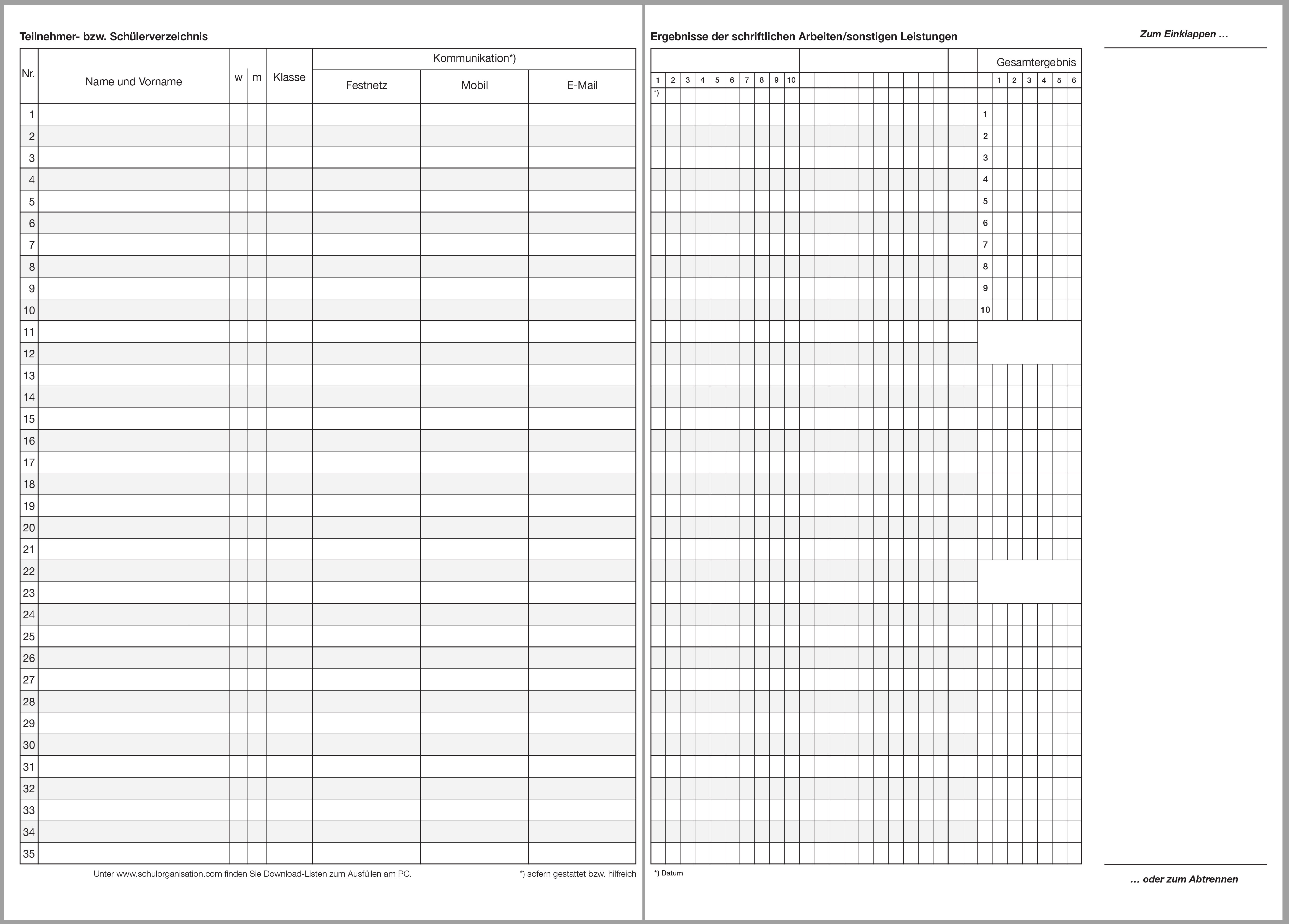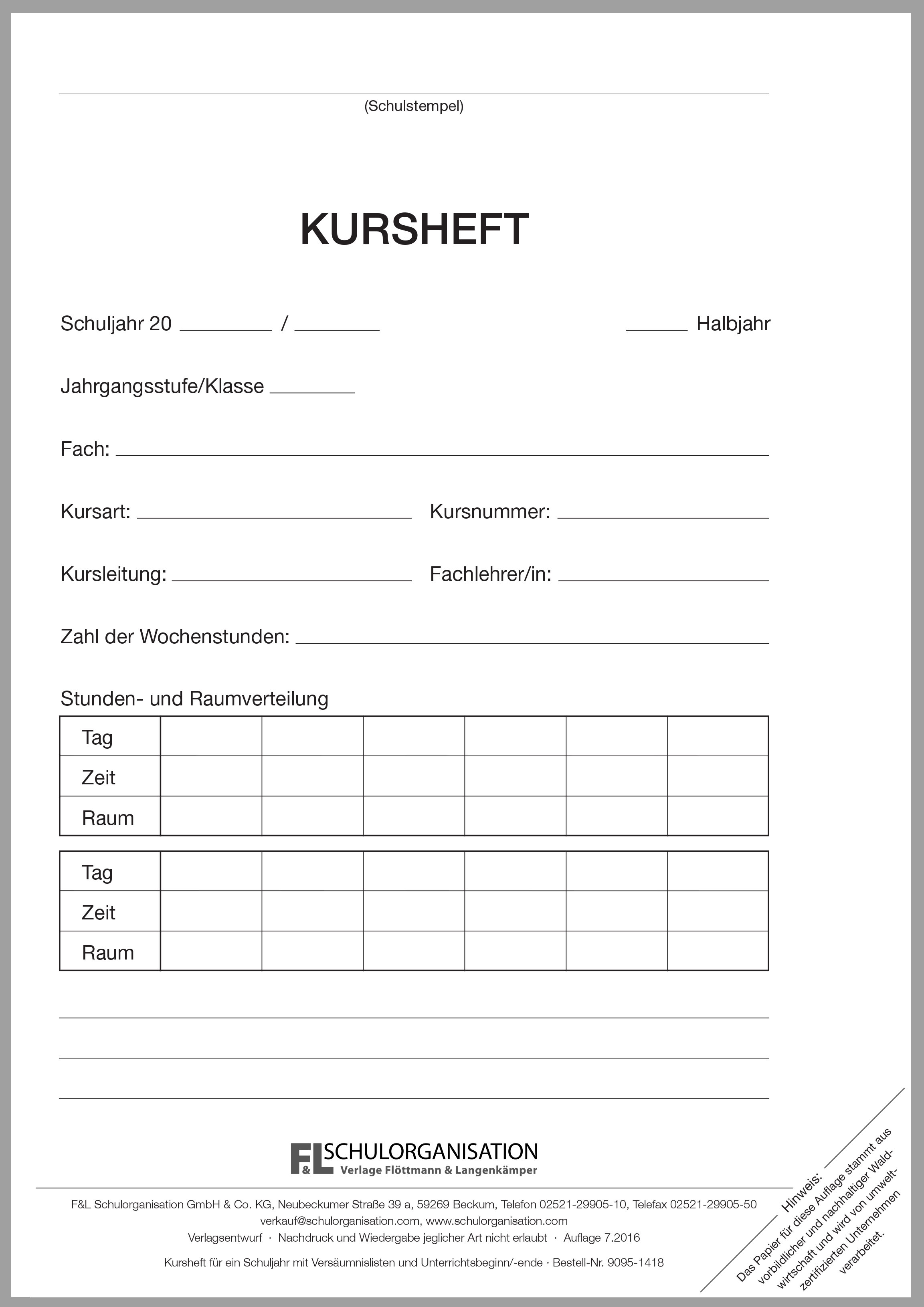 Kursheft für ein Schuljahr mit Versäumnislisten