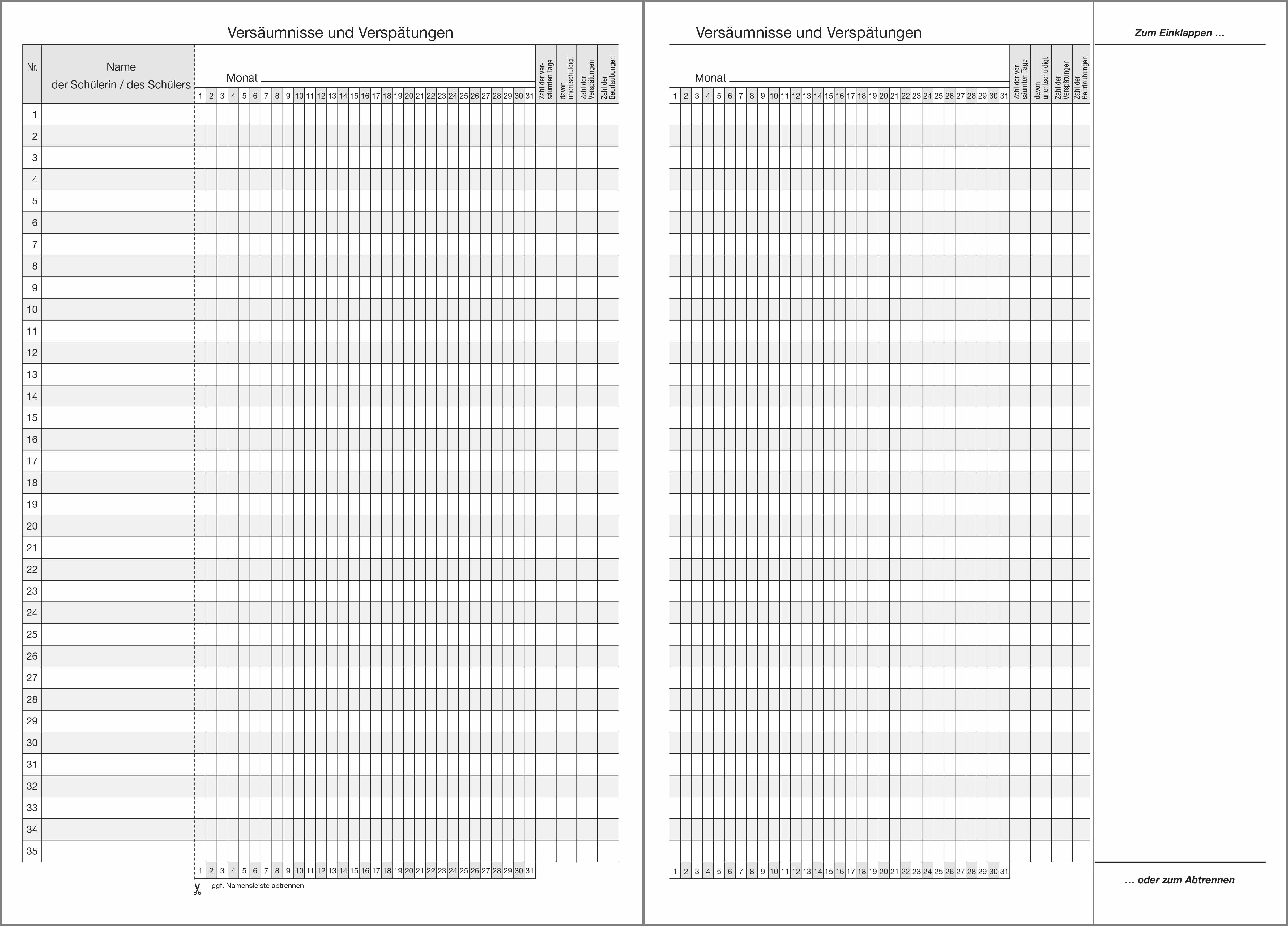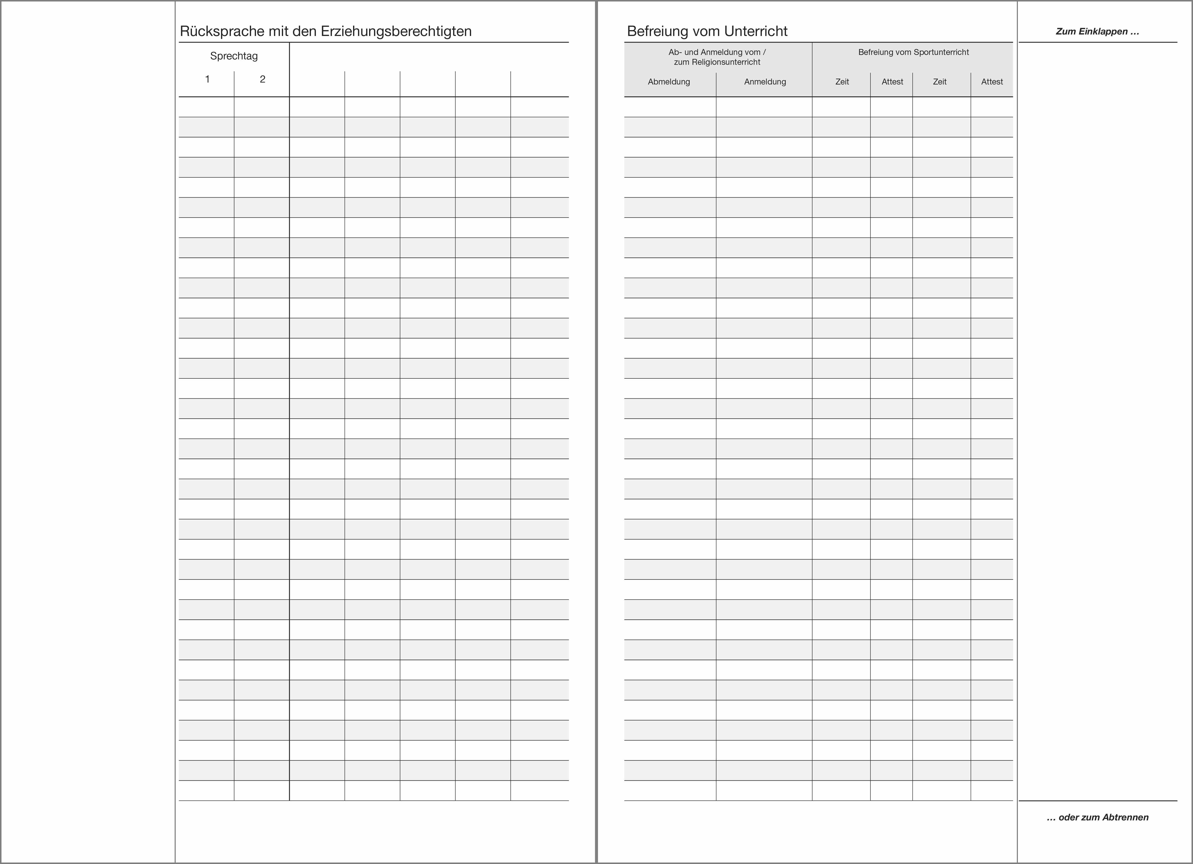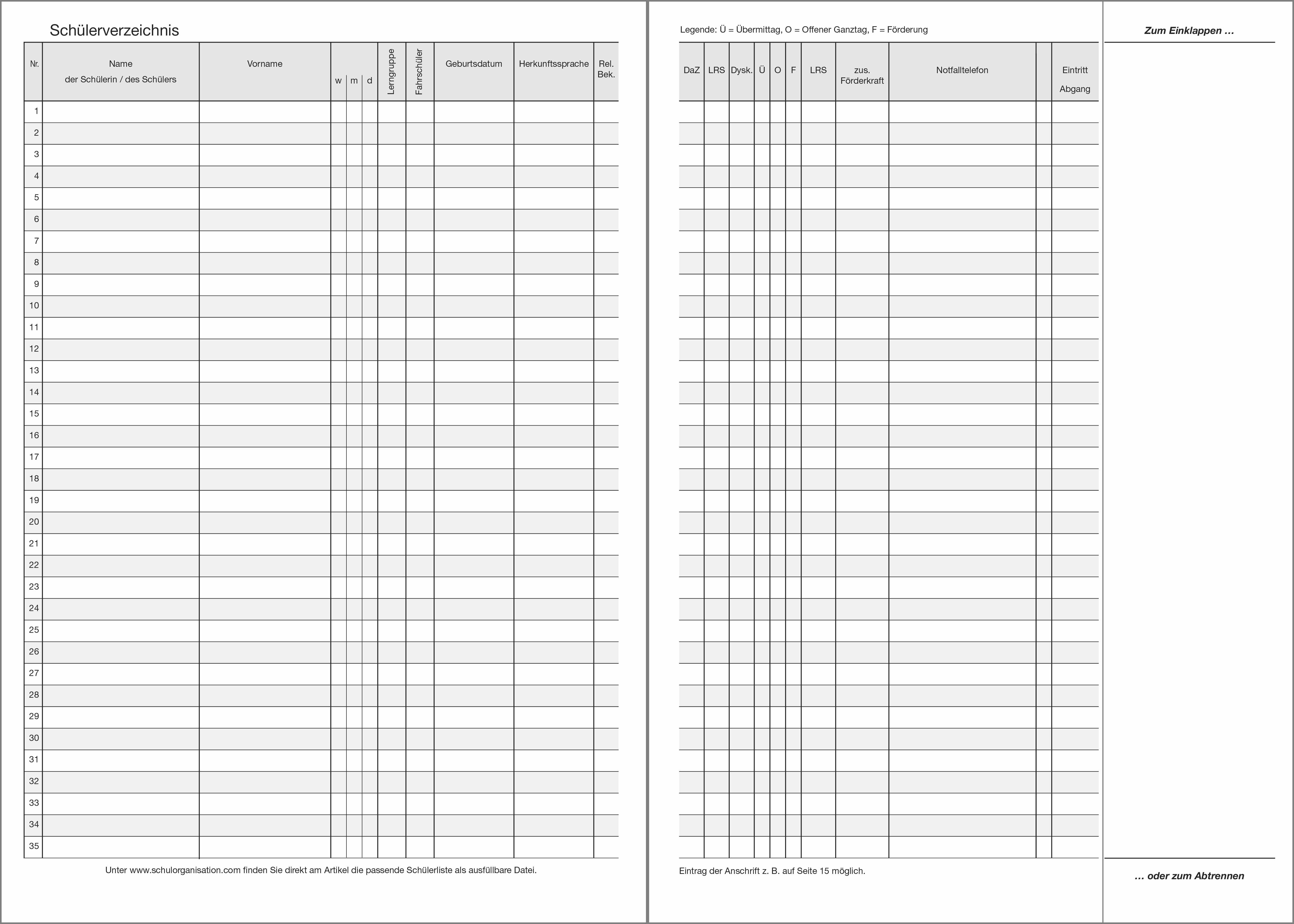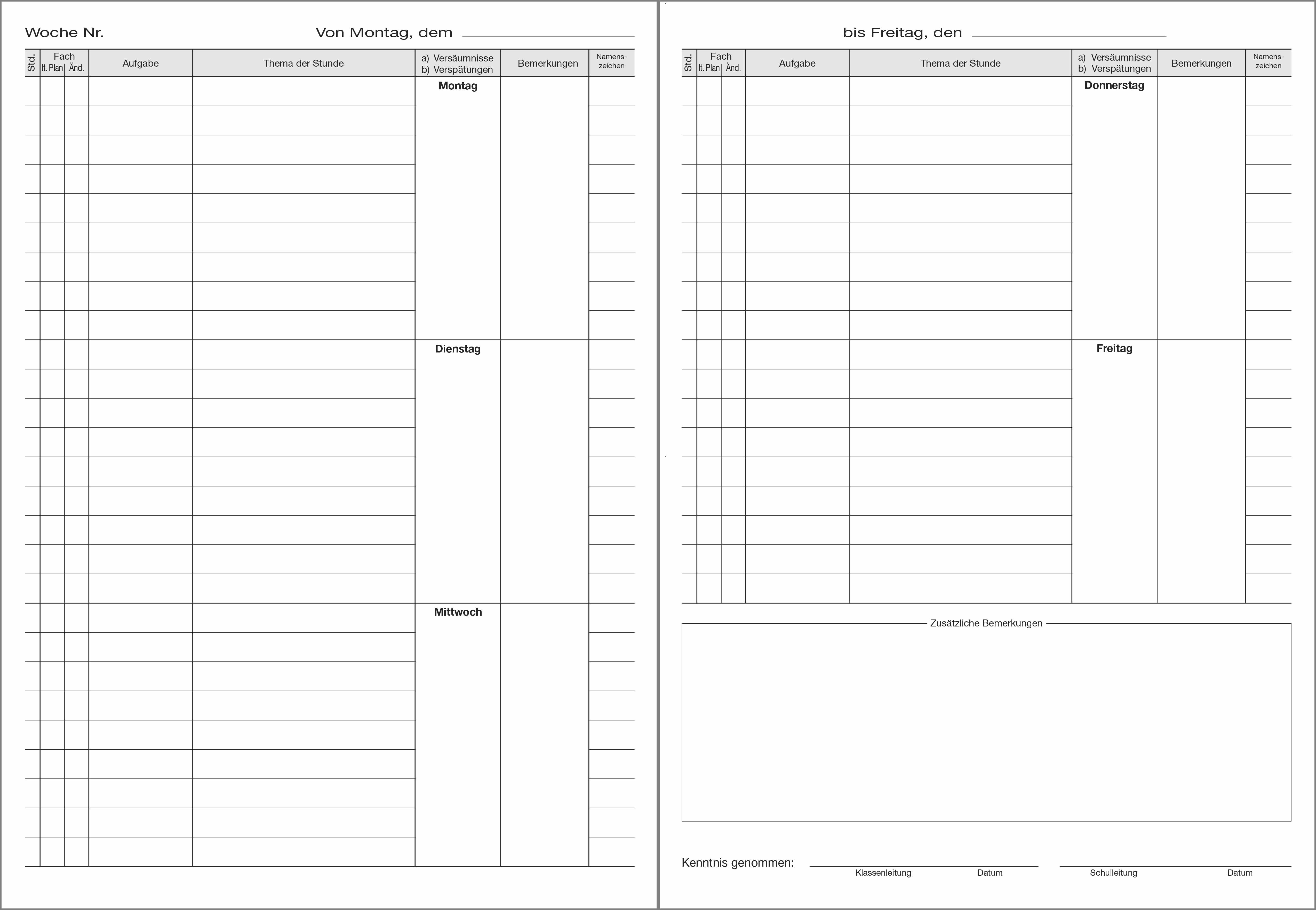 Klassenbuch mit ausführlichem Schülerverzeichnis, Seiten zu den Erziehungsberechtigten (auch mit Rücksprachefeldern), Unterrichtsbefreiungen, Förderbericht und vieles mehr, Ergebnisse der schriftlichen und sonstigen Leistungen, Klassenämter, monatlichen Versäumnislisten und Seiten für den Unterrichtsbericht von Montag bis Freitag (stundenweise) für ein Schuljahr. Weitere Listen werden in aller Regel nicht benötigt. Für Grundschulen empfohlen.