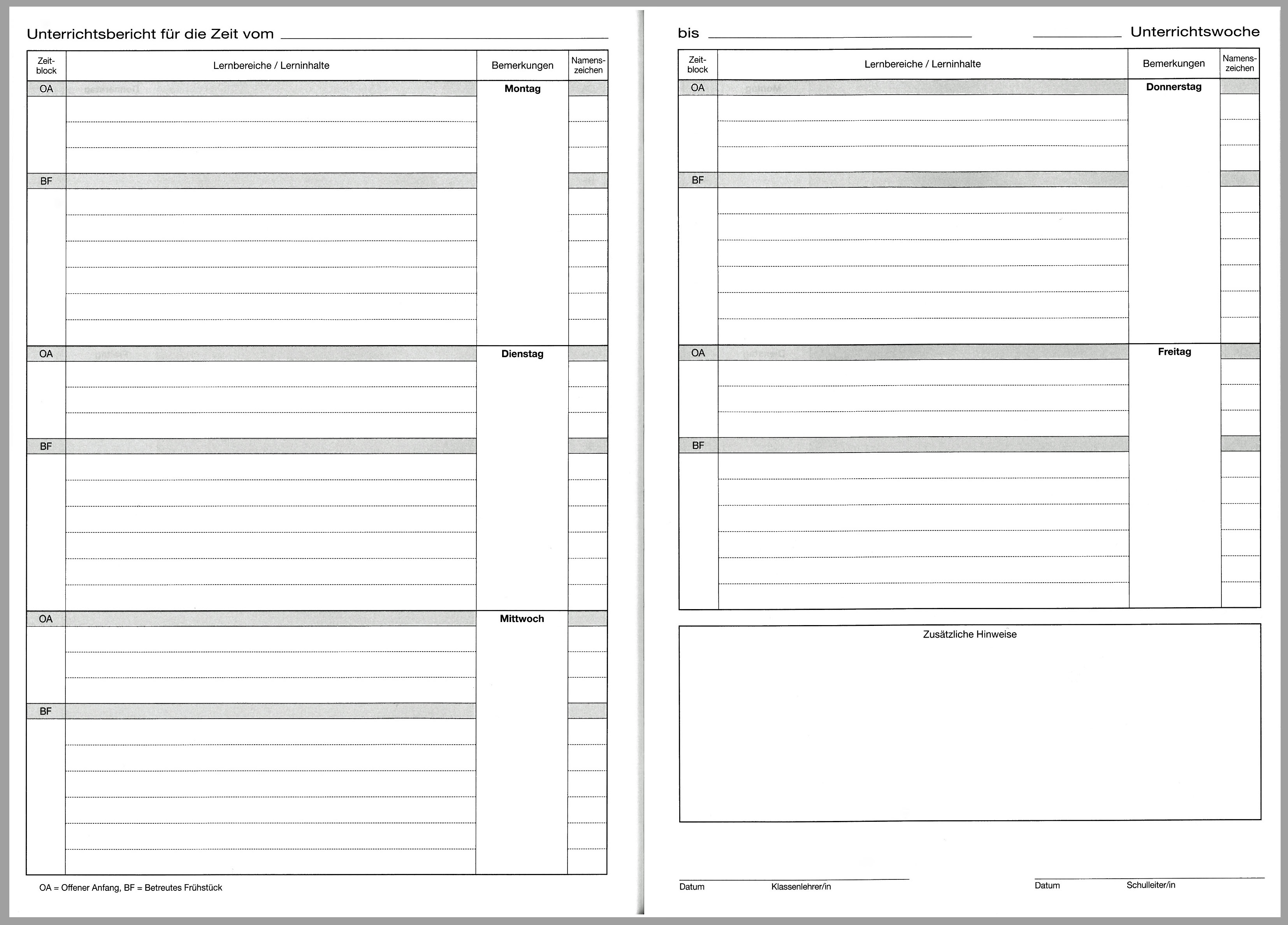 Klassenbuch speziell für die volle Halbtagsgrundschule, fest gebundene Ausführung mit Teileinheiten für Schülerdaten / Ergebnislisten, Versäumnislisten und Unterrichtsberichten, wie die LoseBlatt Ausführung, für Grundschulen Rheinland-Pfalz.