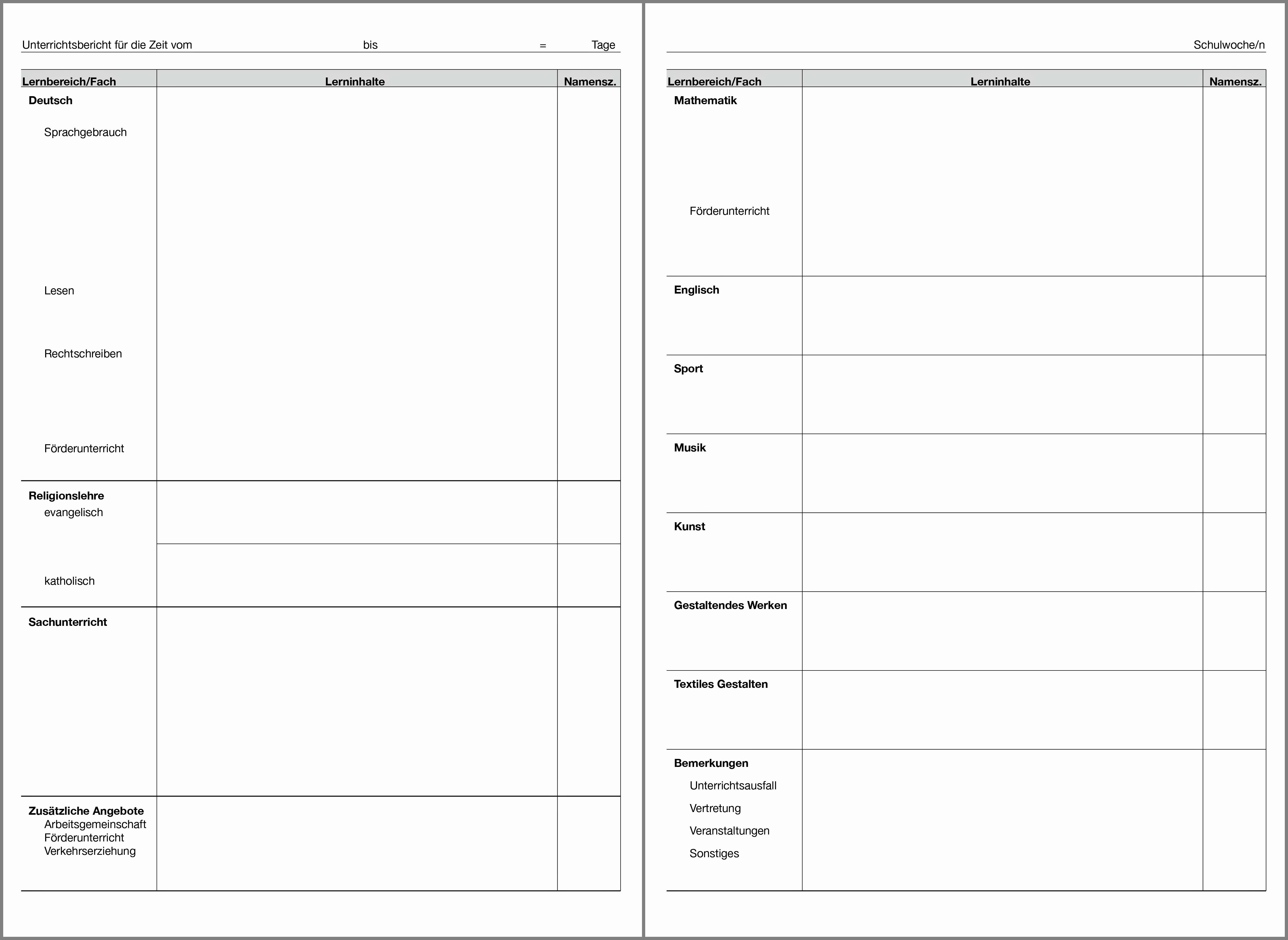 Unterrichtsbericht von Montag bis Freitag (wochenweise) für ein Schuljahr.