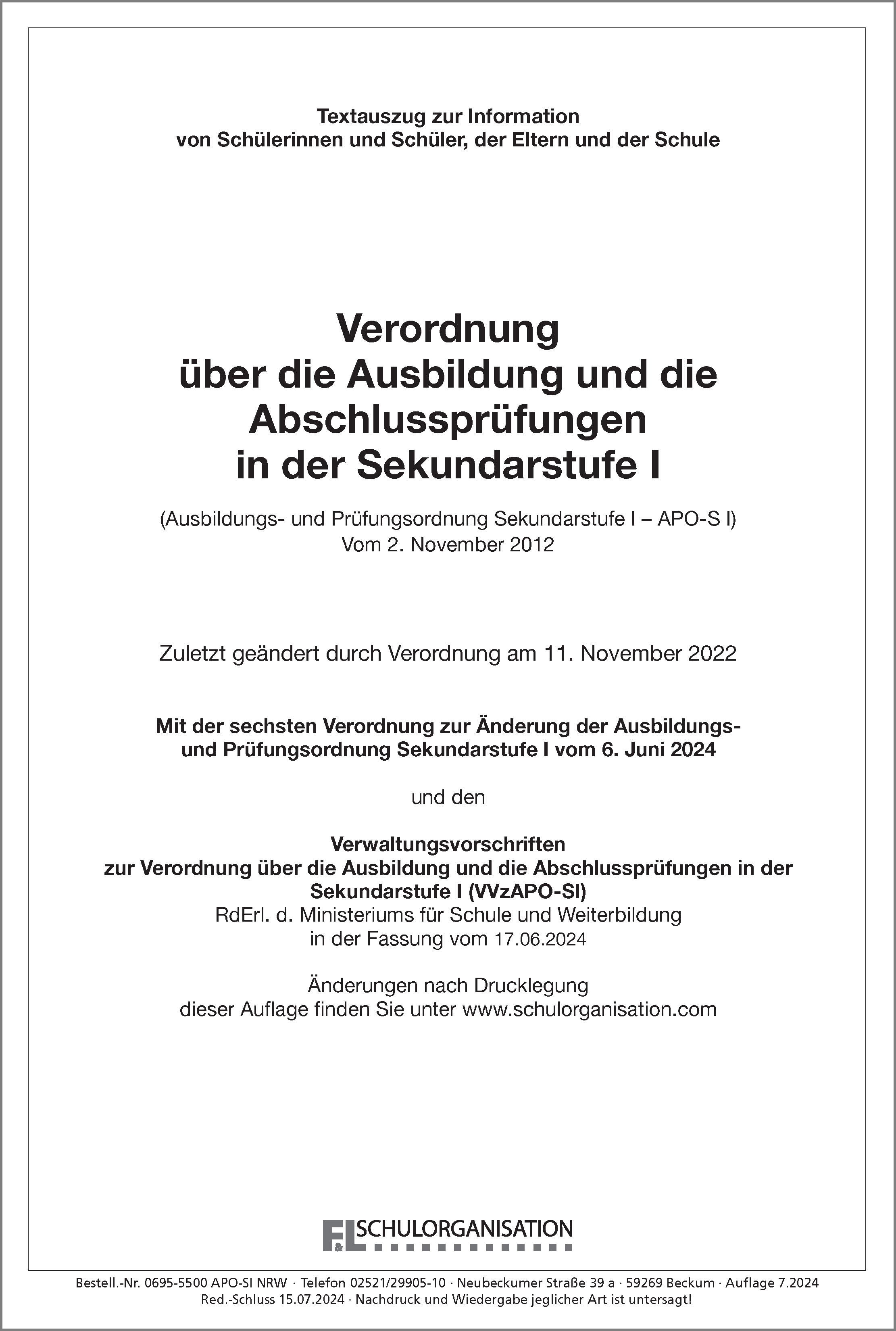 Verordnung über die Ausbildung und die Abschlussprüfungen in der Sekundarstufe I (NRW), u.a. mit Bestimmungen für die Erprobungsstufe, den Bestimmungen für den Unterricht in den einzelnen Schulformen der Sekundarstufe I, den Versetzungsbestimmungen, dem Abschlussverfahren und den Abschlüssen und Berechtigungen. Mit den Verwaltungsvorschriften zur APO-SI. Mit den Stundentafeln gültig ab 01.08.2022 der Schulformen der Sekundarstufe I.Zuletzt geändert durch Verordnung vom 06. Juni 2024 und vom 17. 06. 2024 für die Verwaltungsvorschriften.