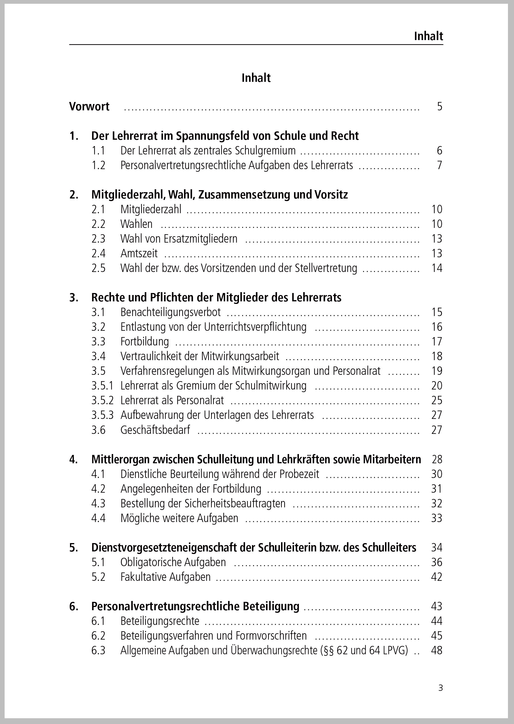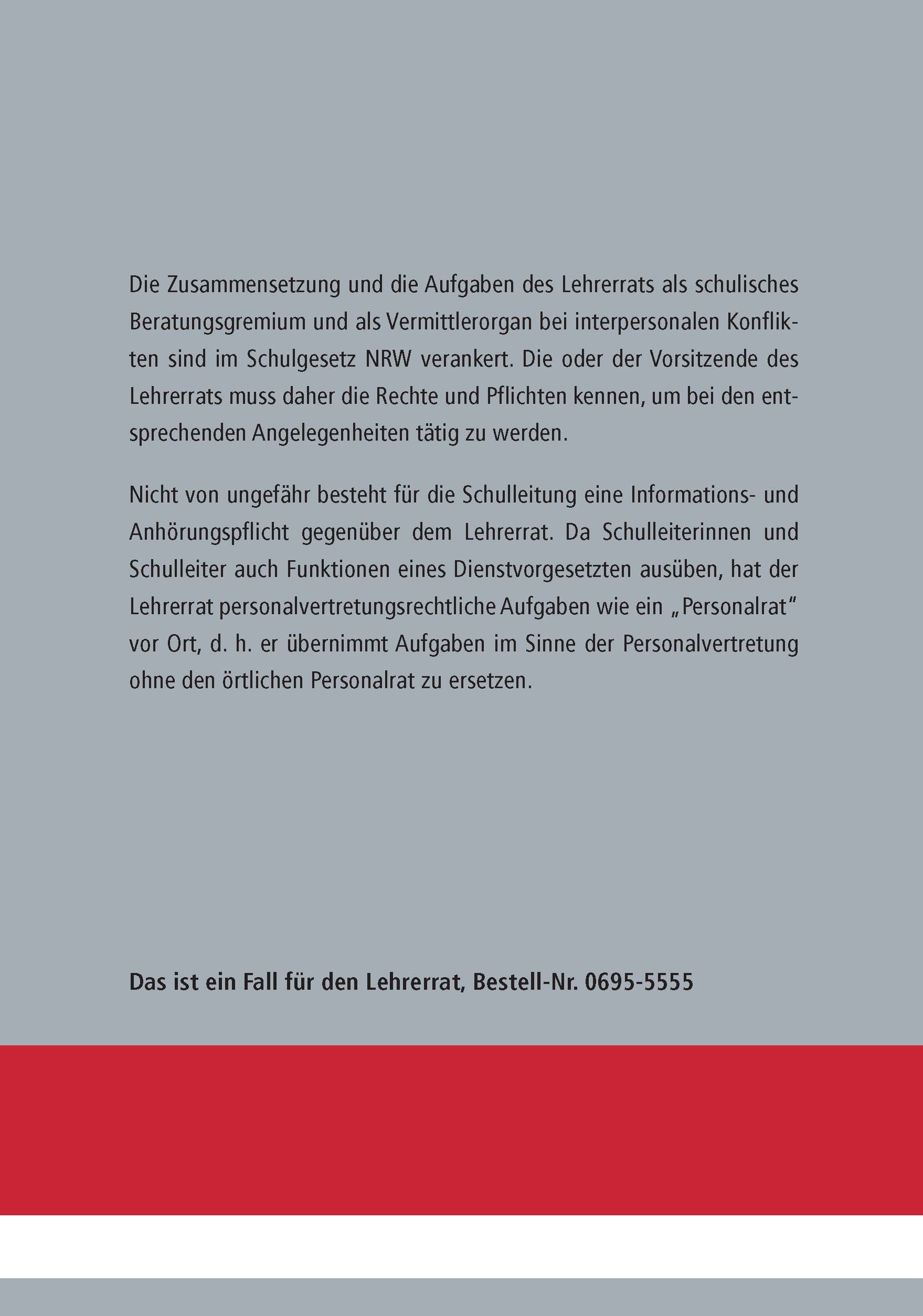 Da der Schulleitung die Entscheidung über dienstrechtliche Angelegenheiten übertragen ist, hat der Lehrerrat in diesen Fällen Aufgaben wie ein Personalrat vor Ort, d.h. er übernimmt Aufgaben im Sinne der Personalvertretung ohne den örtlichen Personalrat zu ersetzen. Mit ausführlichem Stichwortverzeichnis.
